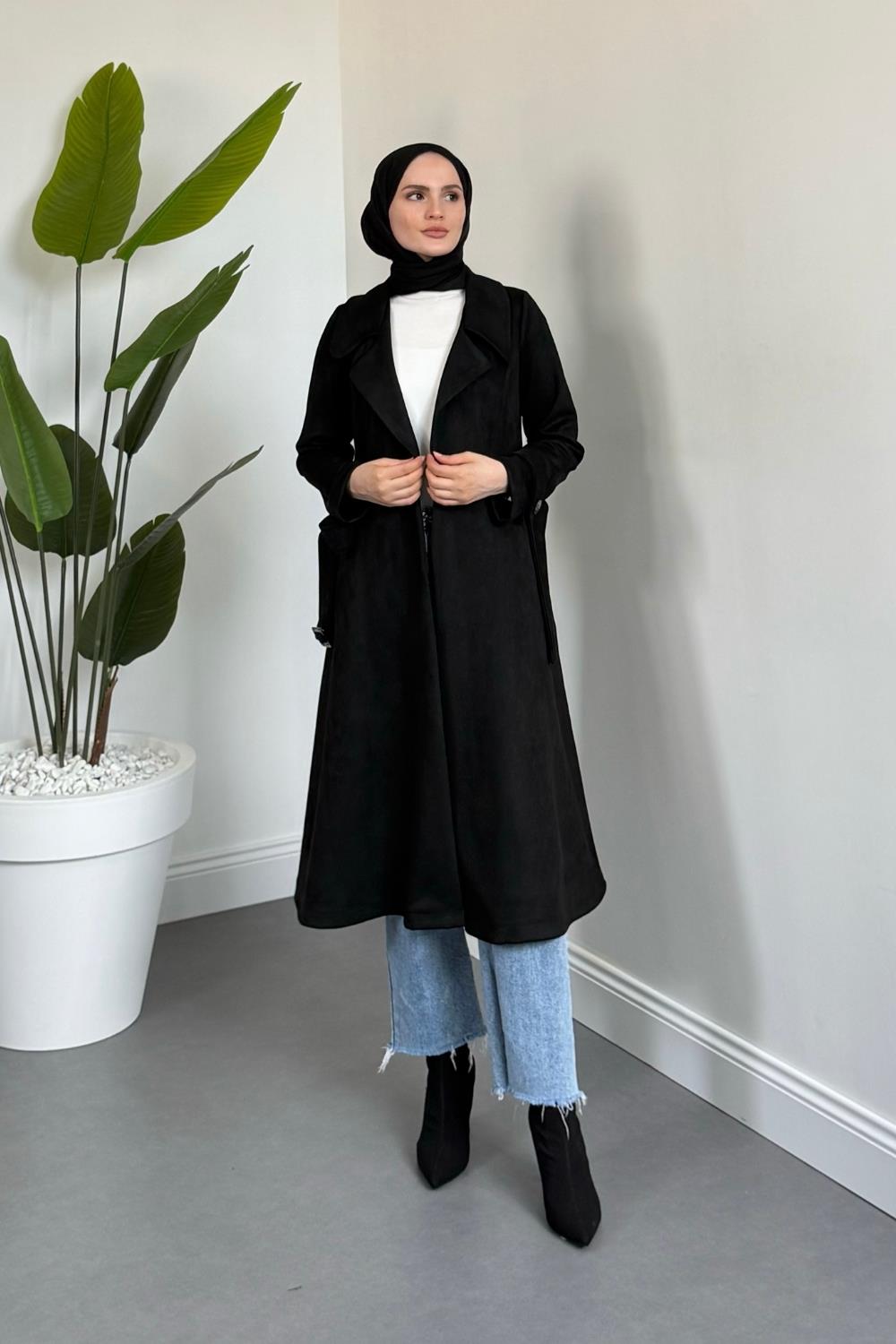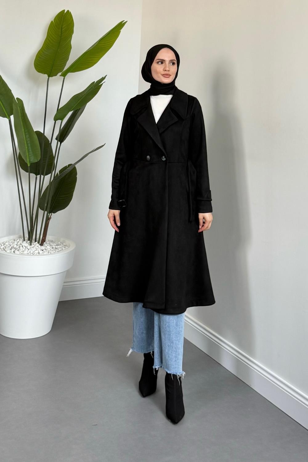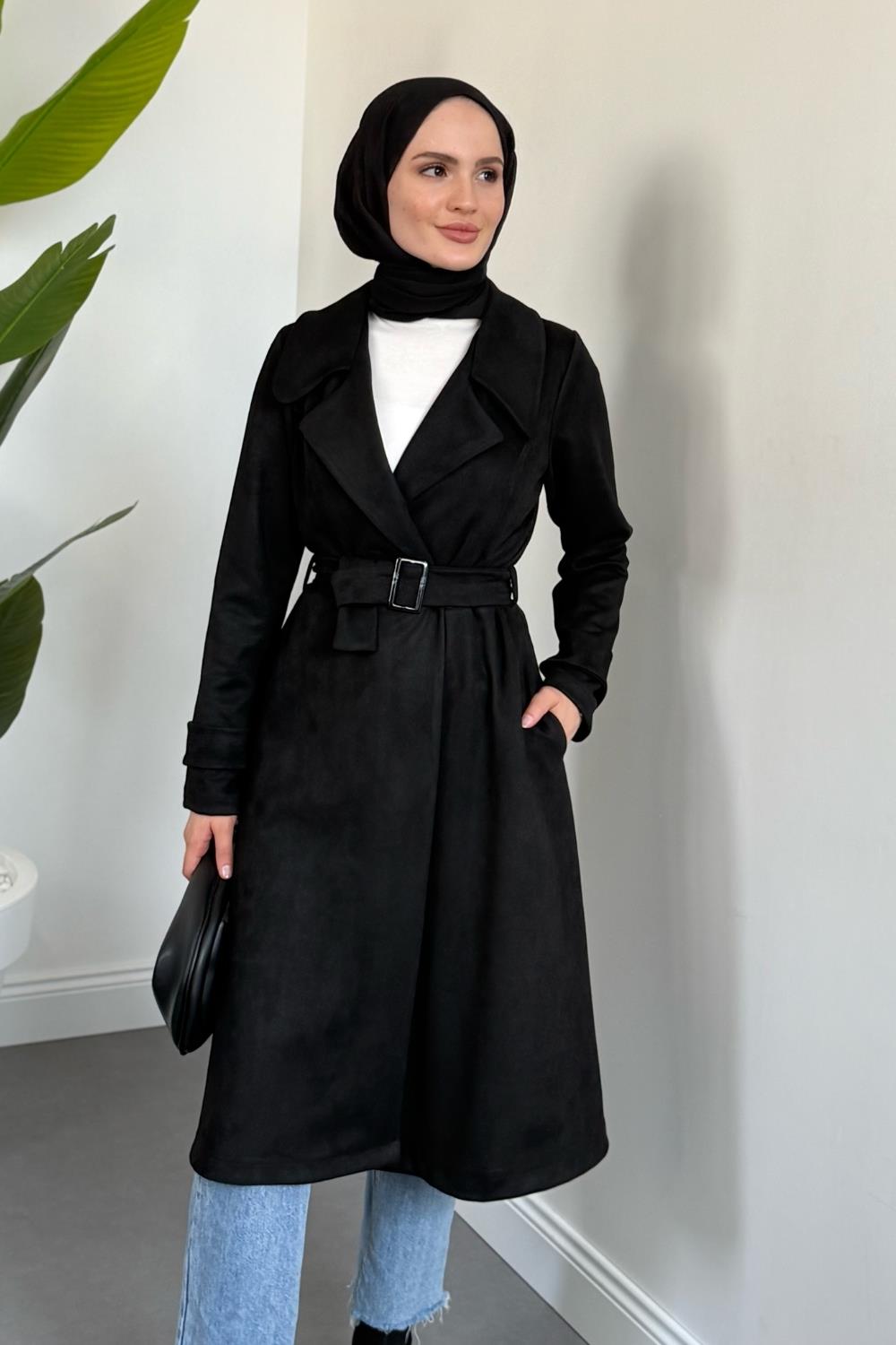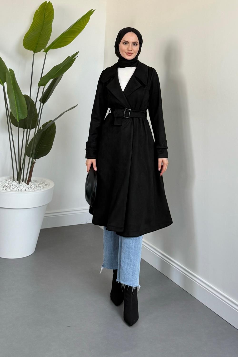 Veyora Nubuk Kemerli Kaban Siyah