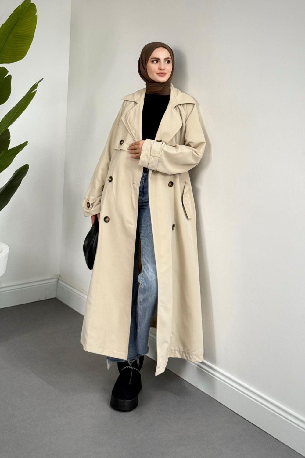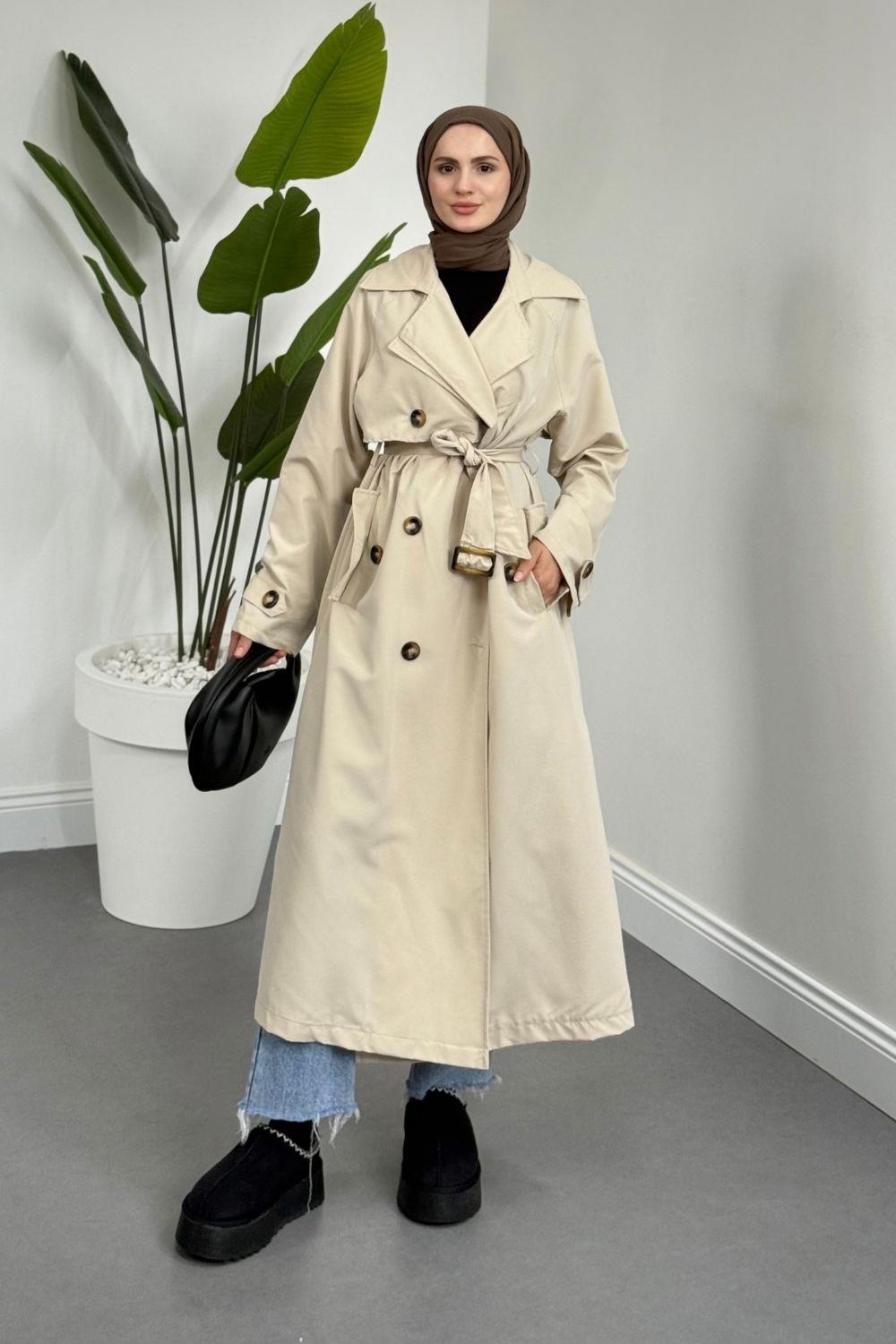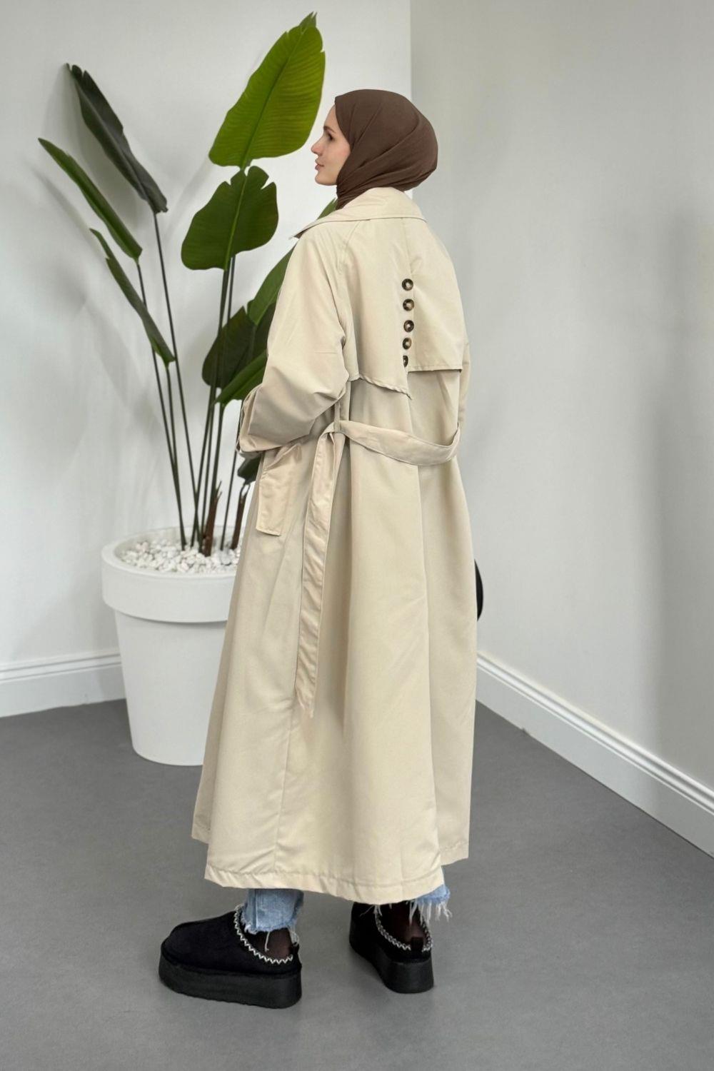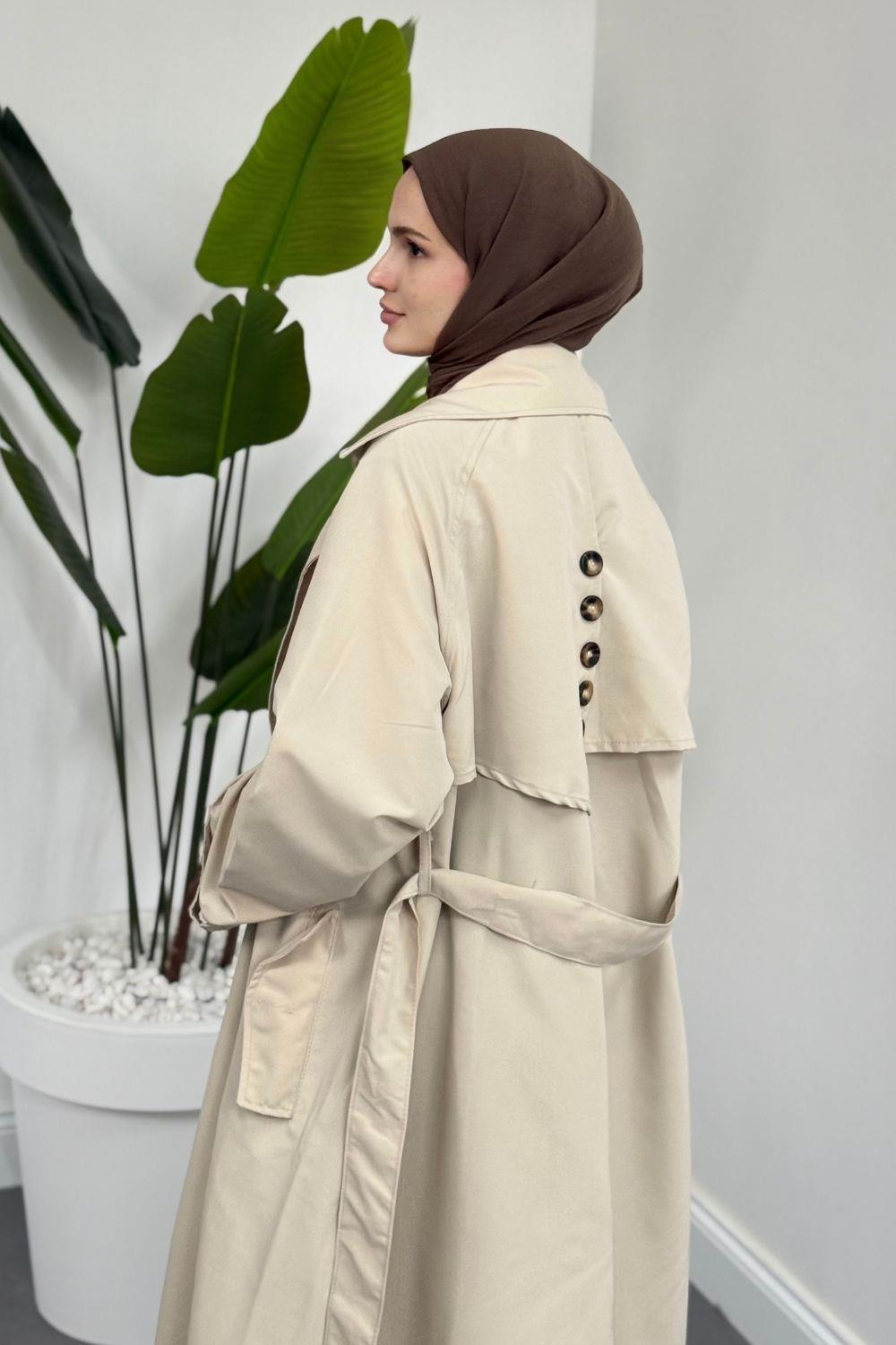 Mayi Arkası Pelerinli Düğmeli Trençkot Bej