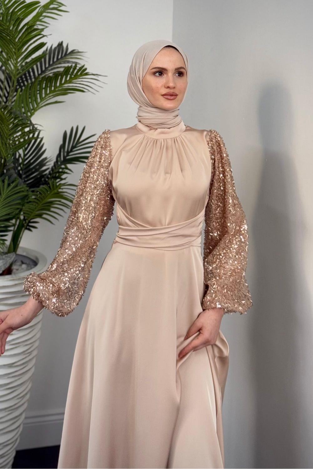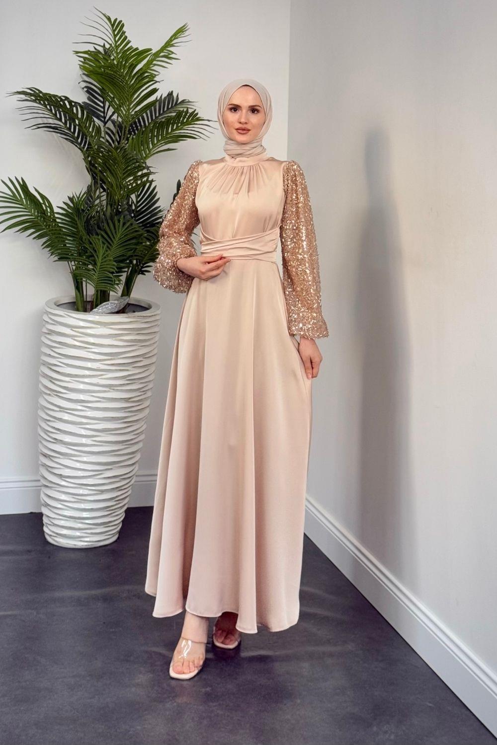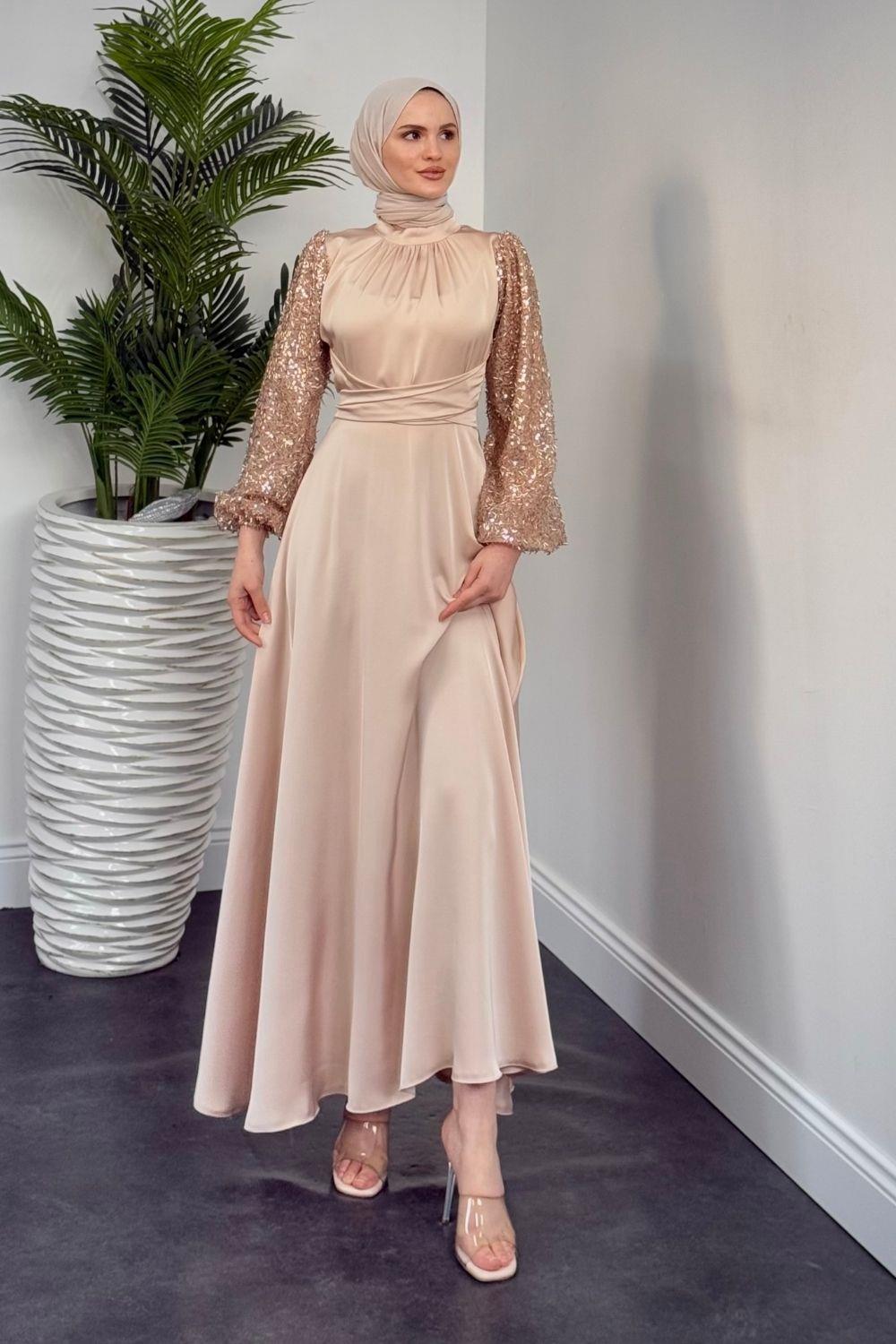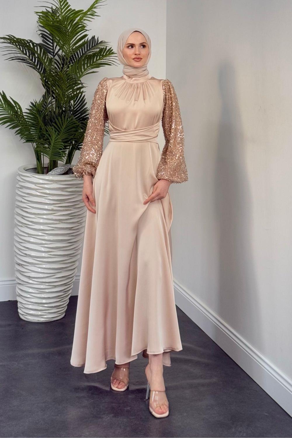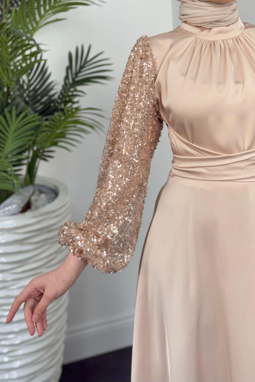 Hemeris Kolları Boncuk İşleme Saten Abiye Krem