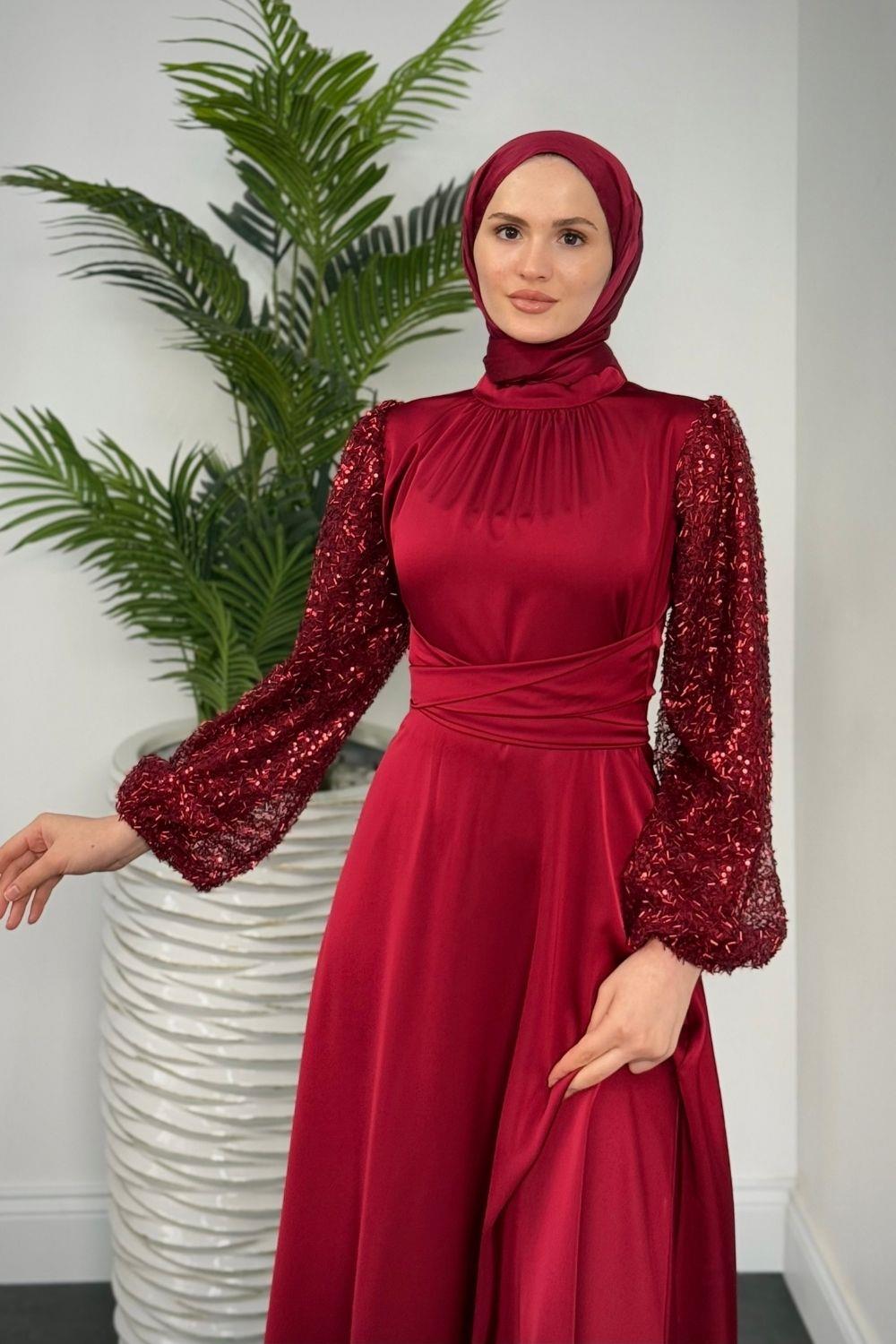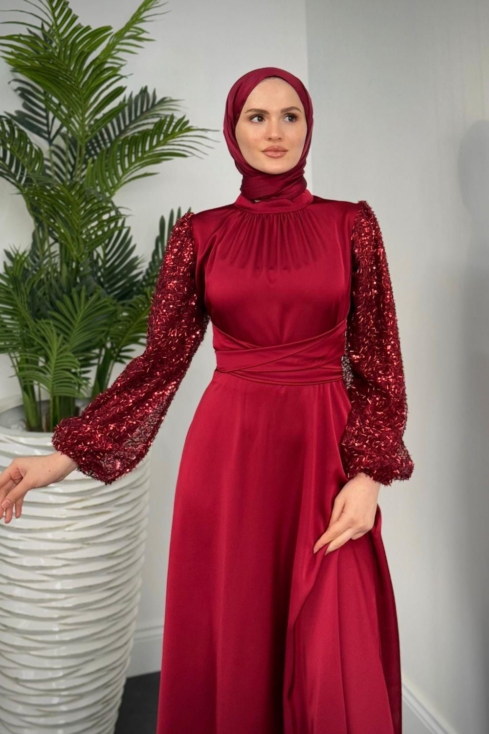 Hemeris Kolları Boncuk İşleme Saten Abiye Bordo