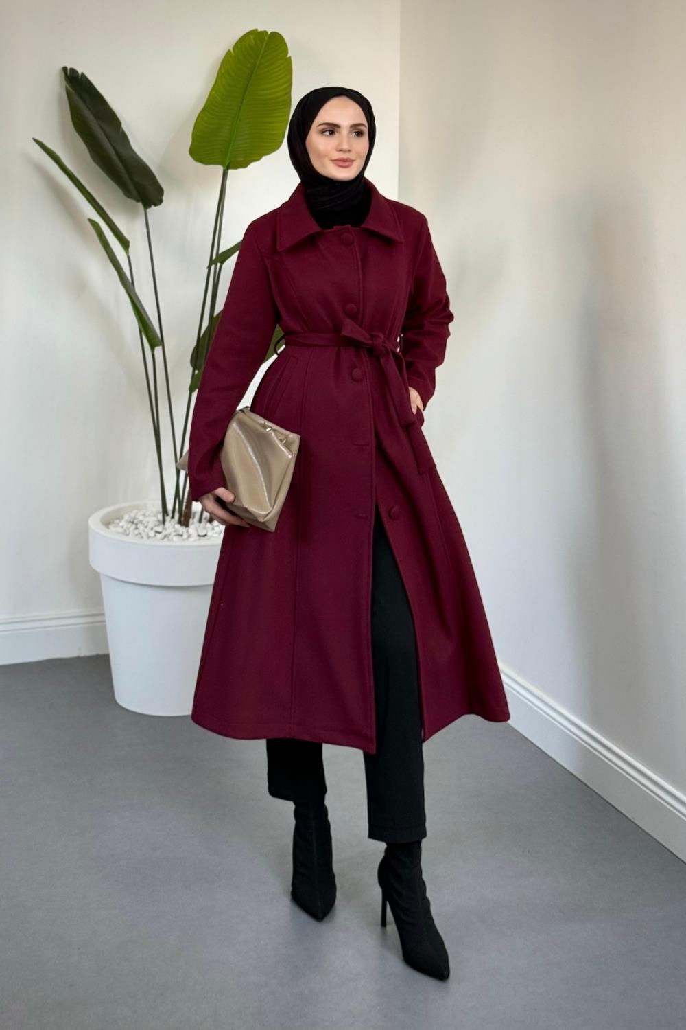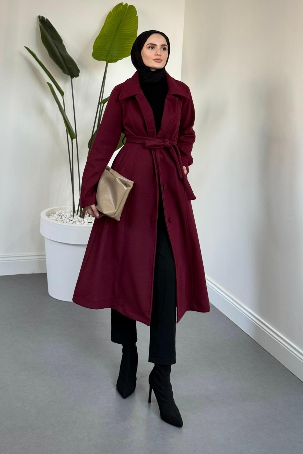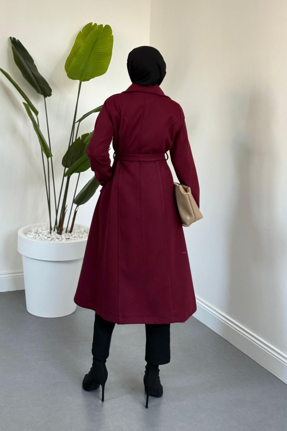 Evelyn Astarlı Düğmeli Kaşe Kaban Bordo