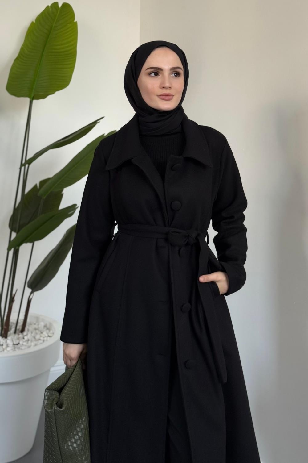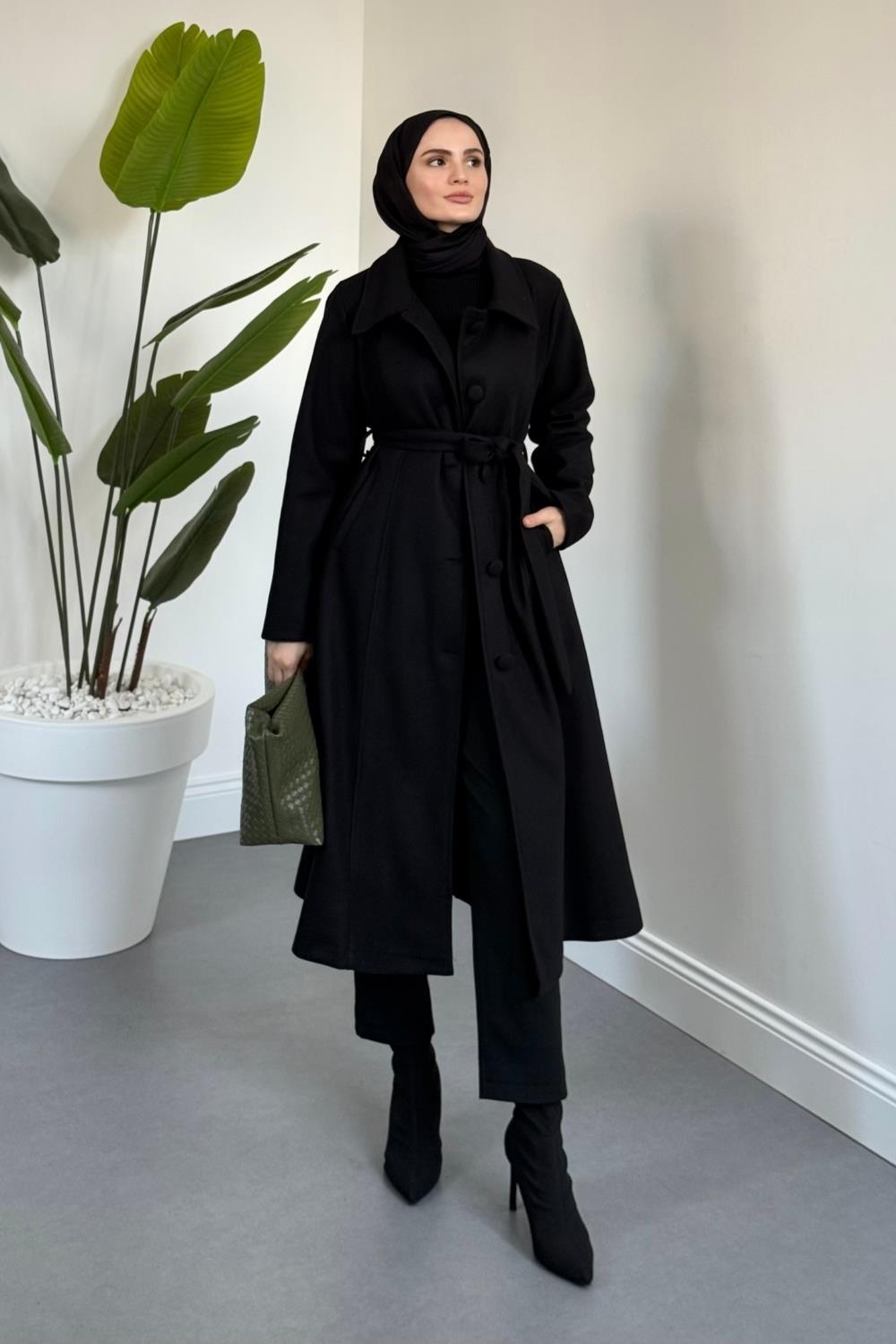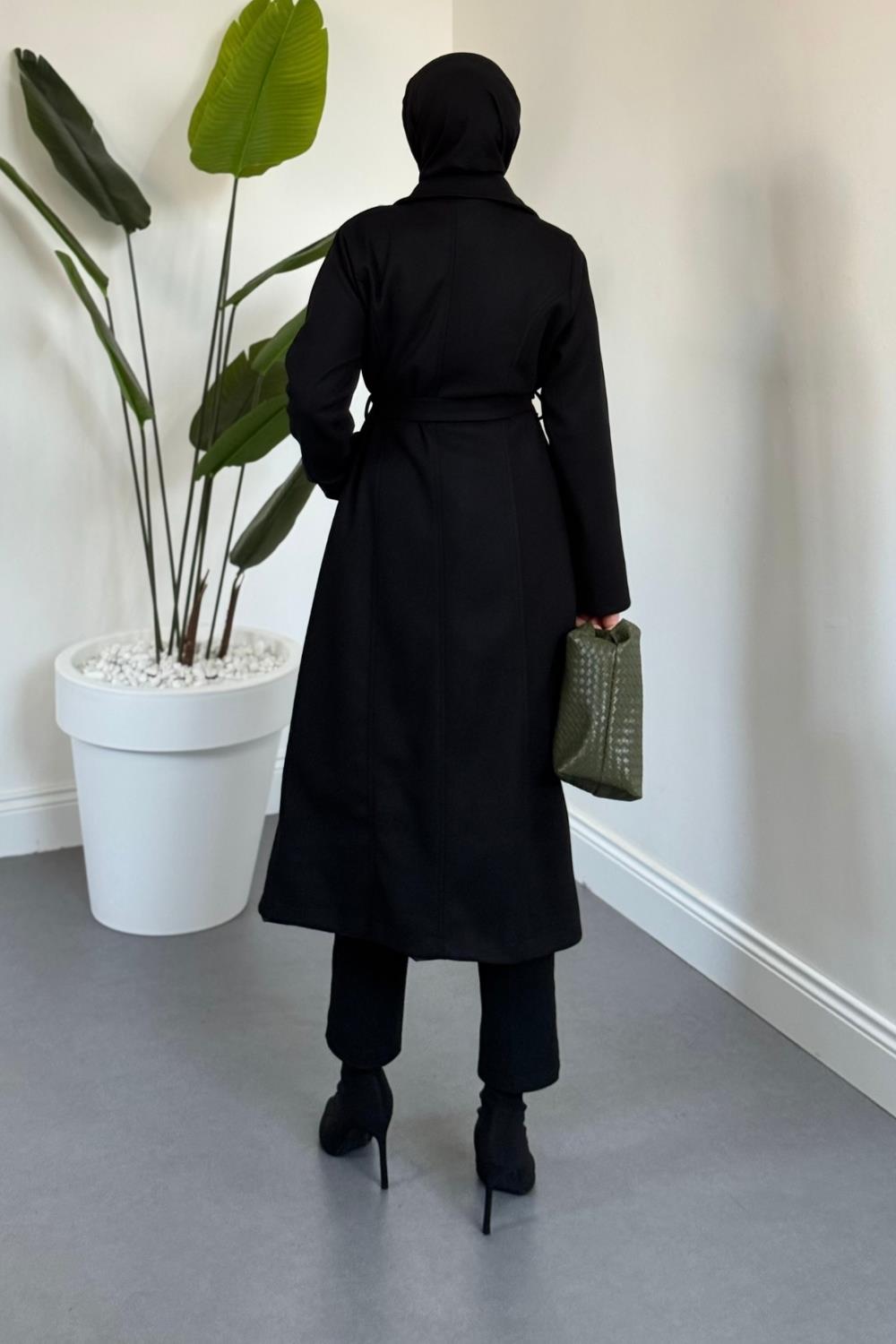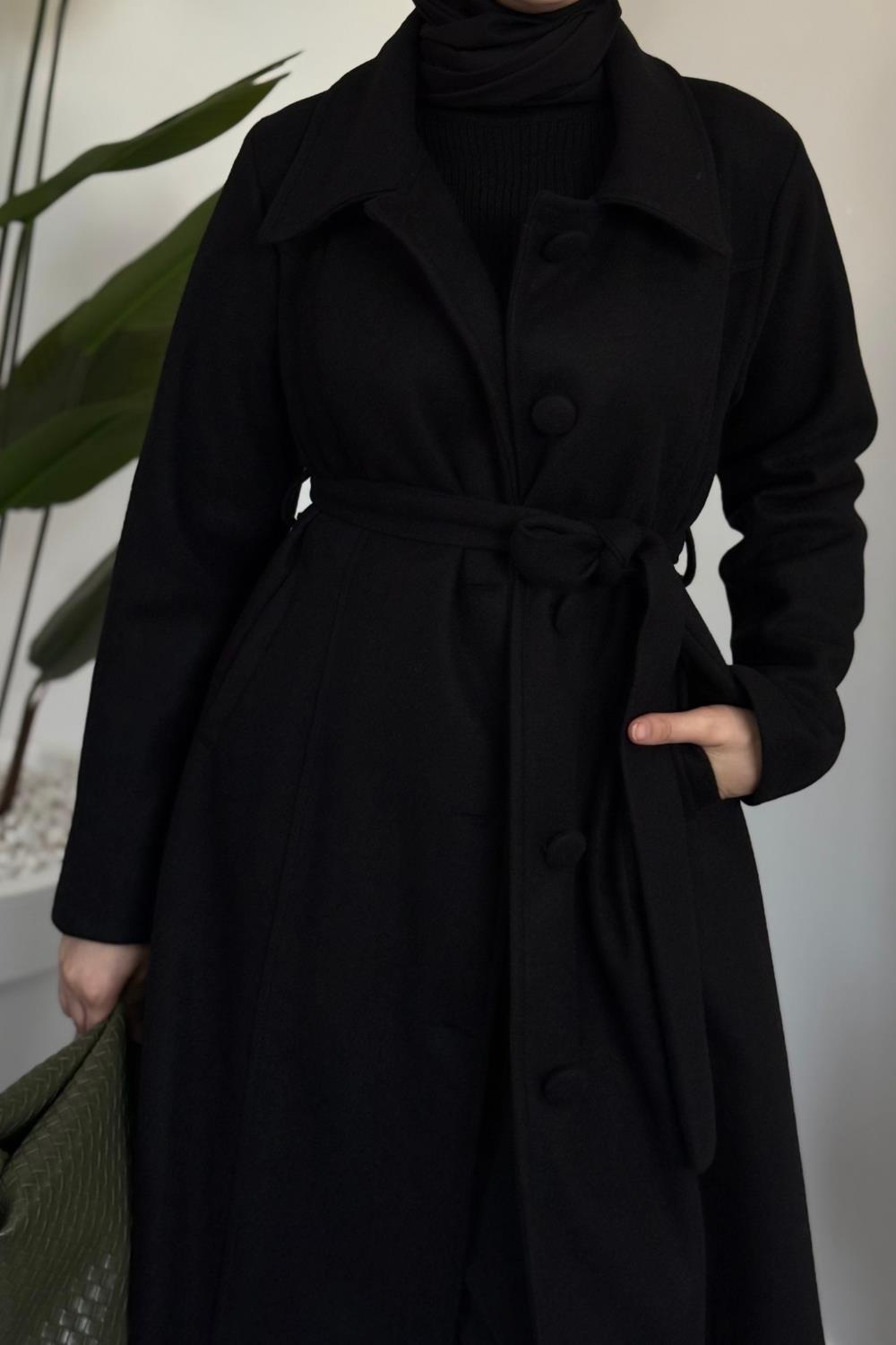 Evelyn Astarlı Düğmeli Kaşe Kaban Siyah
