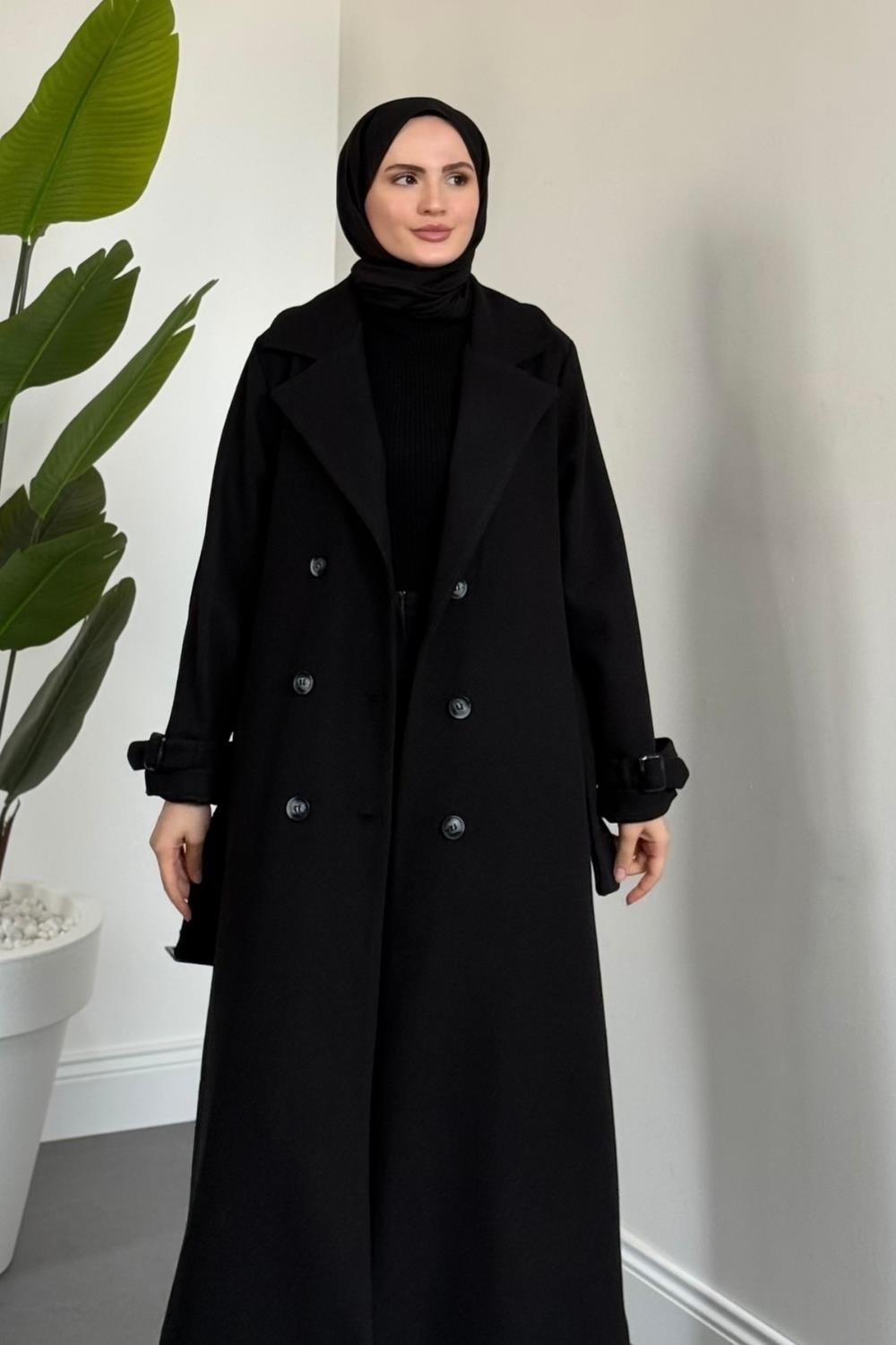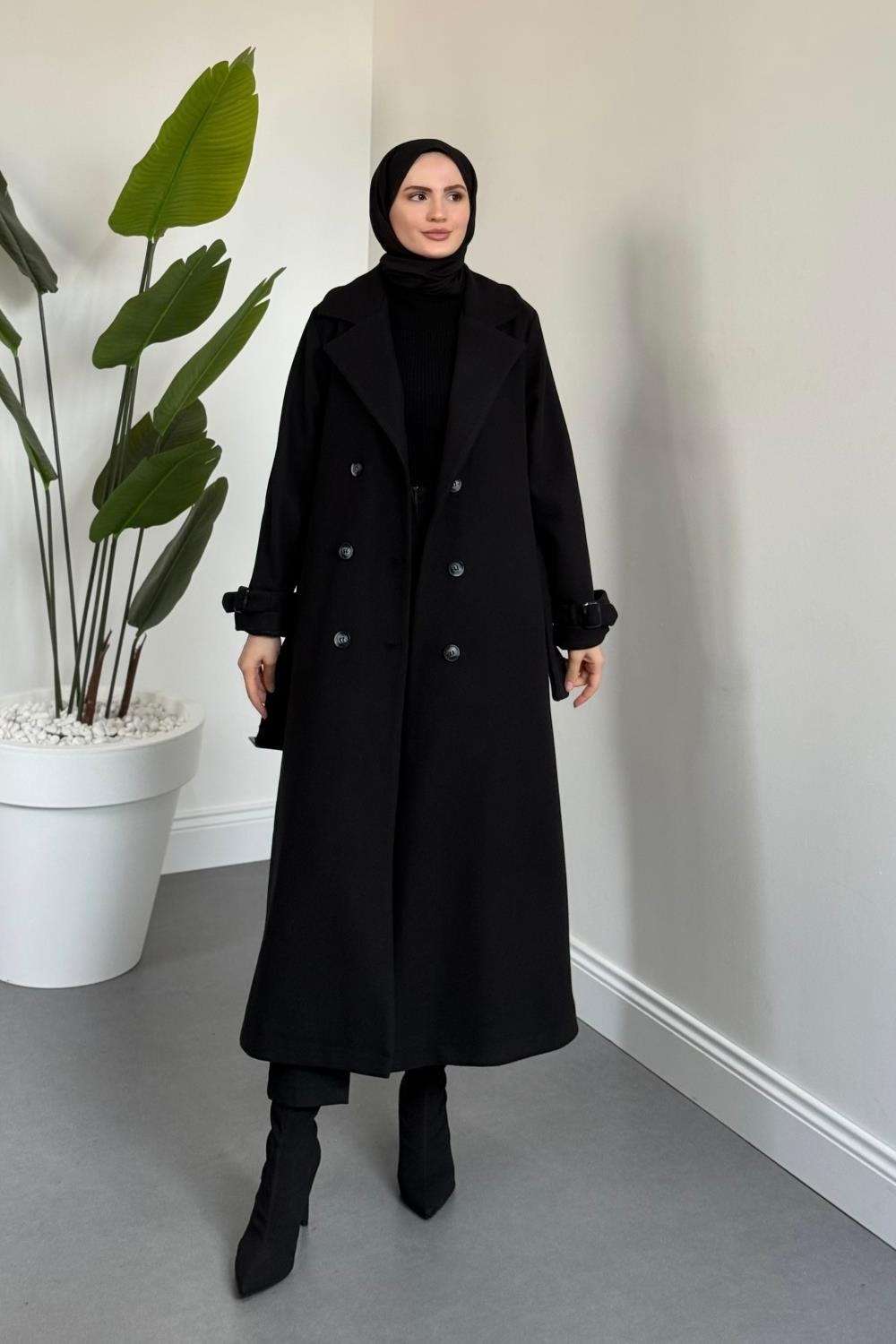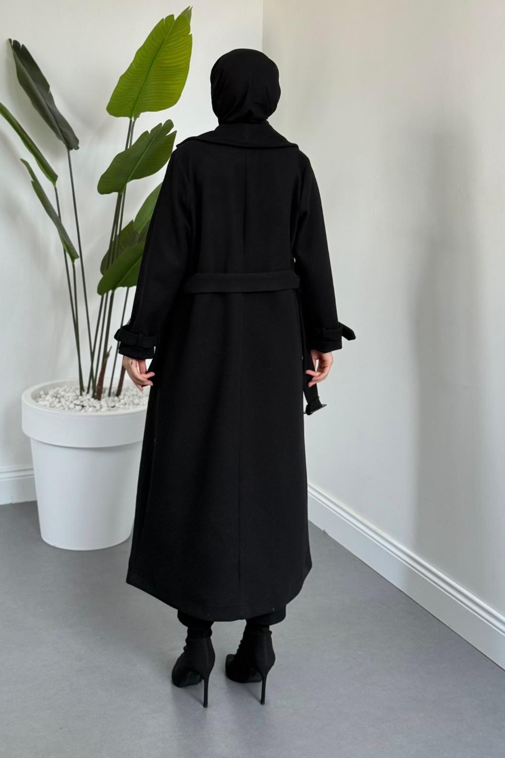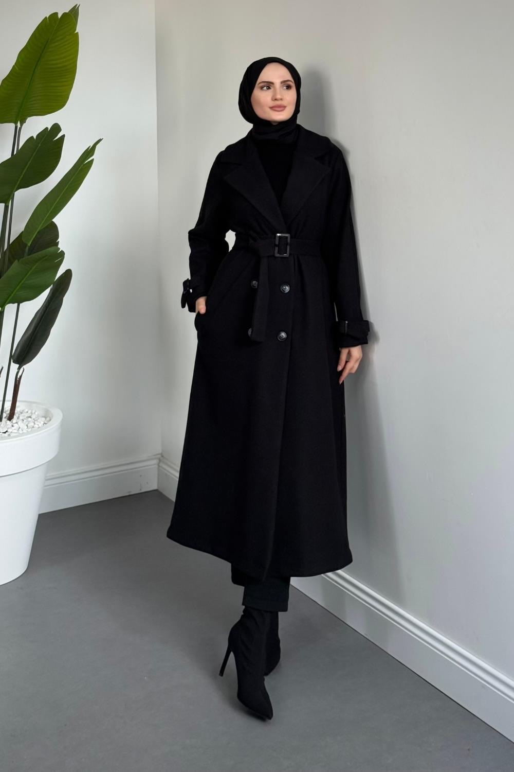 Eliane Astarlı Kemerli Kaşe Kaban Siyah