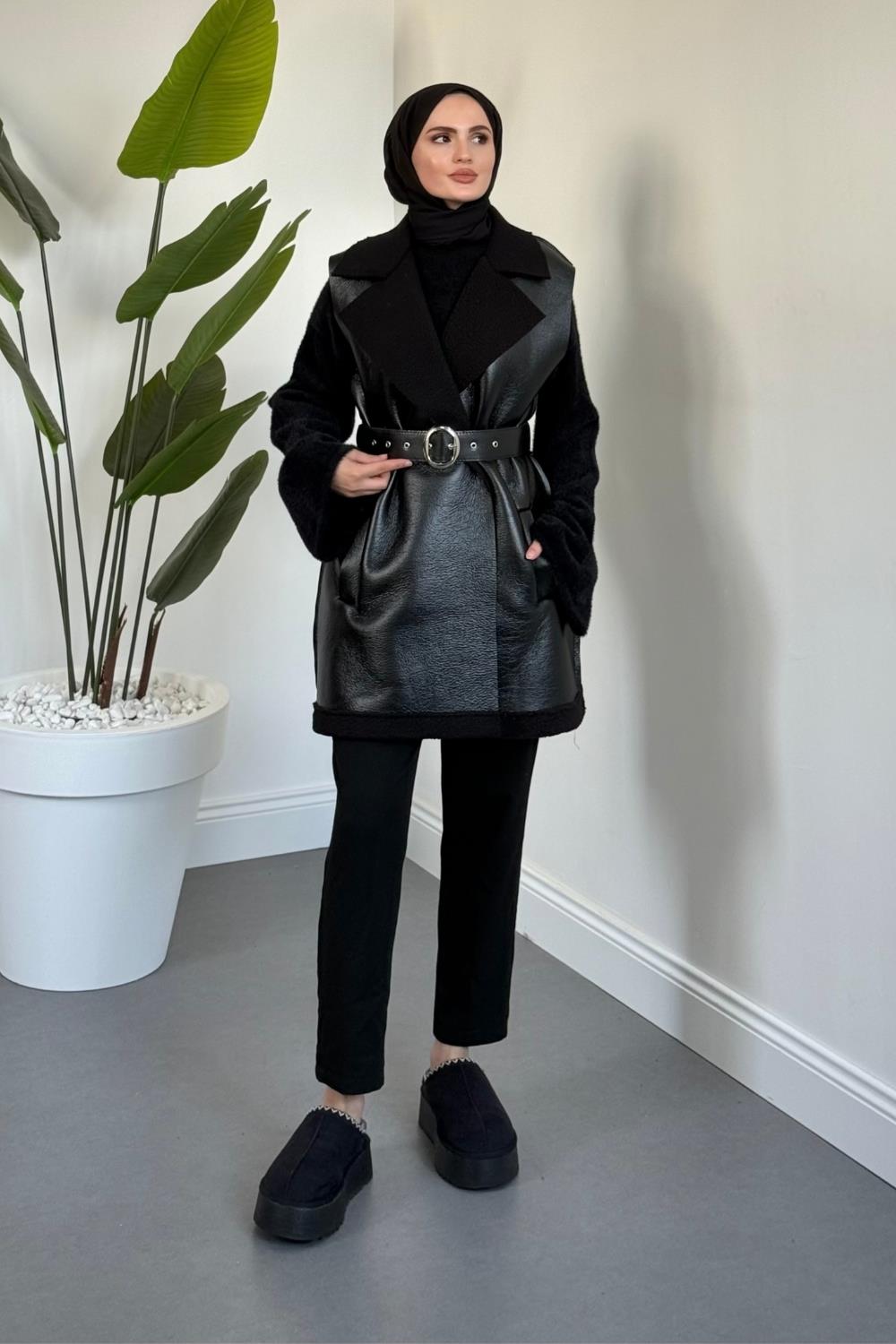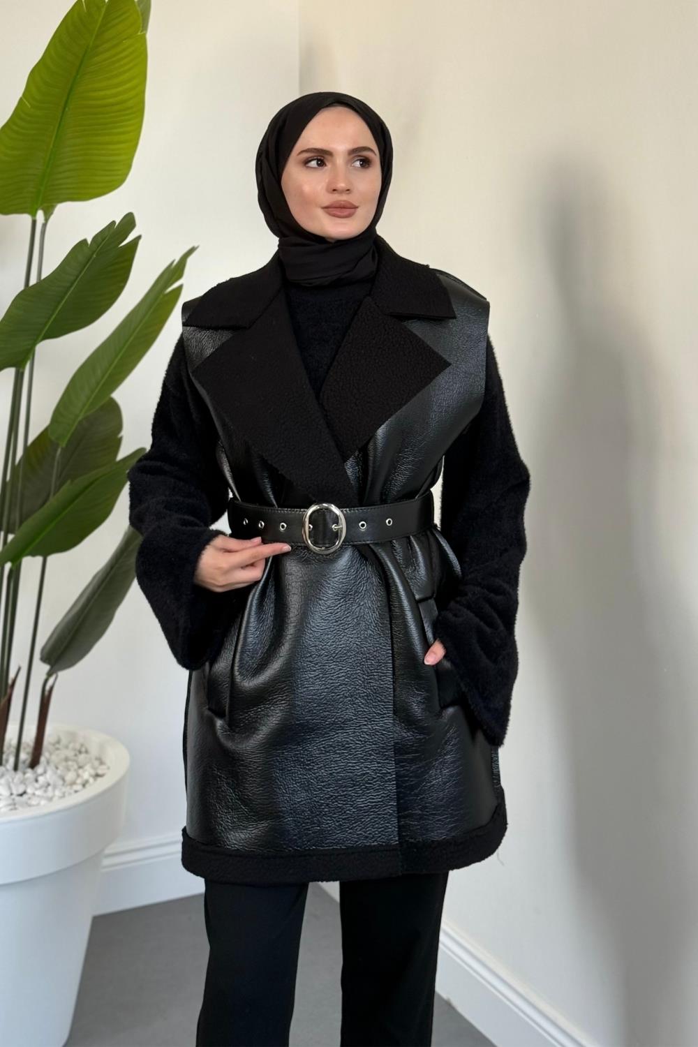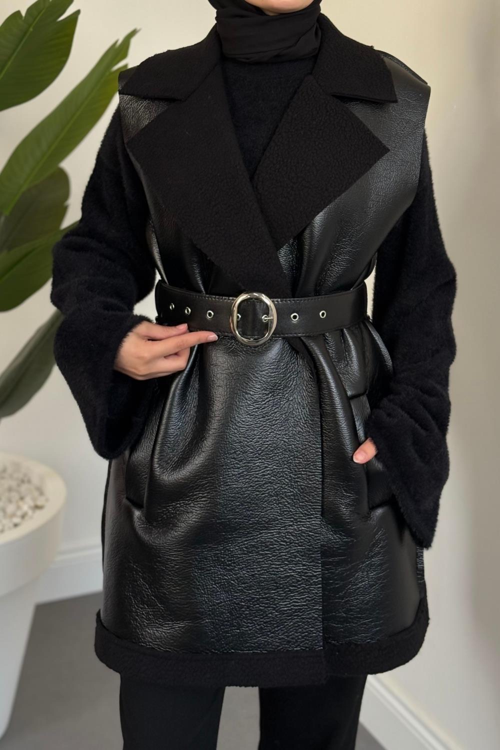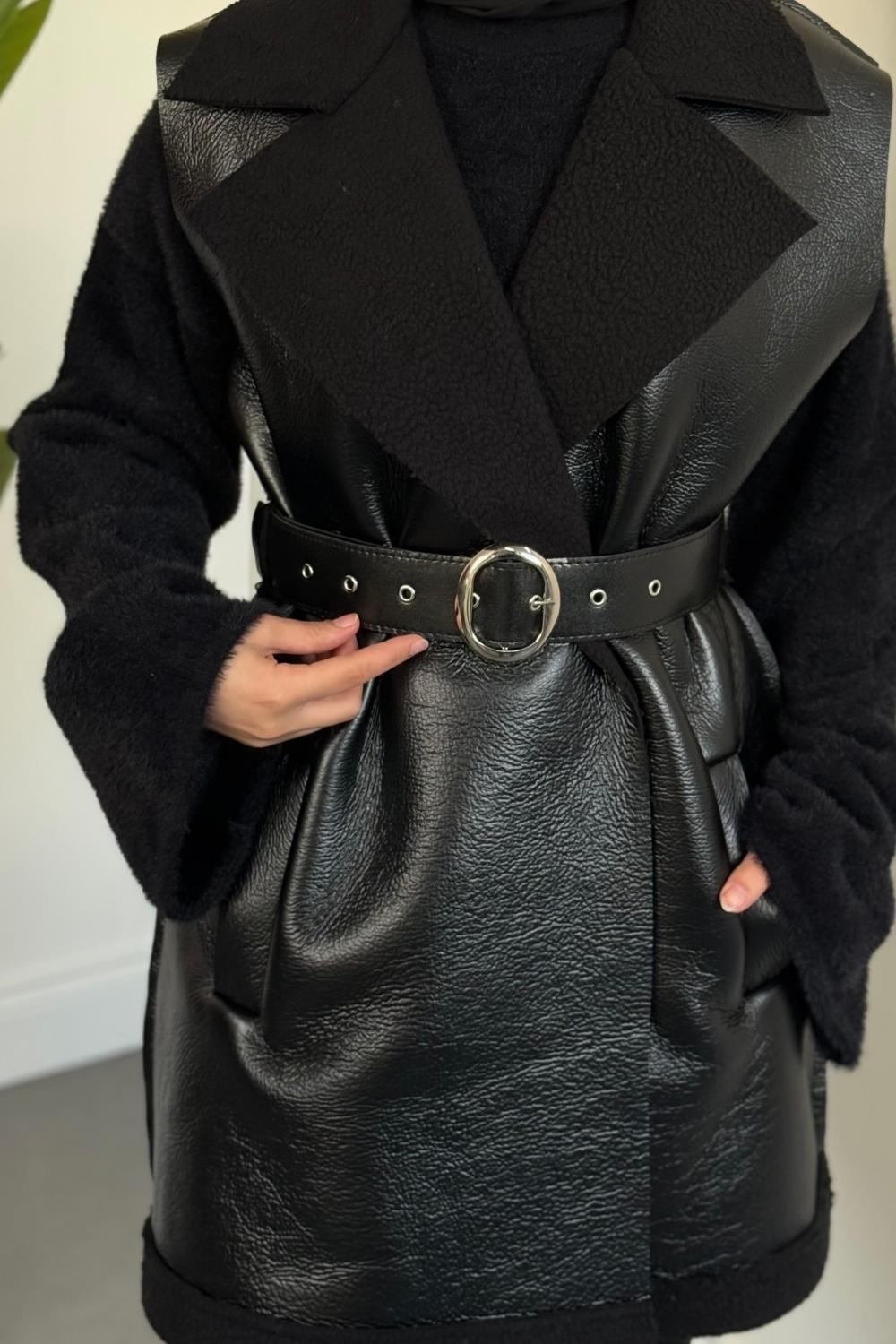 Amarila Deri Görünümlü Yelek Siyah