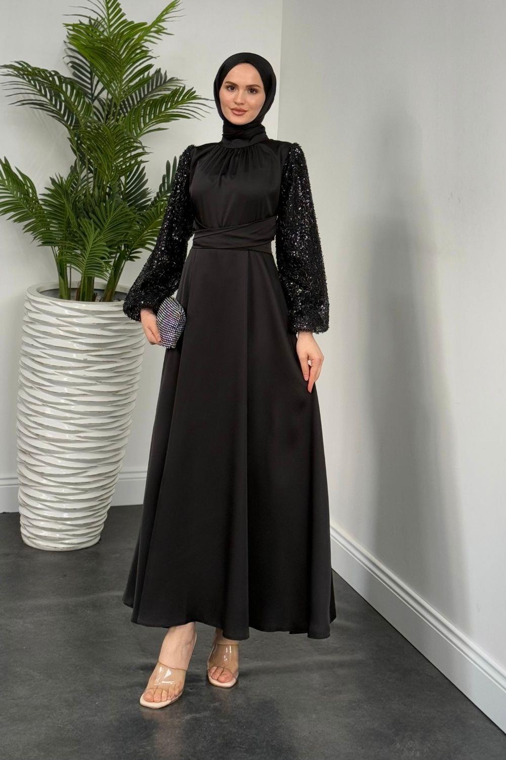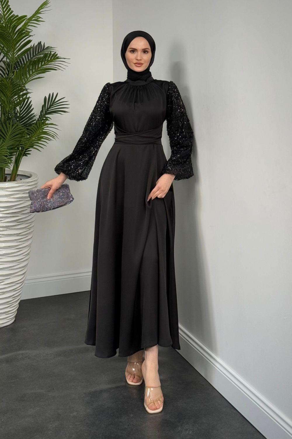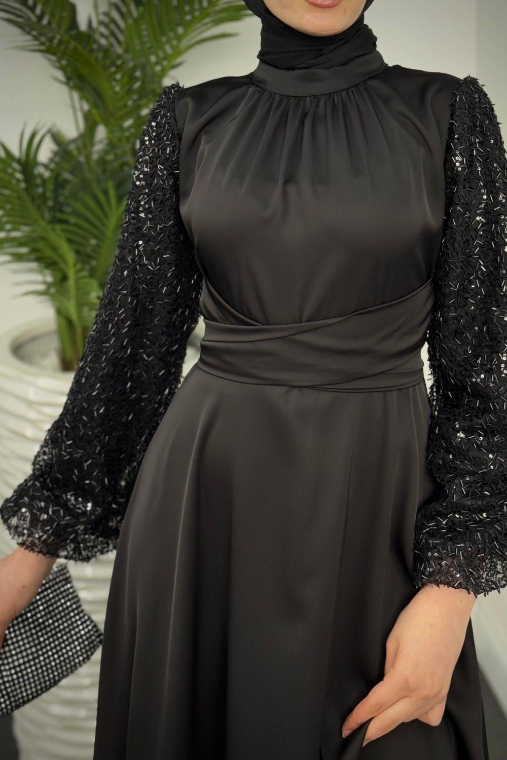 Hemeris Kolları Boncuk İşleme Saten Abiye Siyah