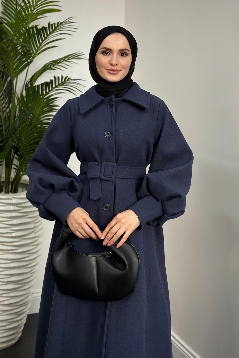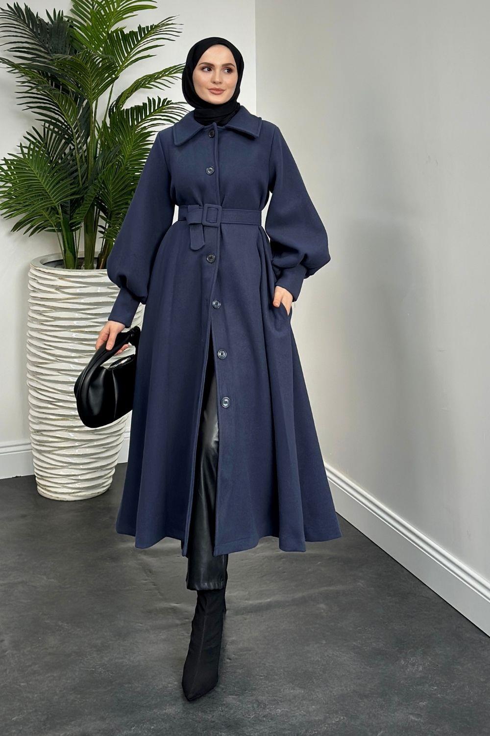 Valery Kolu Manşetli Kemerli Astarlı Kaşe Kaban İndigo