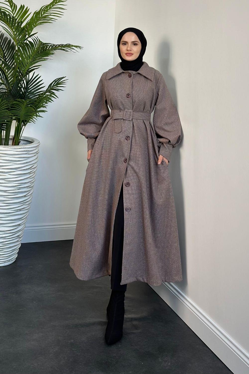 Victor Kolu Manşetli Kemerli Astarlı Kaşe Kaban Kahverengi