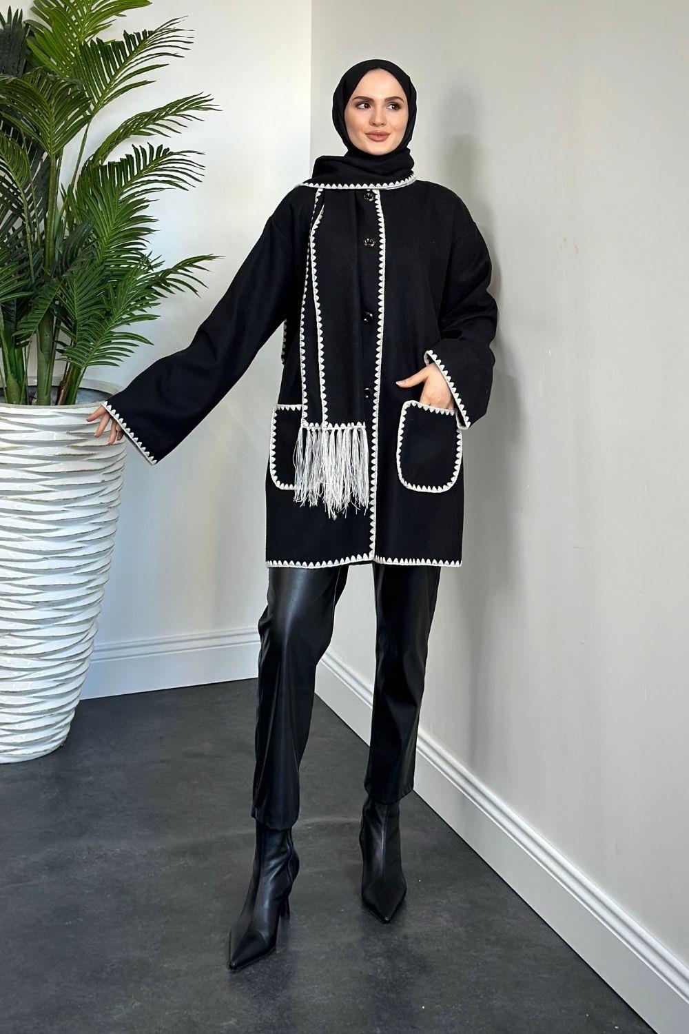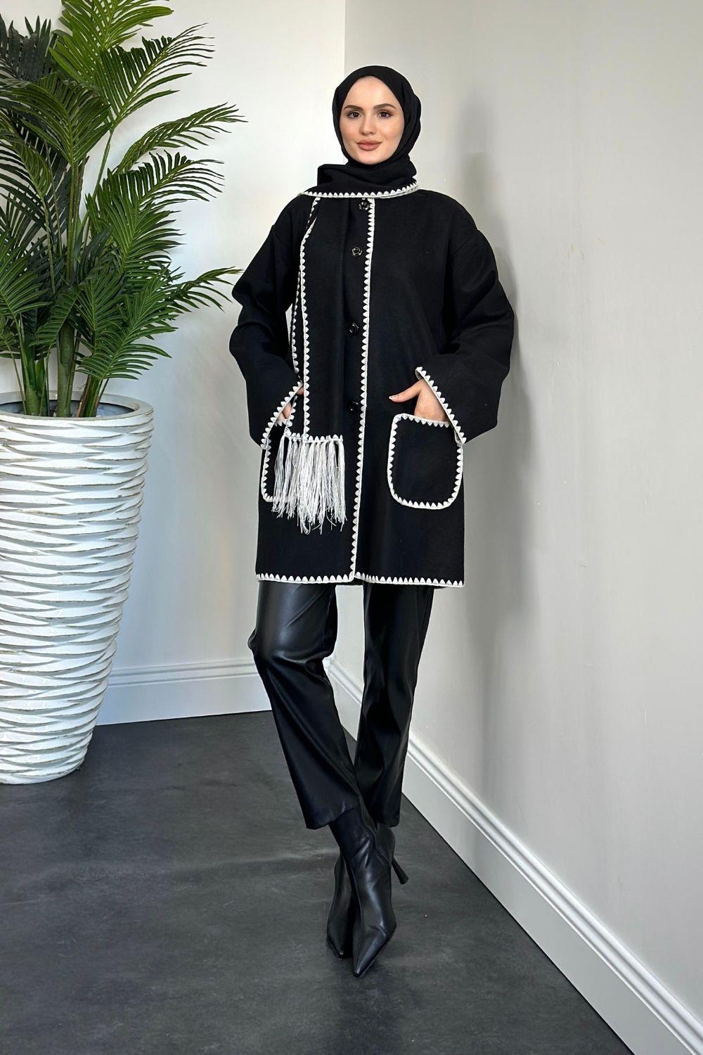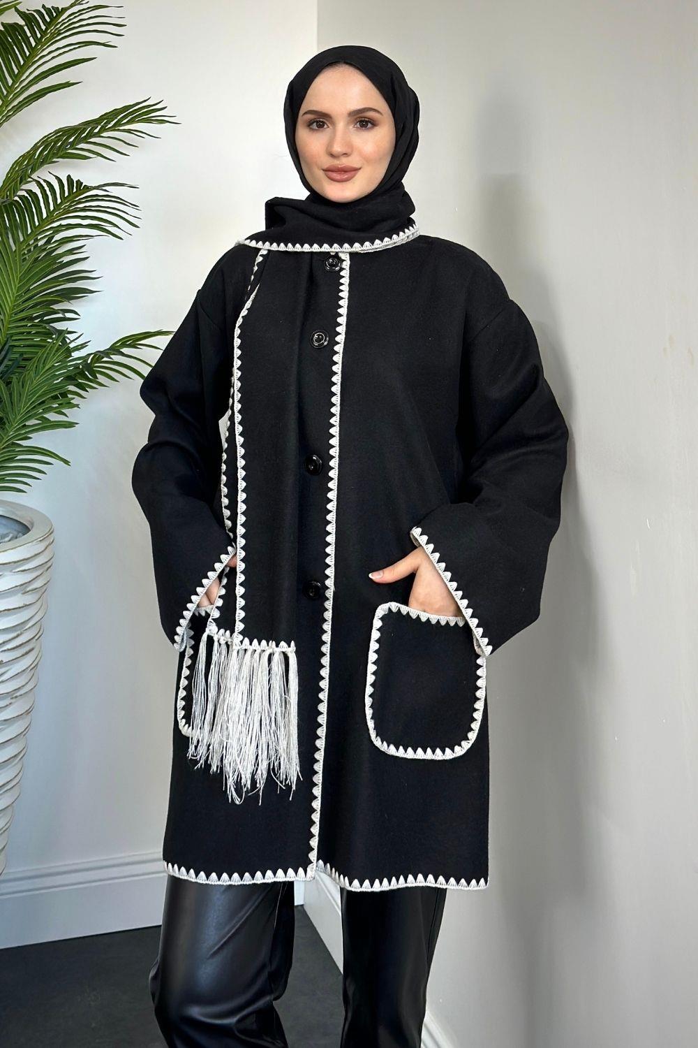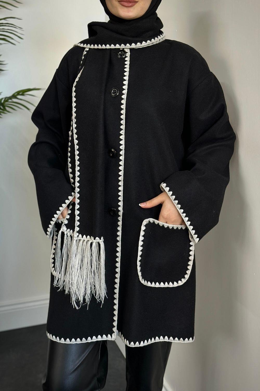 Biana Atkılı Düğmeli Kaşe Kaban Siyah