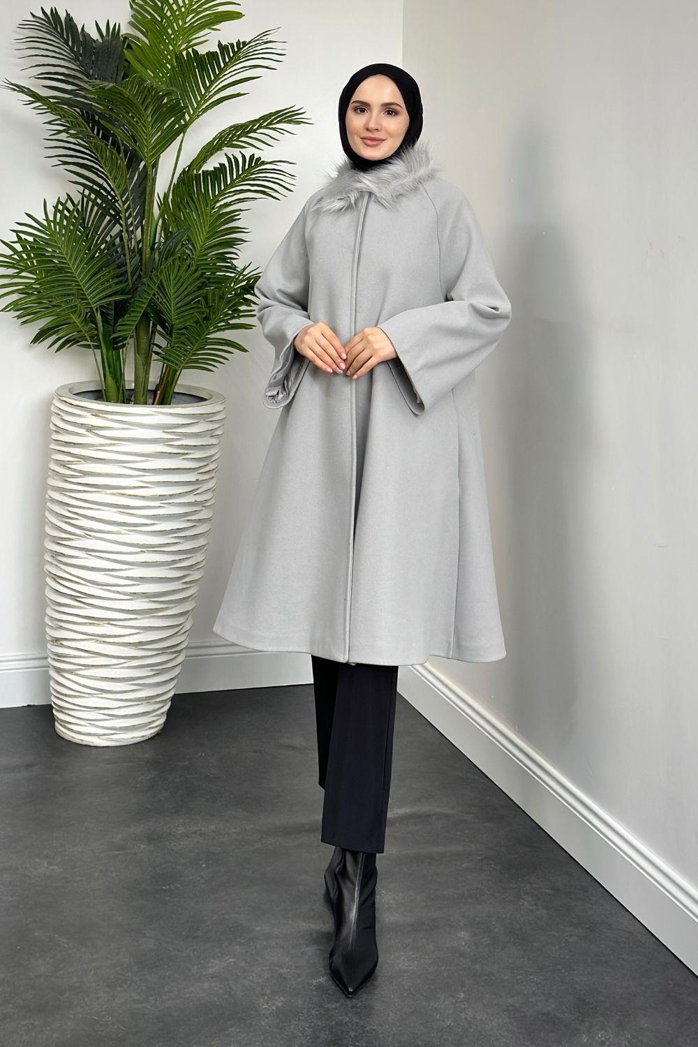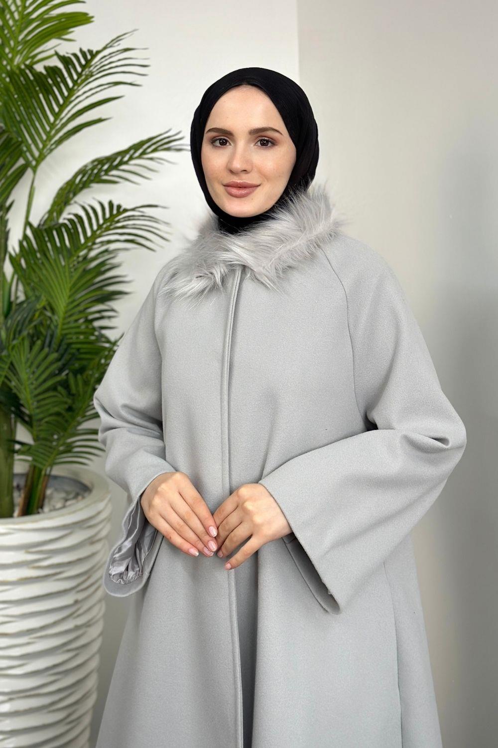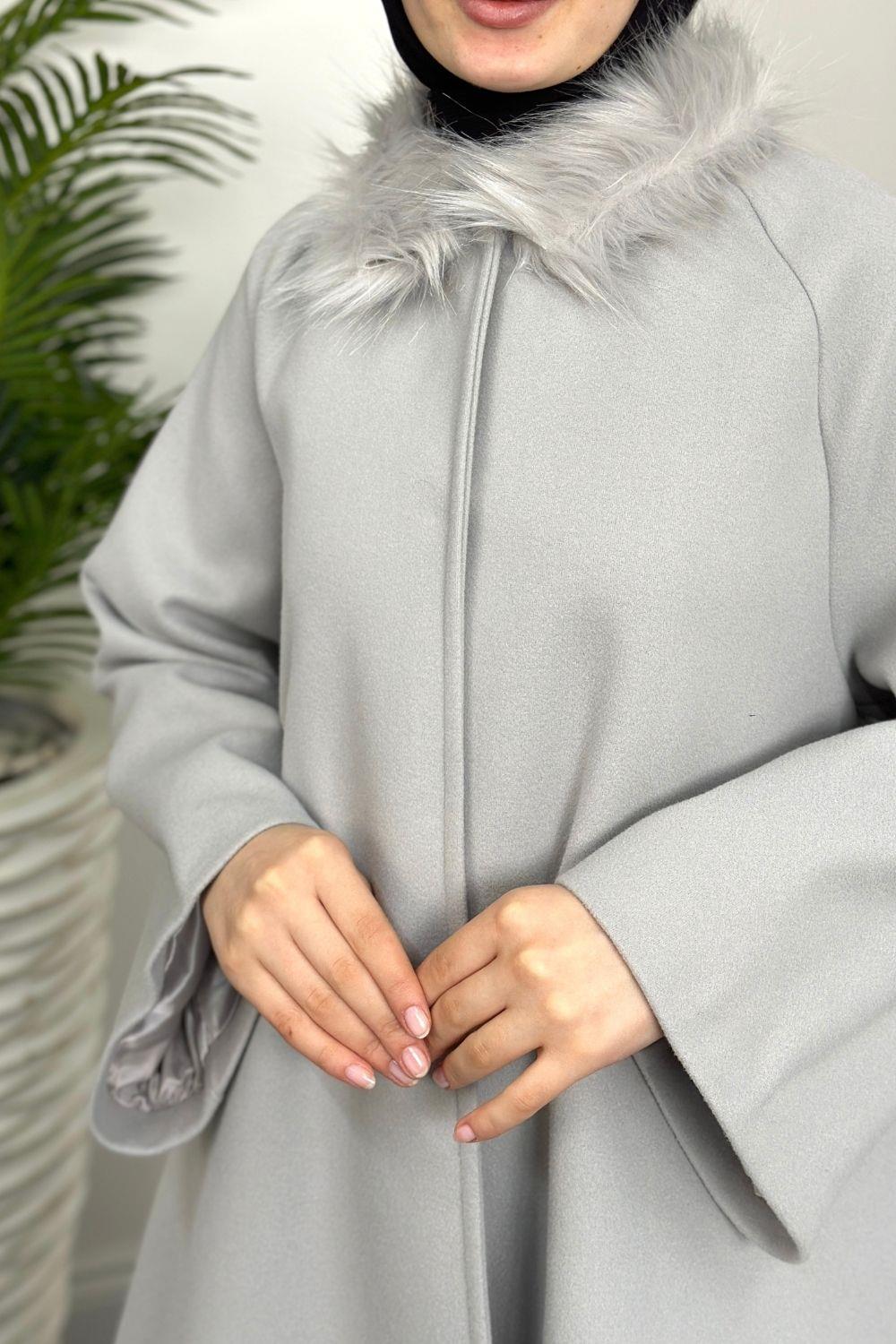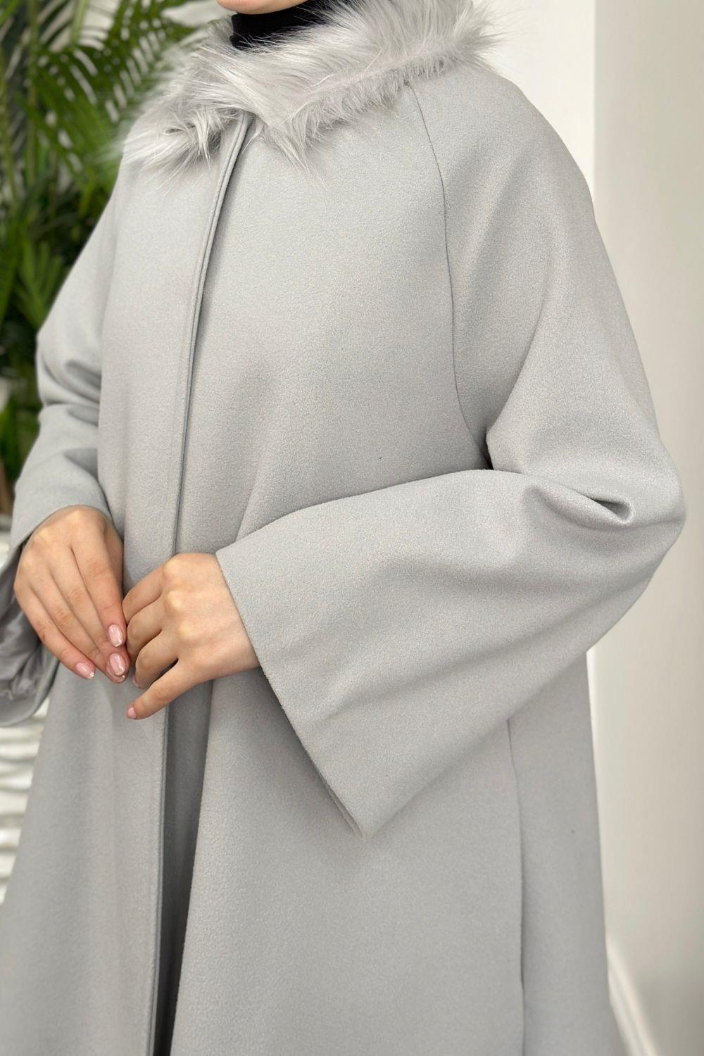 Oliwer Yakası Kürklü Astarlı Kaşe Kaban Gri