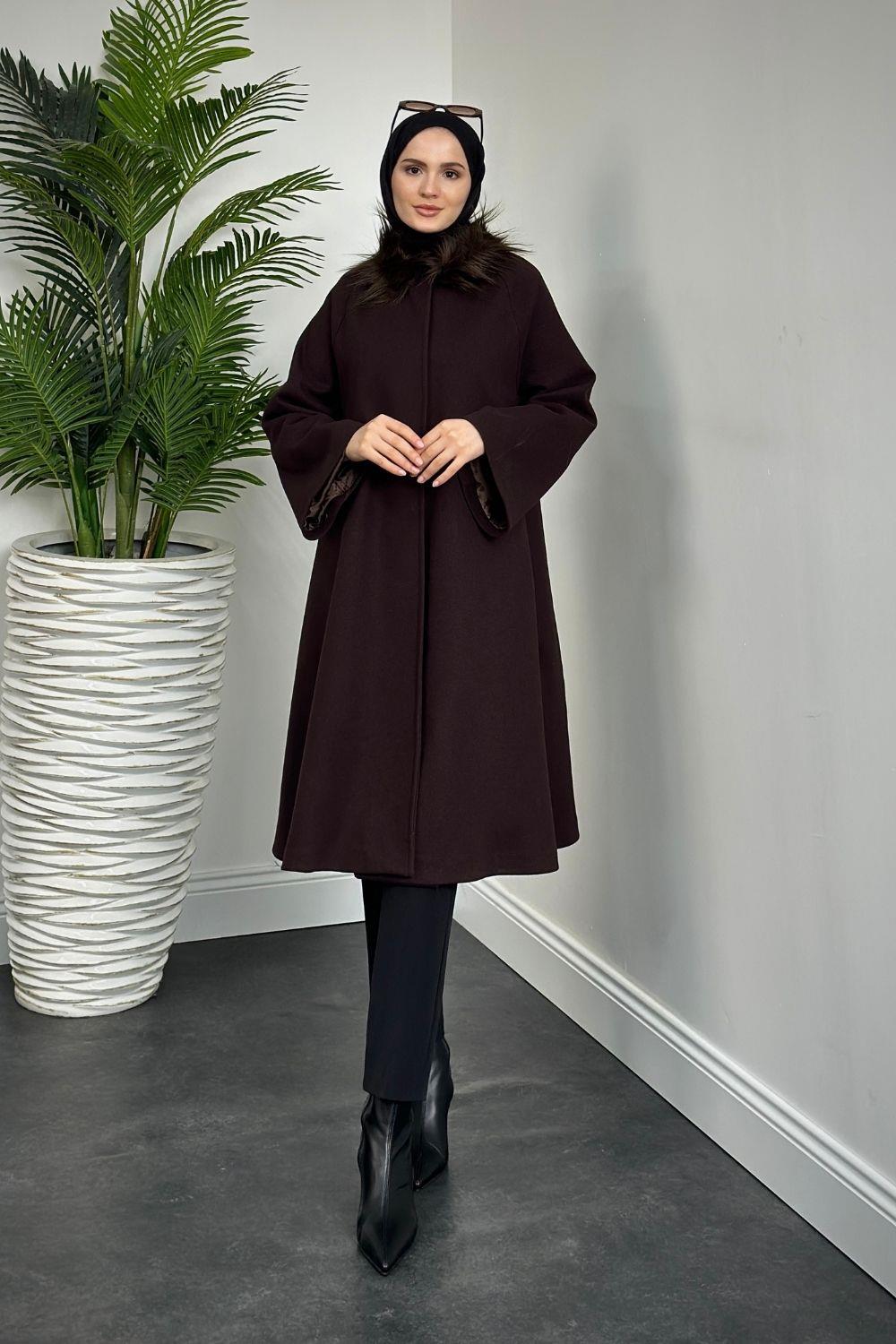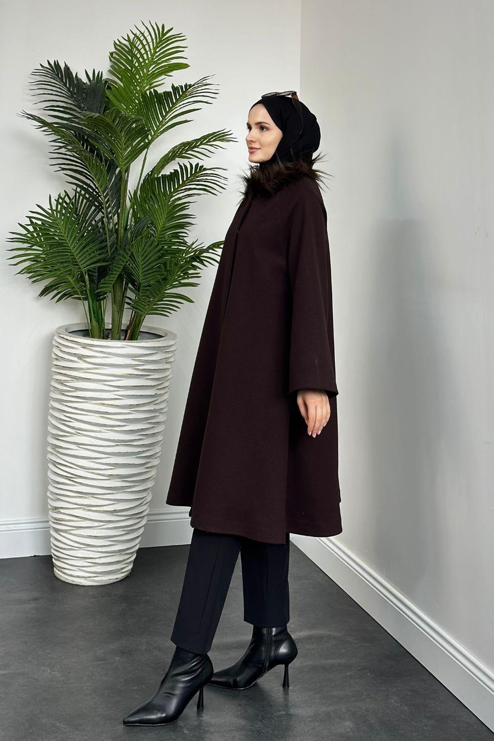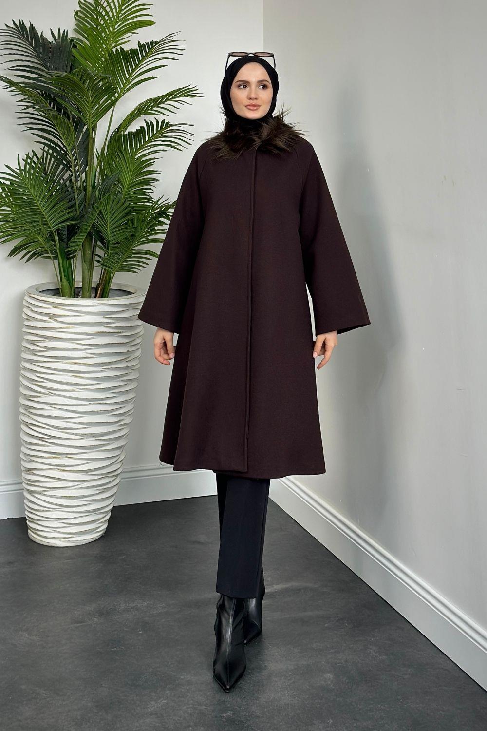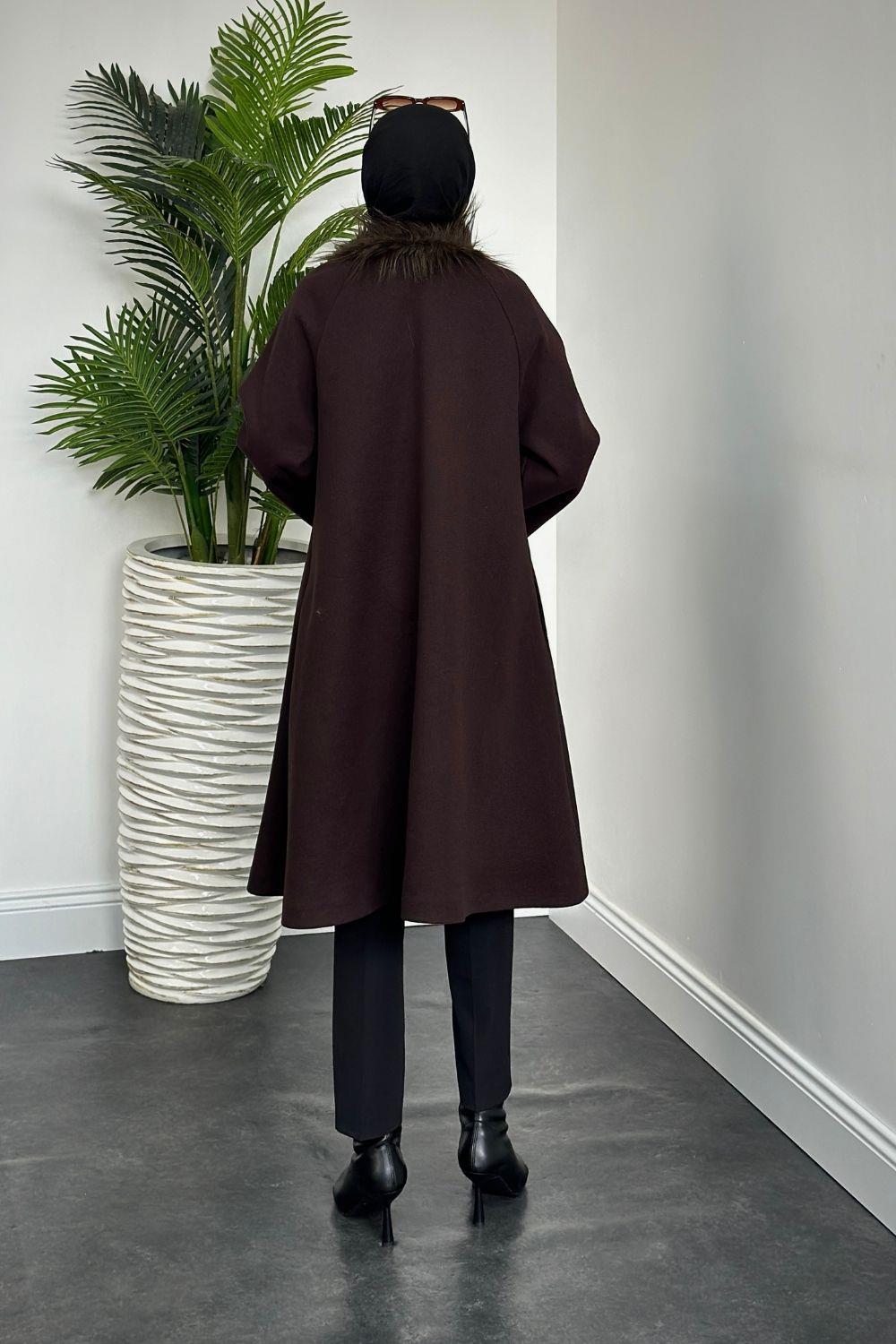 Oliwer Yakası Kürklü Astarlı Kaşe Kaban Kahverengi