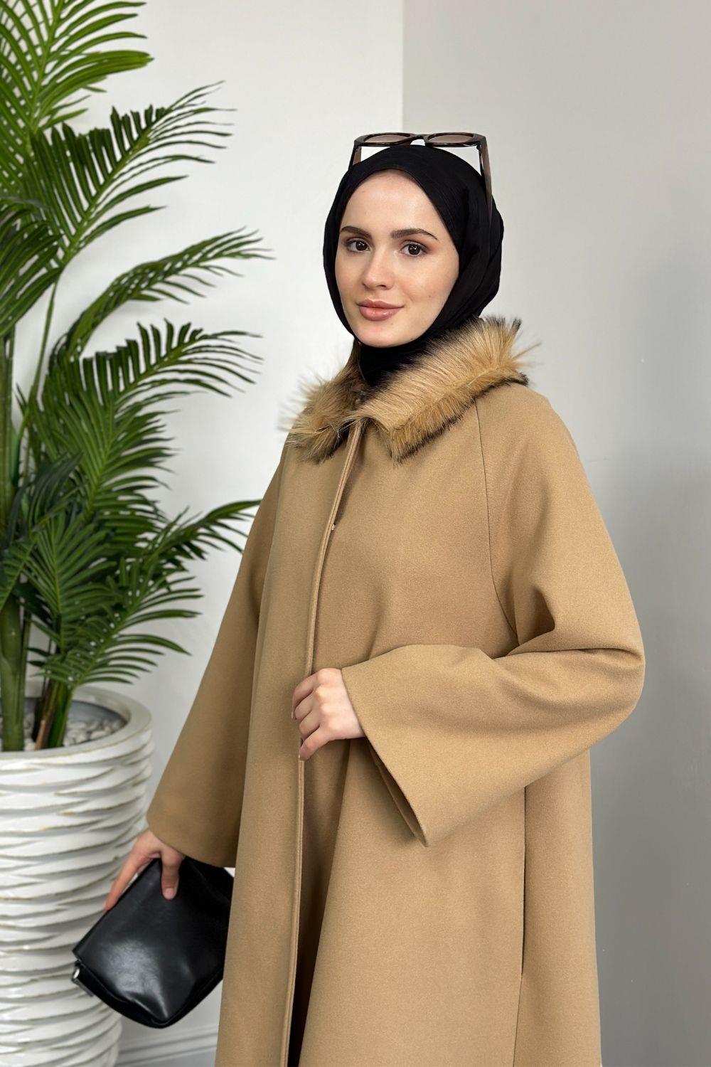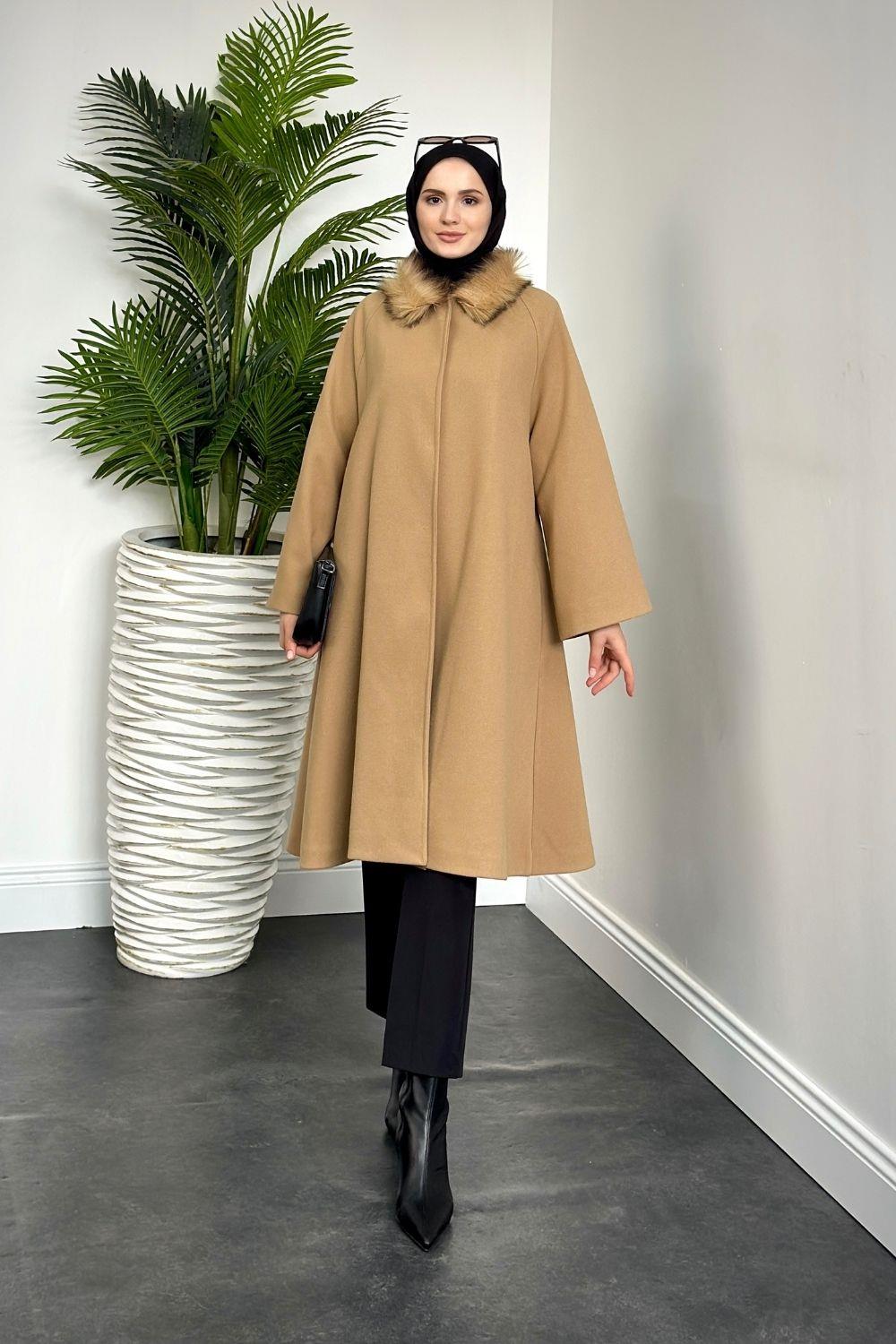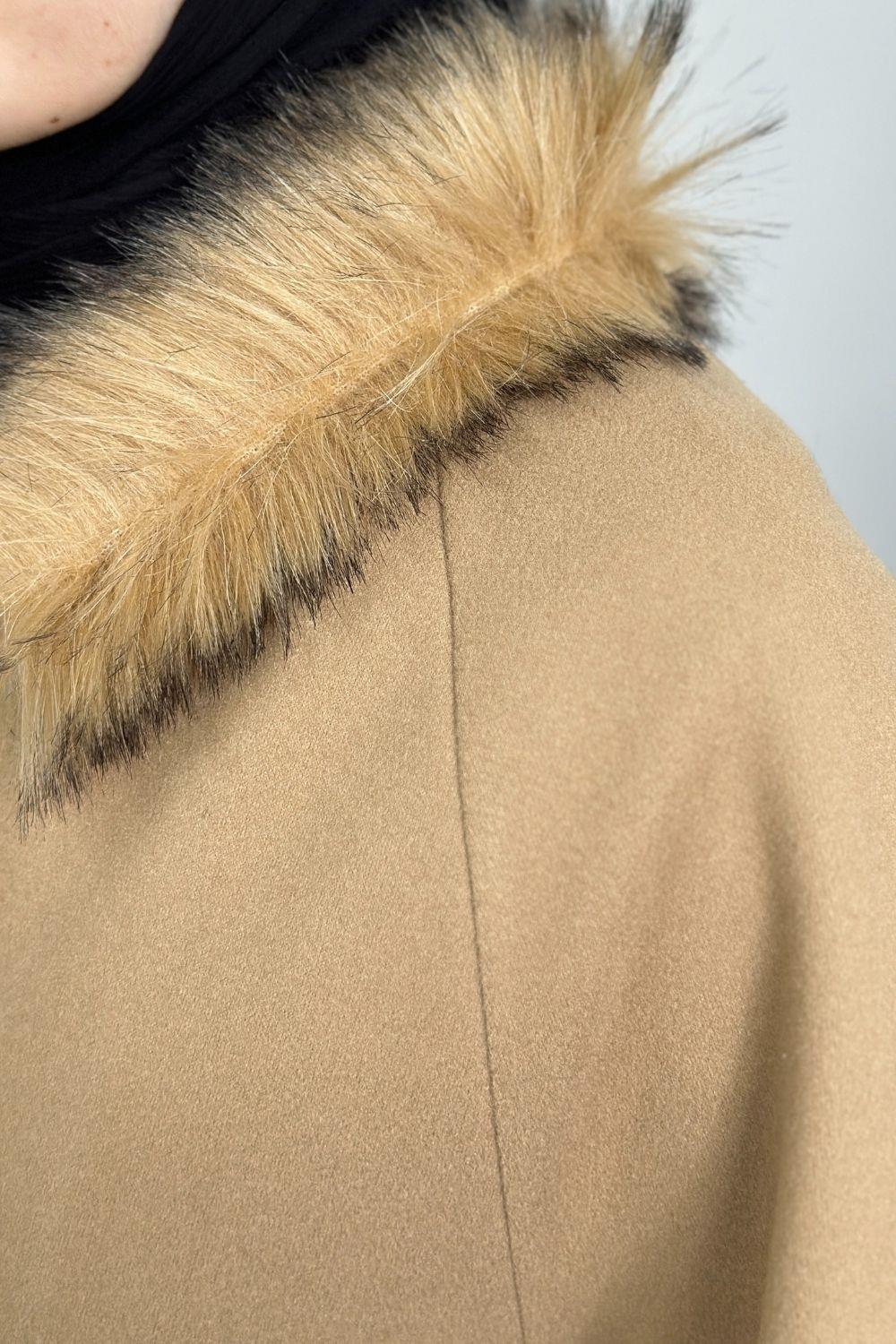 Oliwer Yakası Kürklü Astarlı Kaşe Kaban Camel