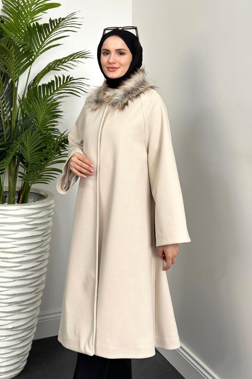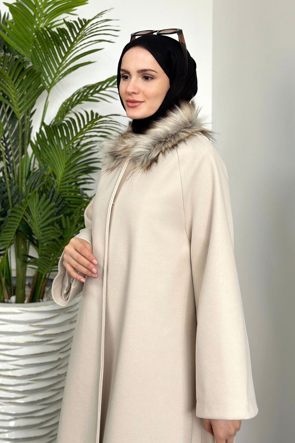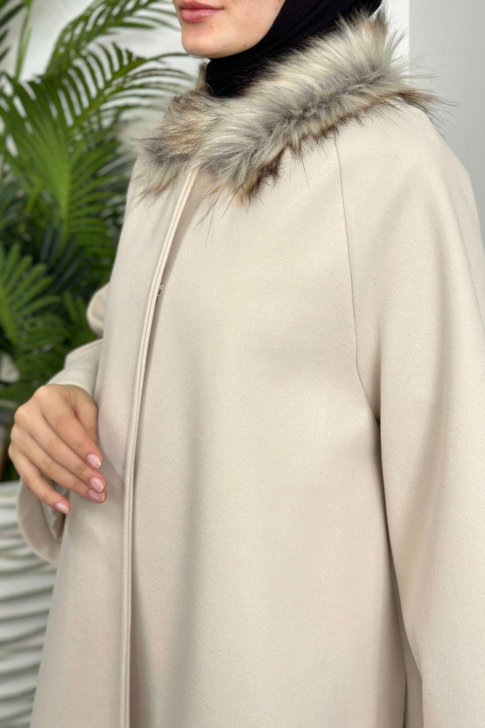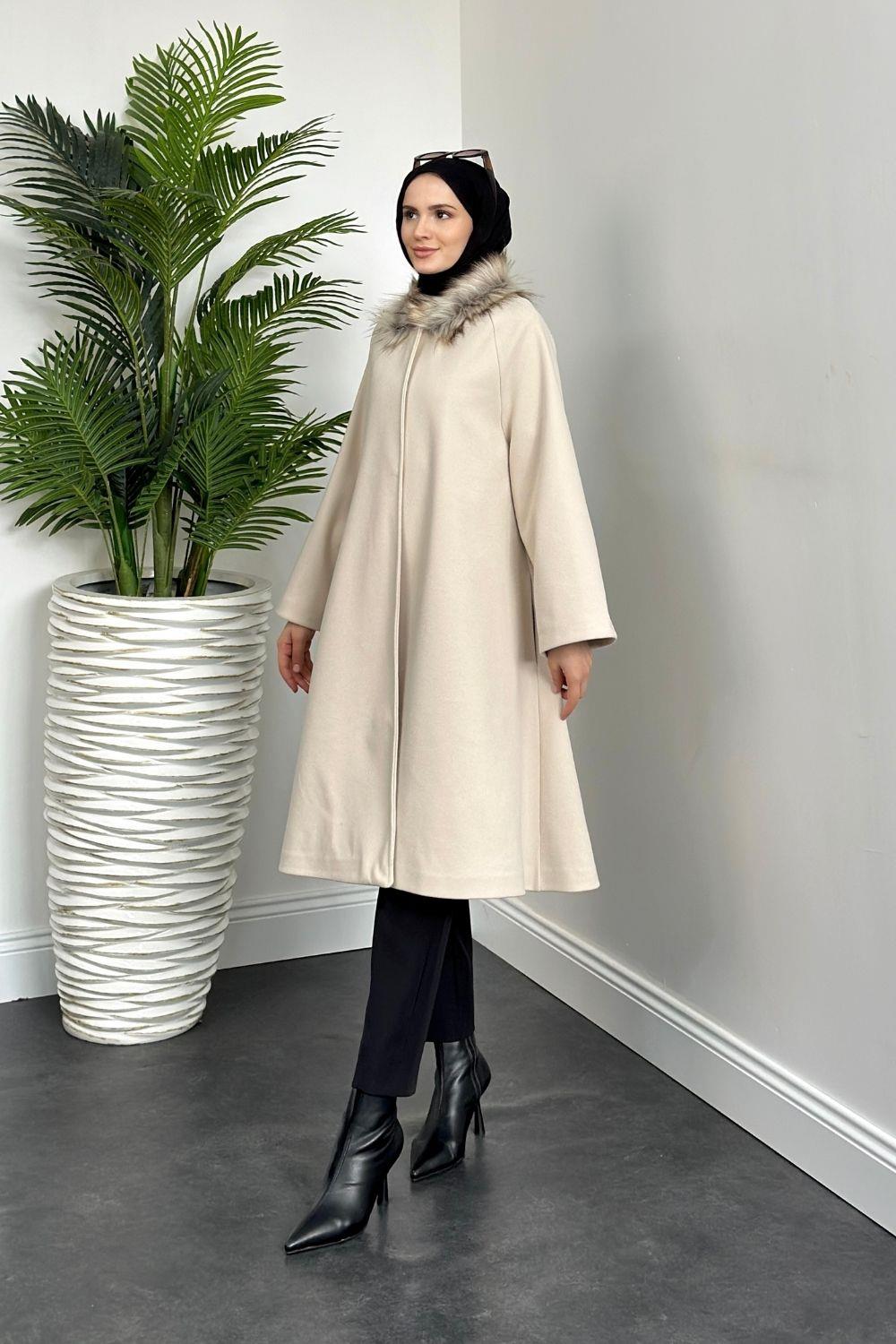 Oliwer Yakası Kürklü Astarlı Kaşe Kaban Krem