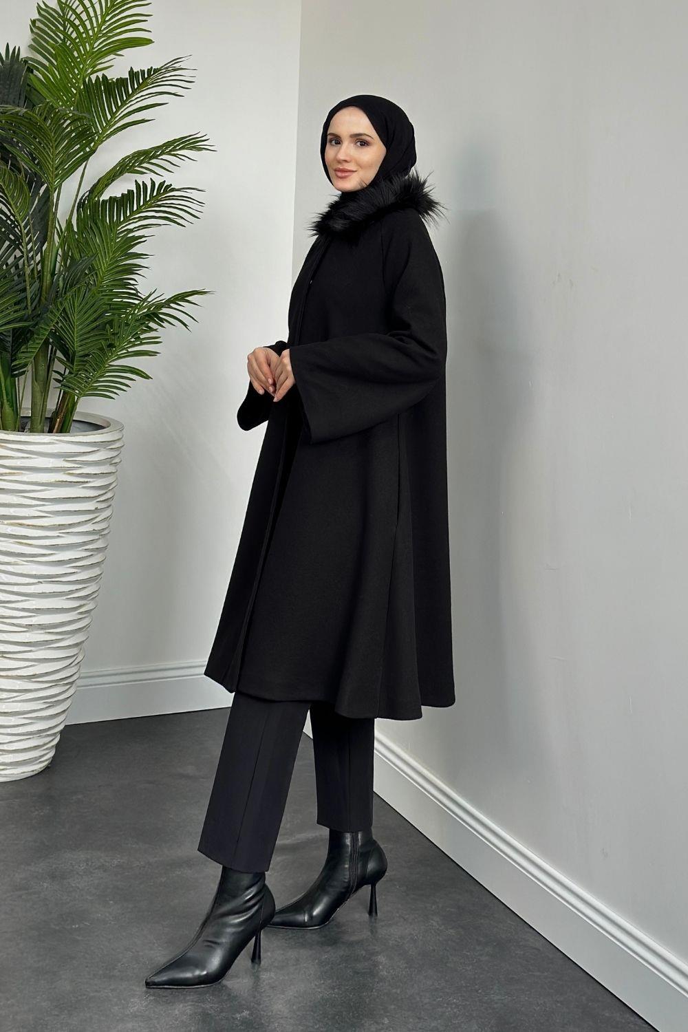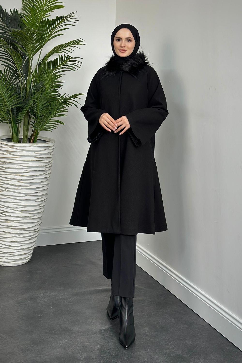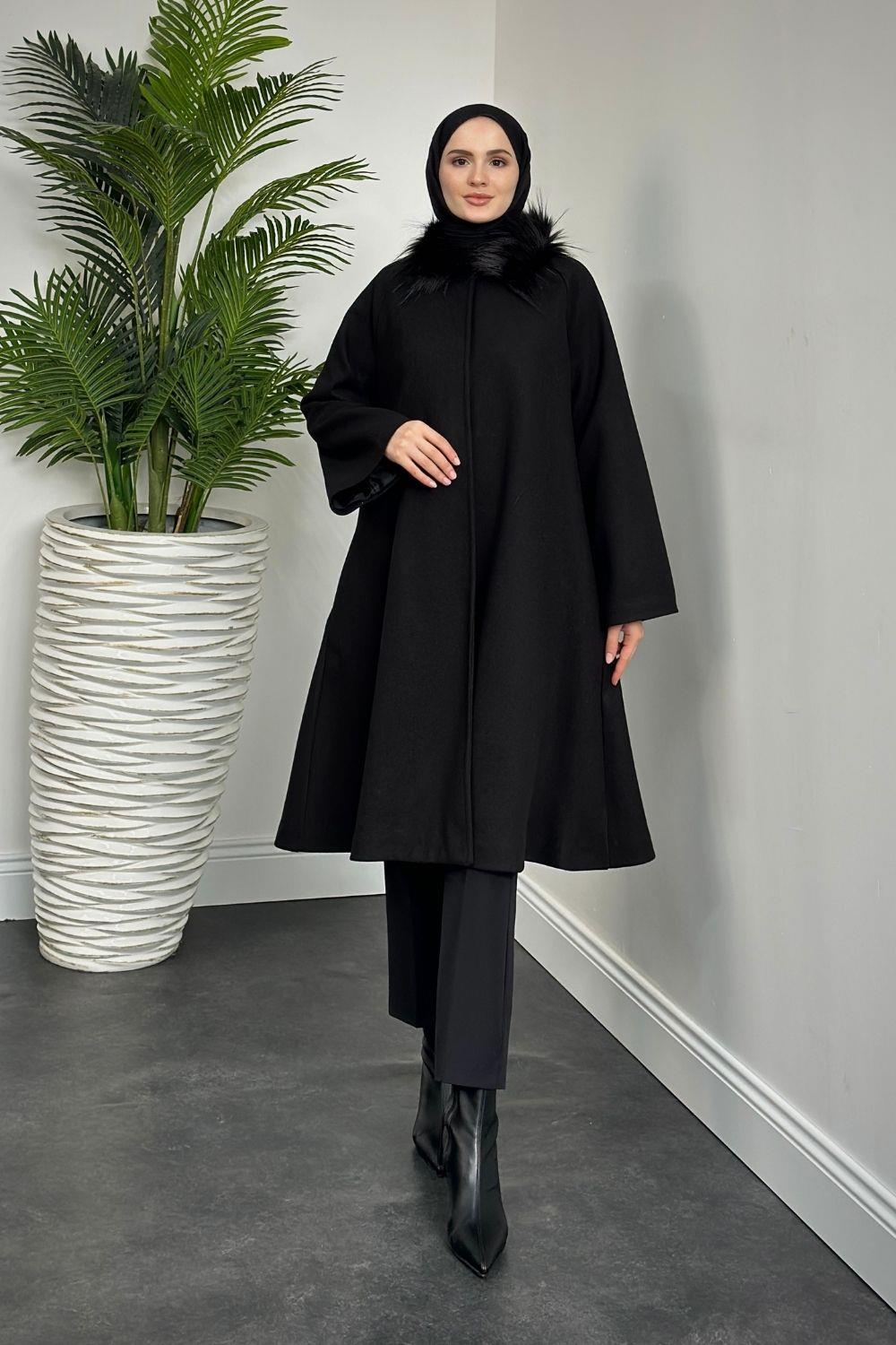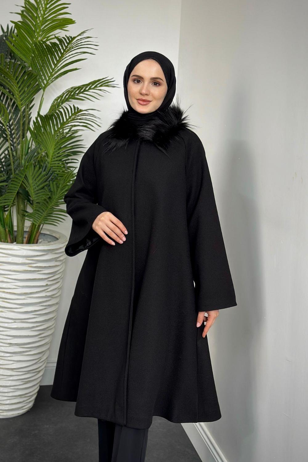 Oliwer Yakası Kürklü Astarlı Kaşe Kaban Siyah