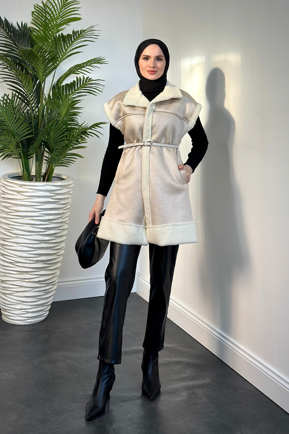 Adonis İçi Kürklü Kemerli Yelek Krem