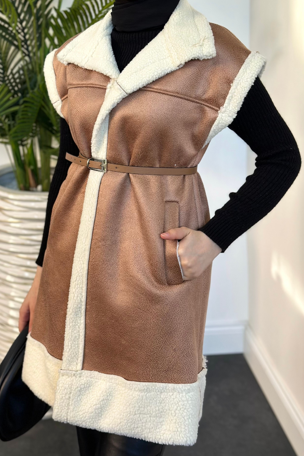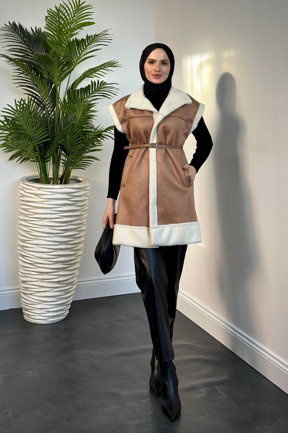 Adonis İçi Kürklü Kemerli Yelek Taba