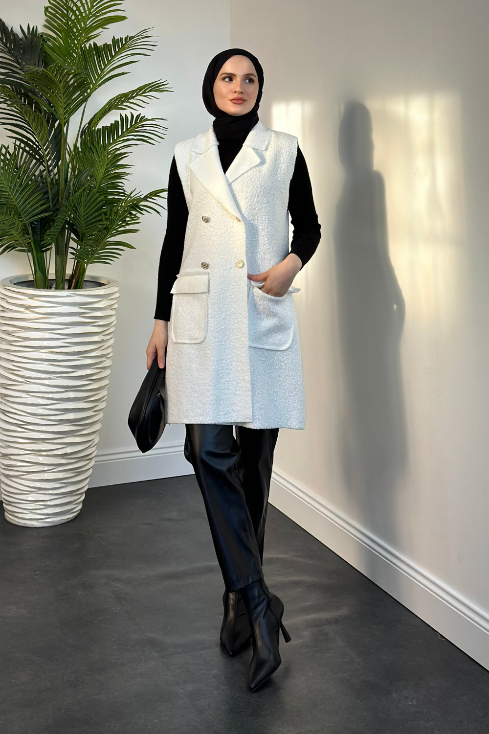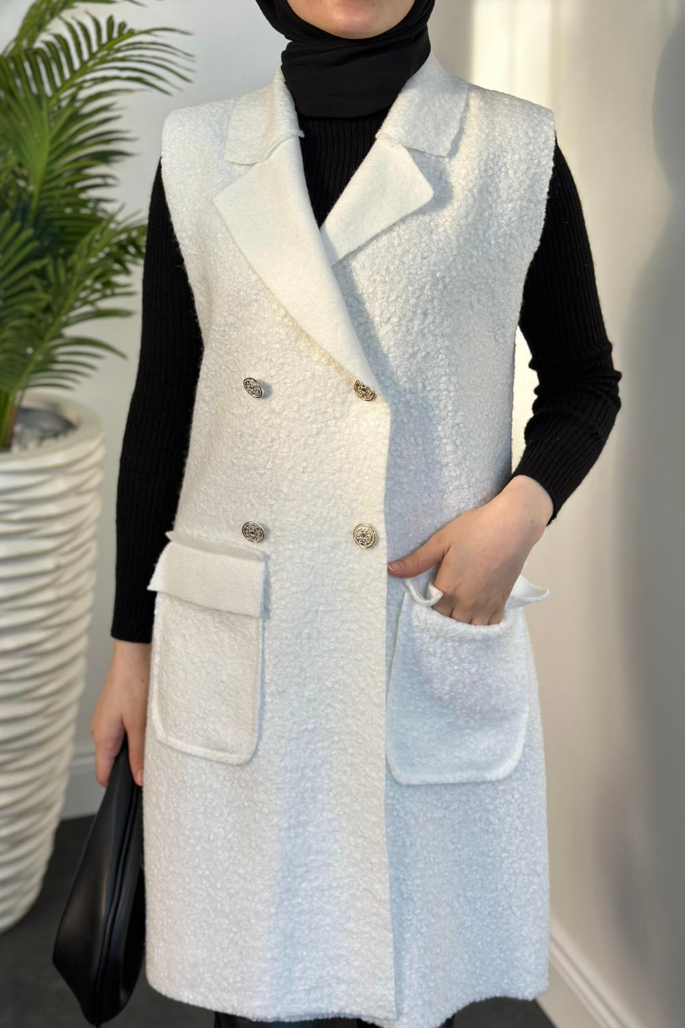 Yuliana Düğmeli Buklet Kumaş Yelek Beyaz