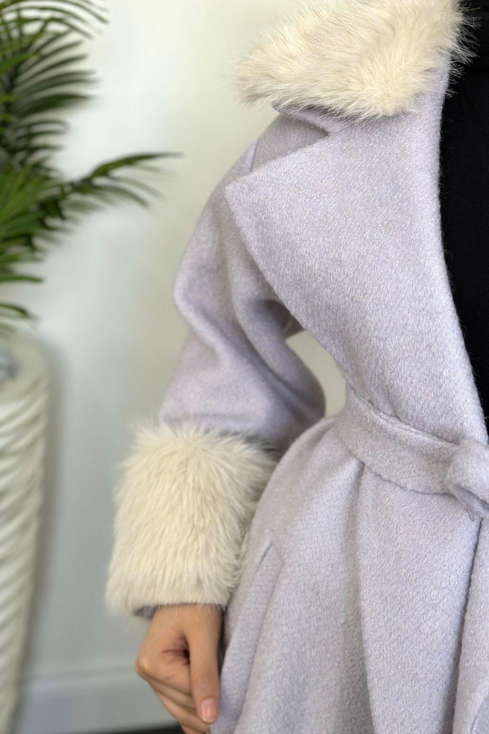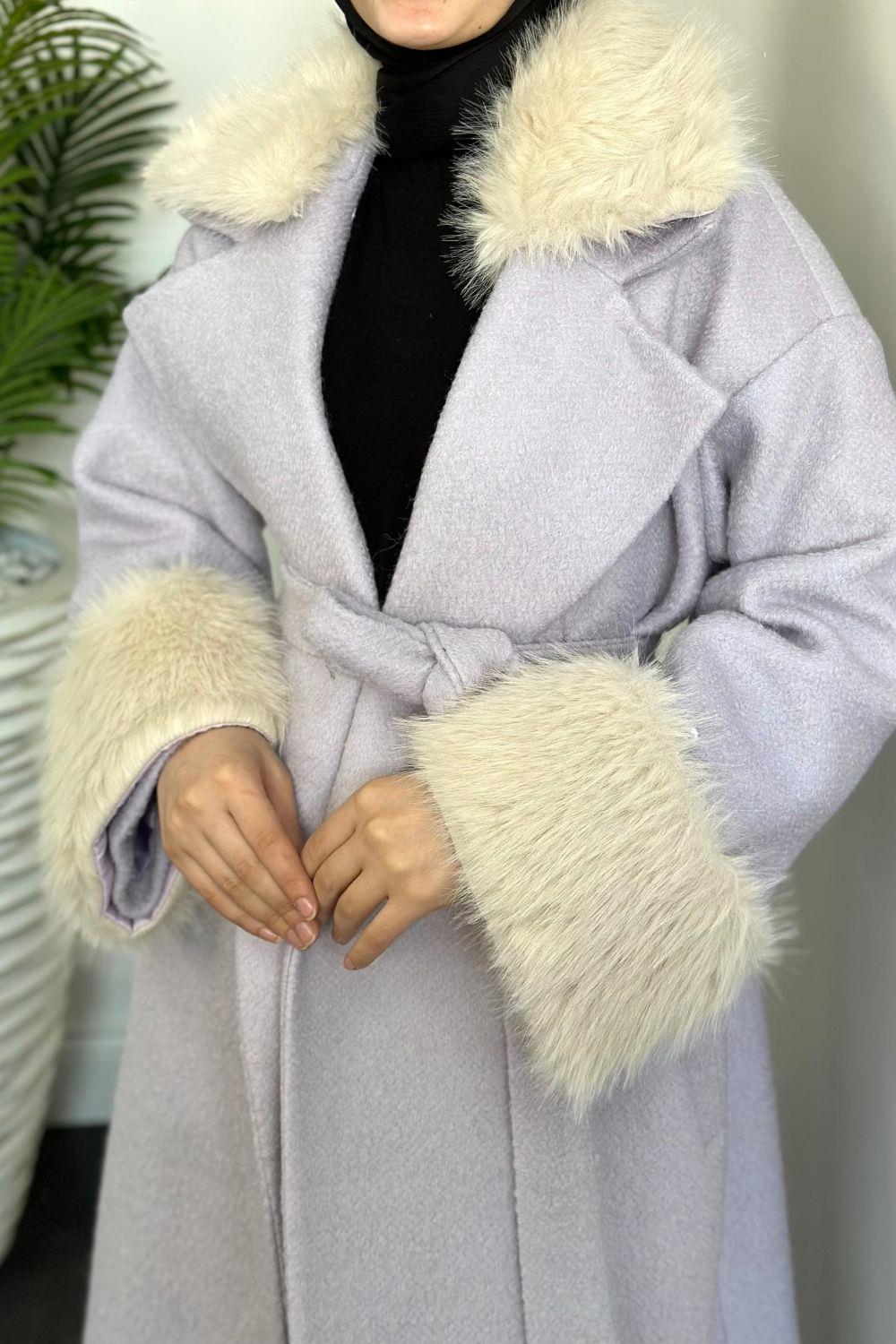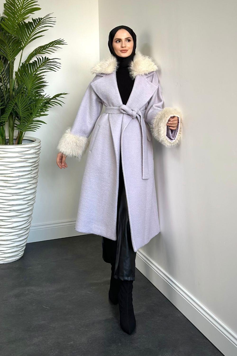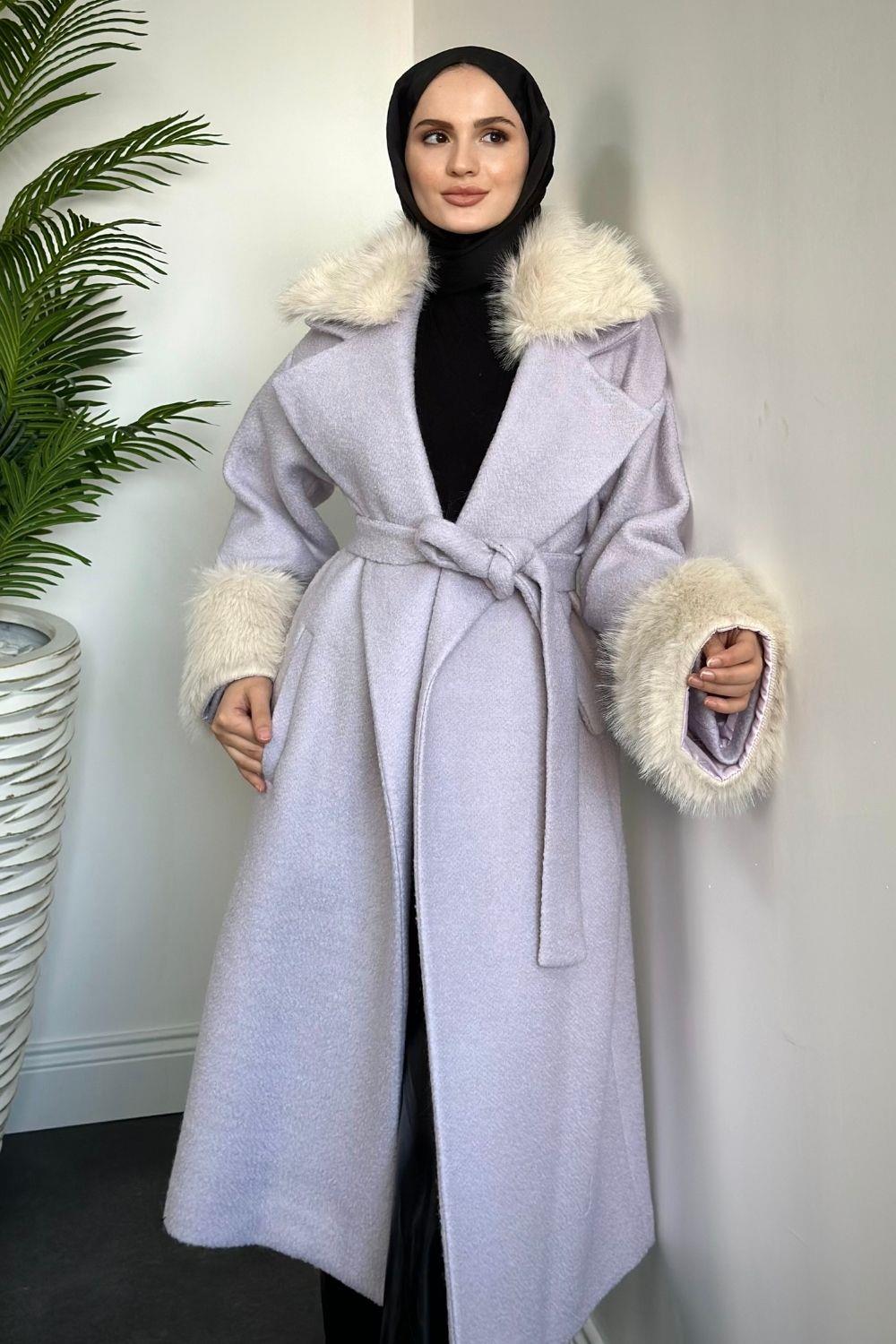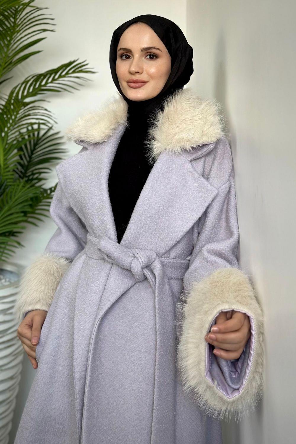 Haven Yakası Ve Kolları Kürklü Astarlı Kaşe Kaban Lila
