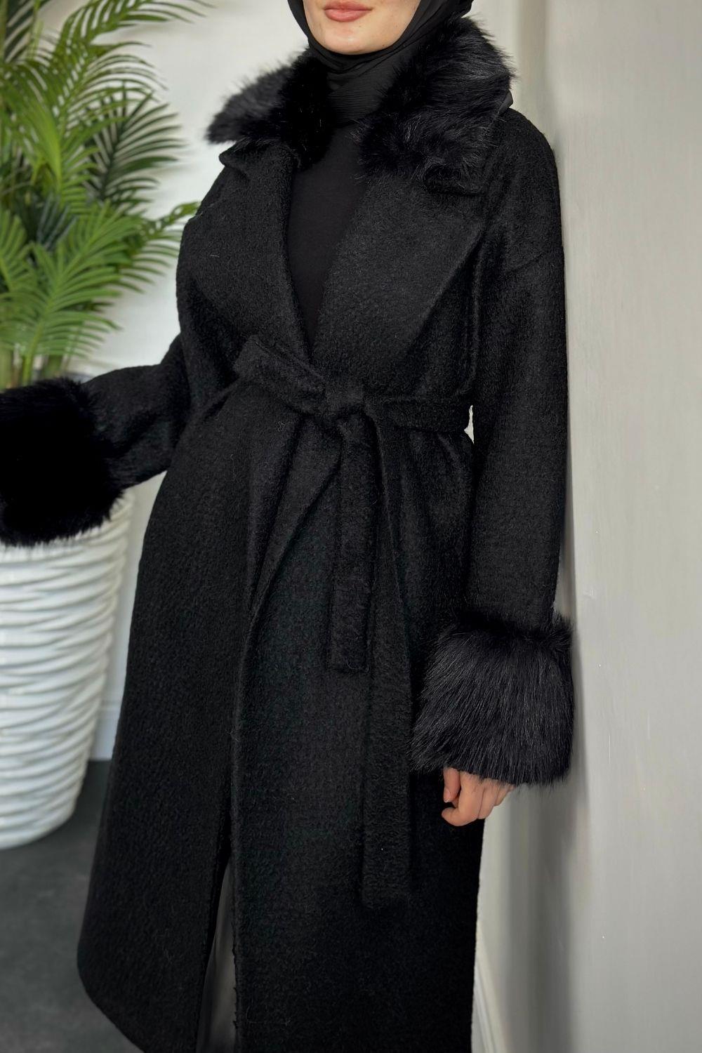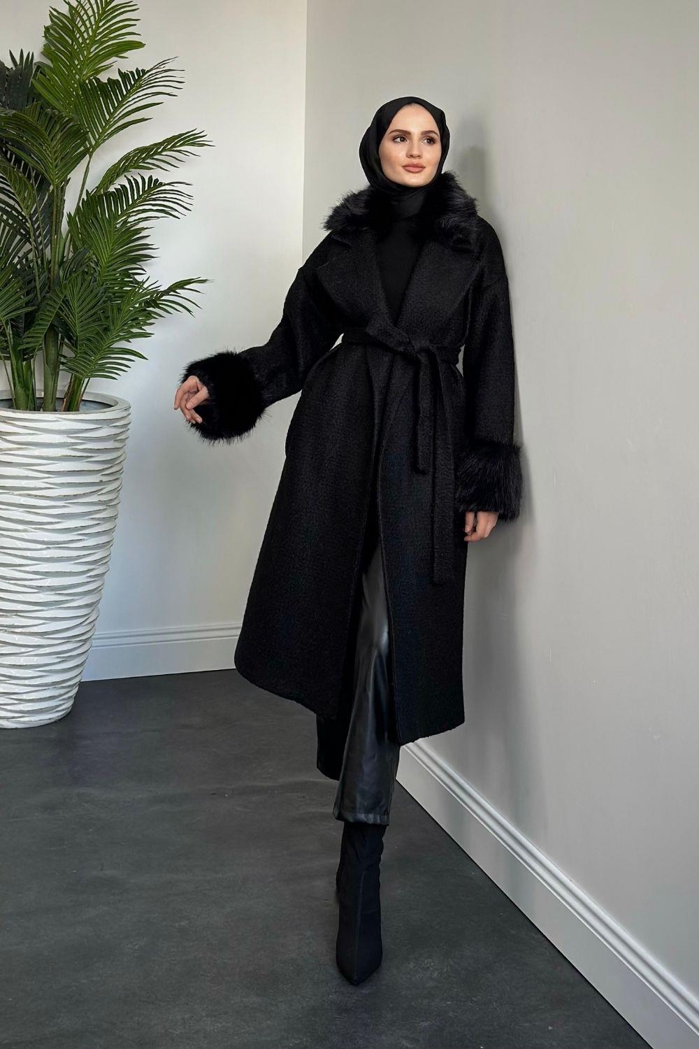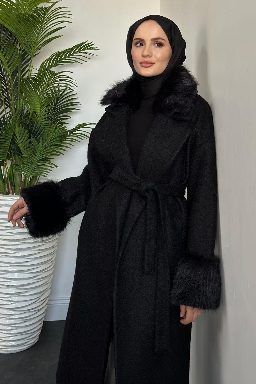 Haven Yakası Ve Kolları Kürklü Astarlı Kaşe Kaban Siyah