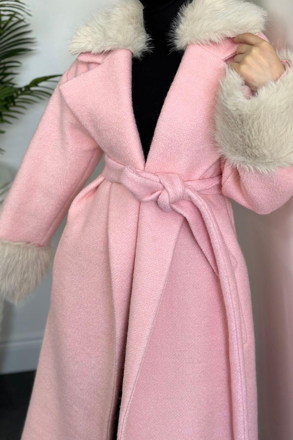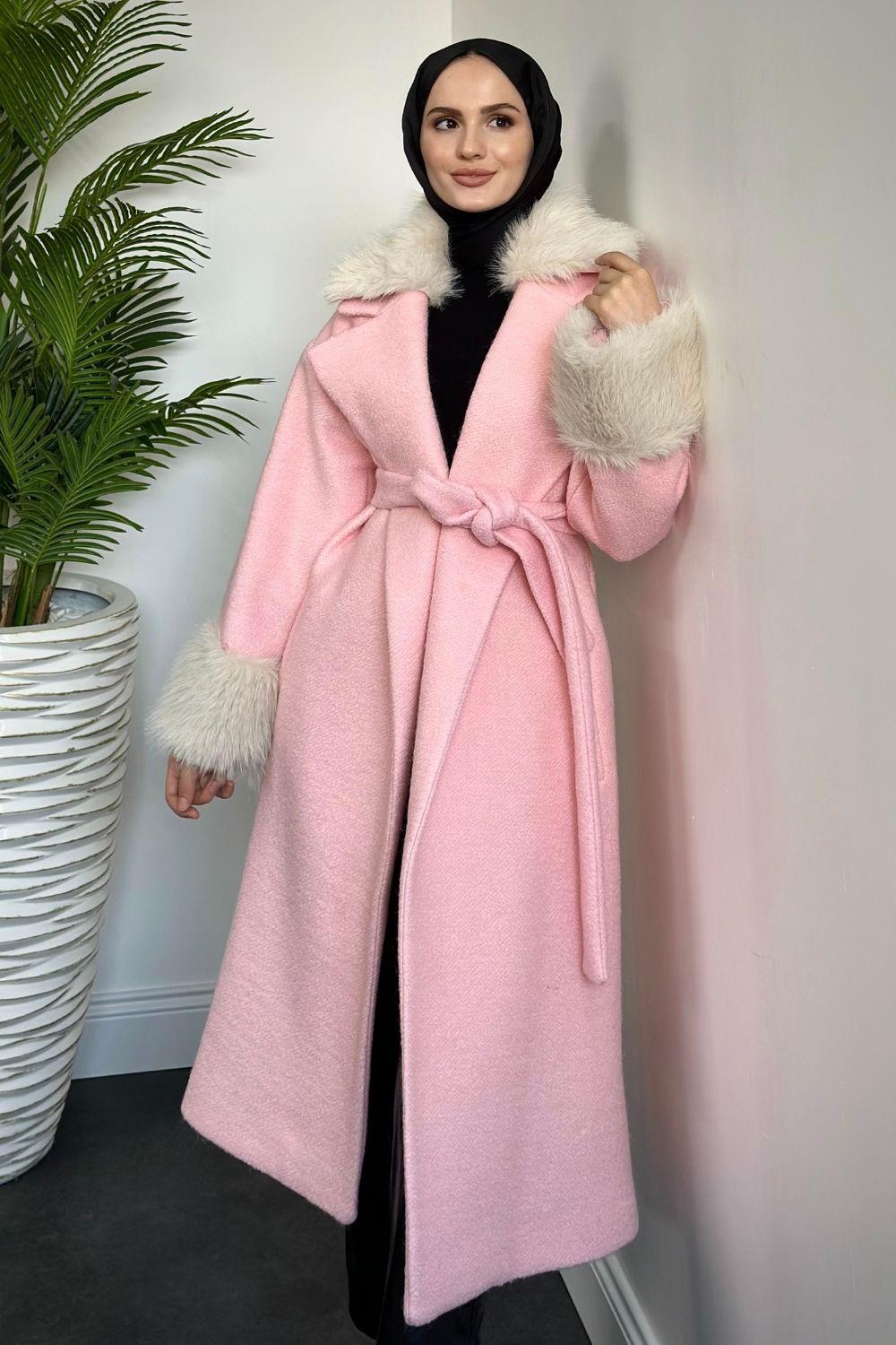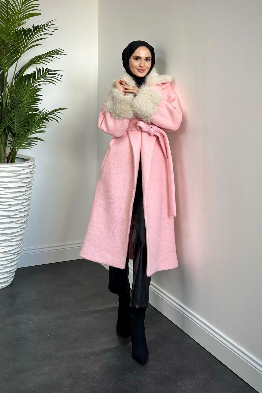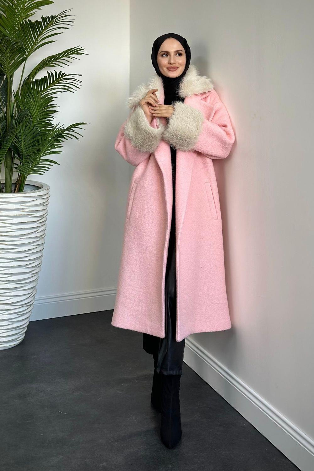 Haven Yakası Ve Kolları Kürklü Astarlı Kaşe Kaban Pembe