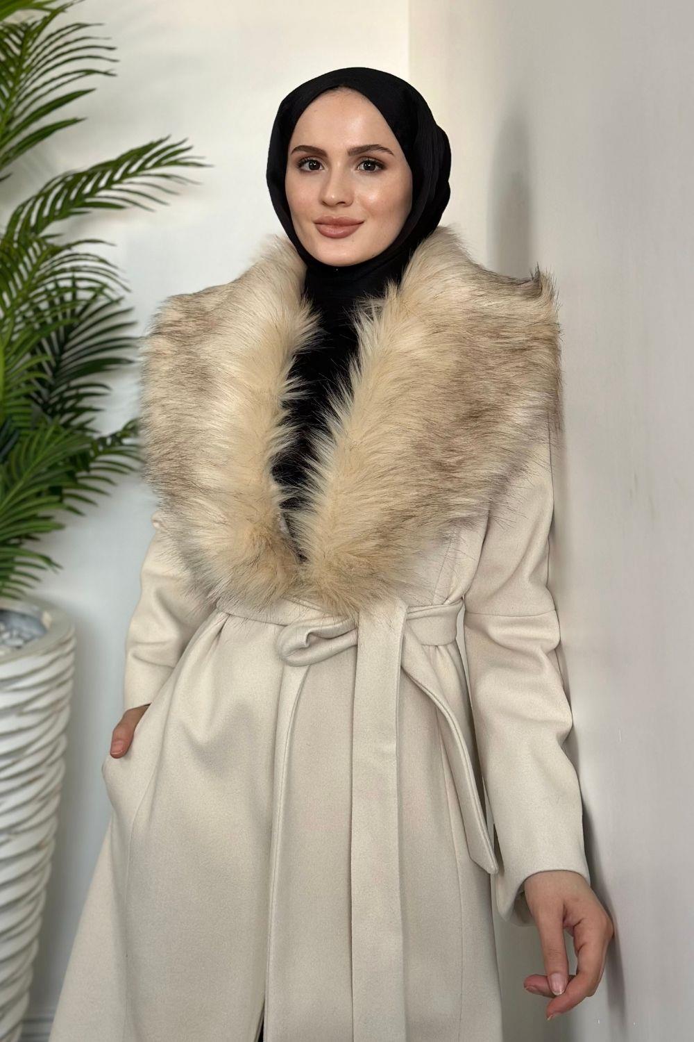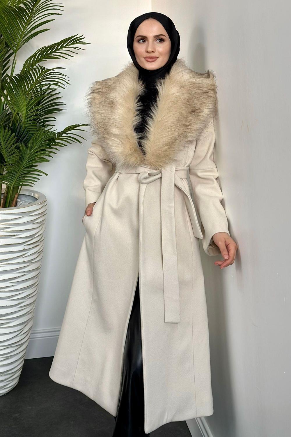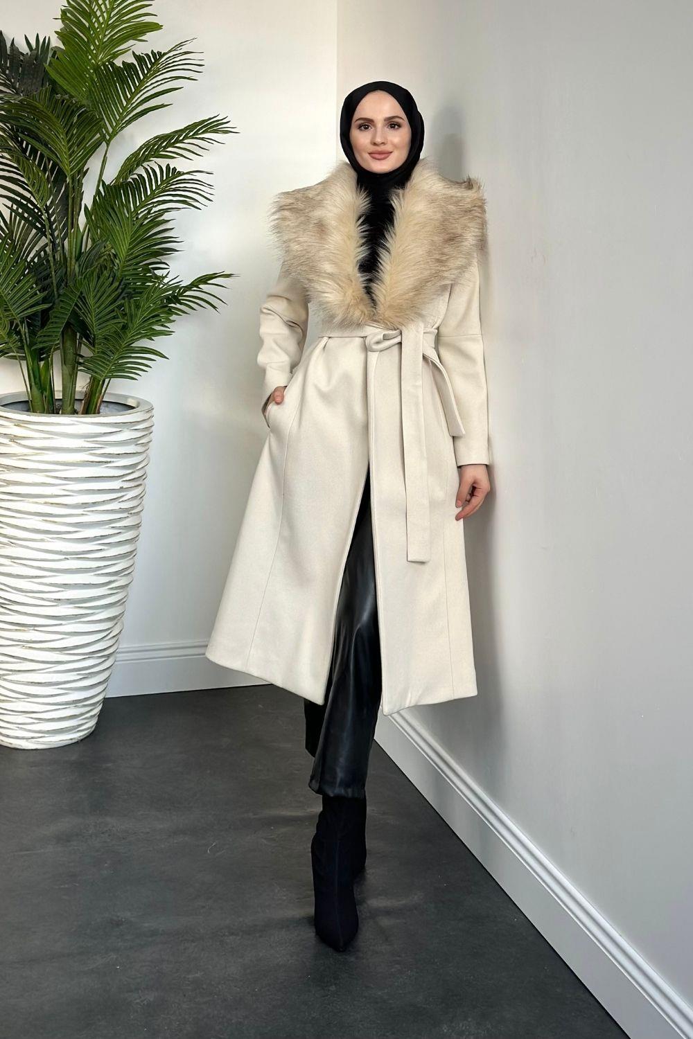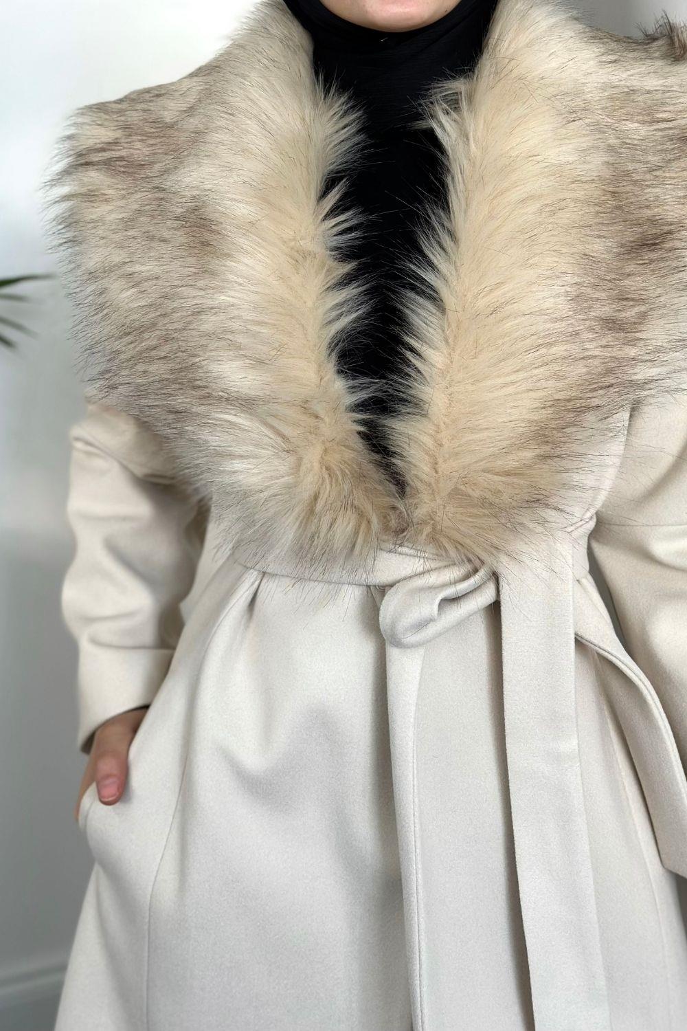 Felicia Yakası Kürklü Astarlı Kaban Krem