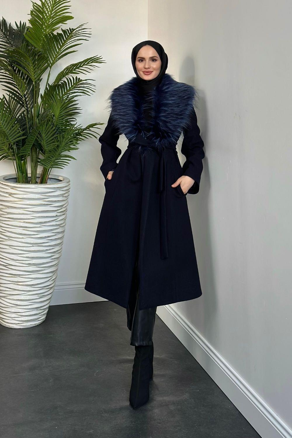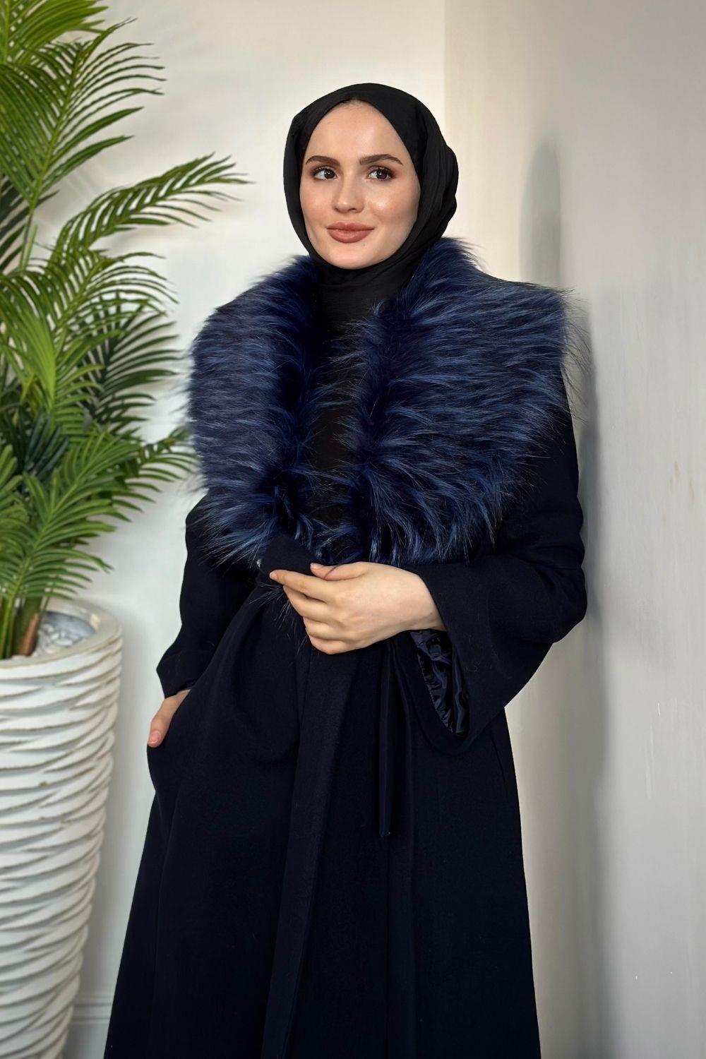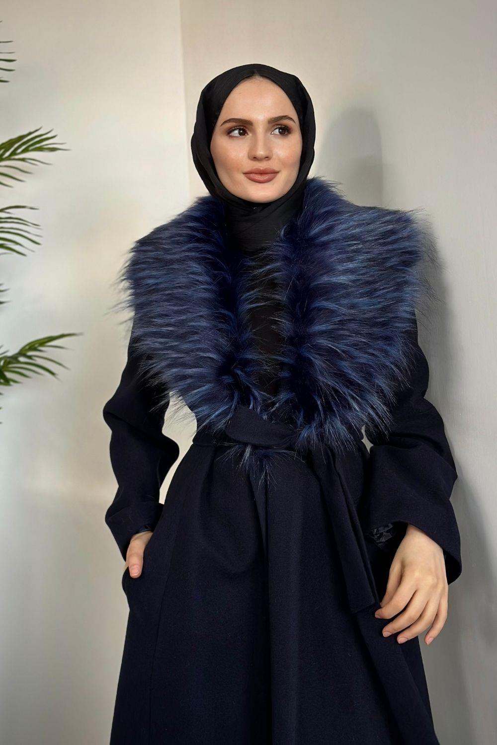 Felicia Yakası Kürklü Astarlı Kaban Lacivert