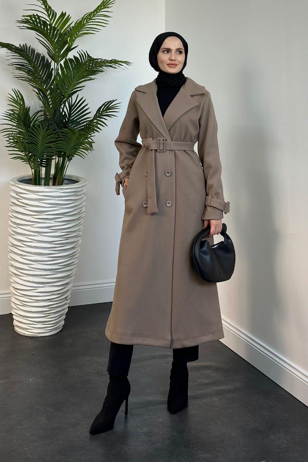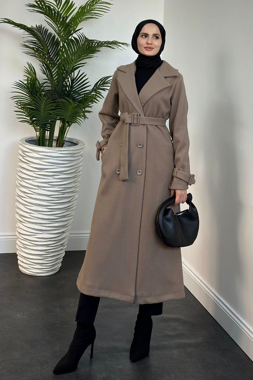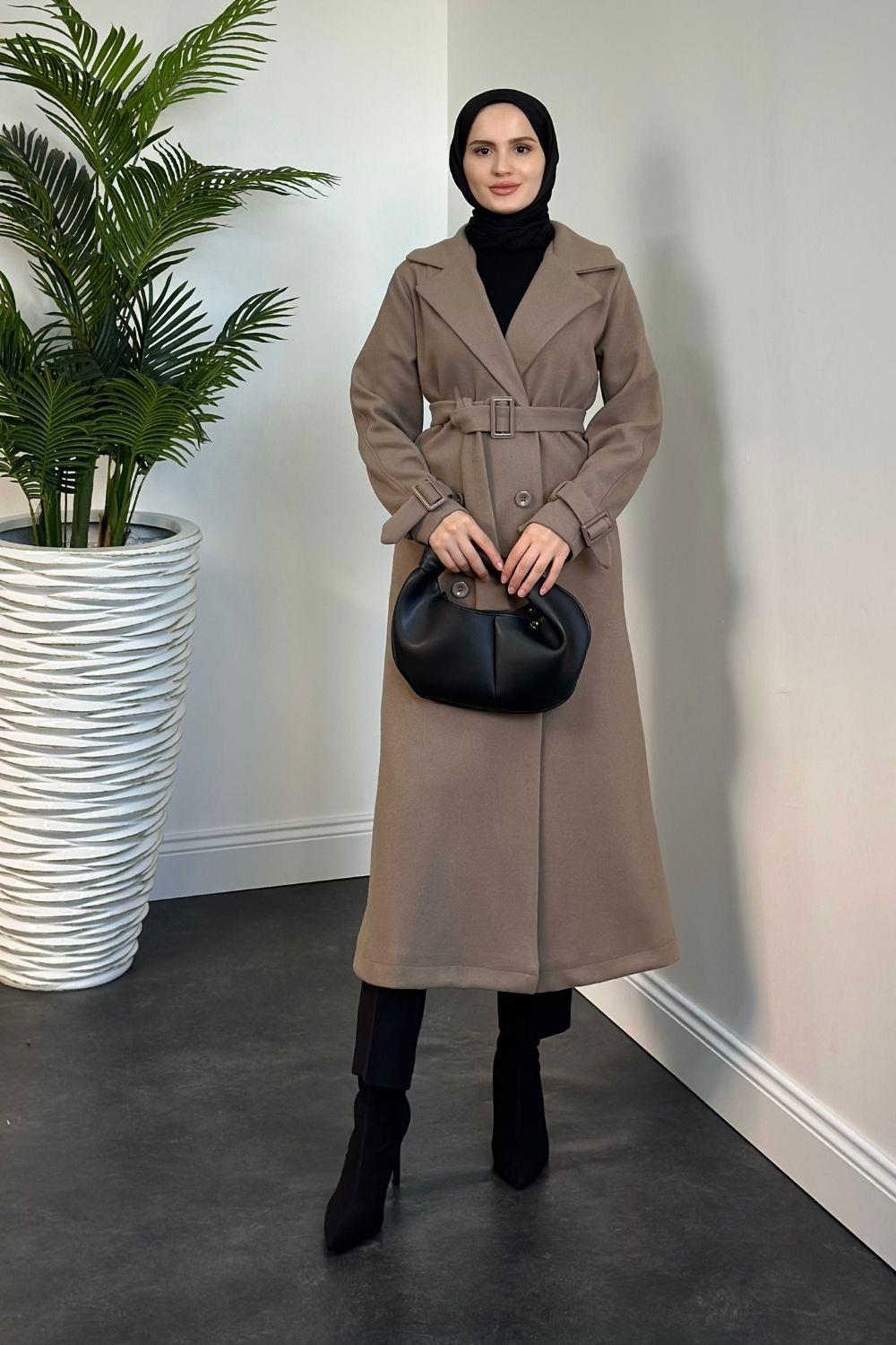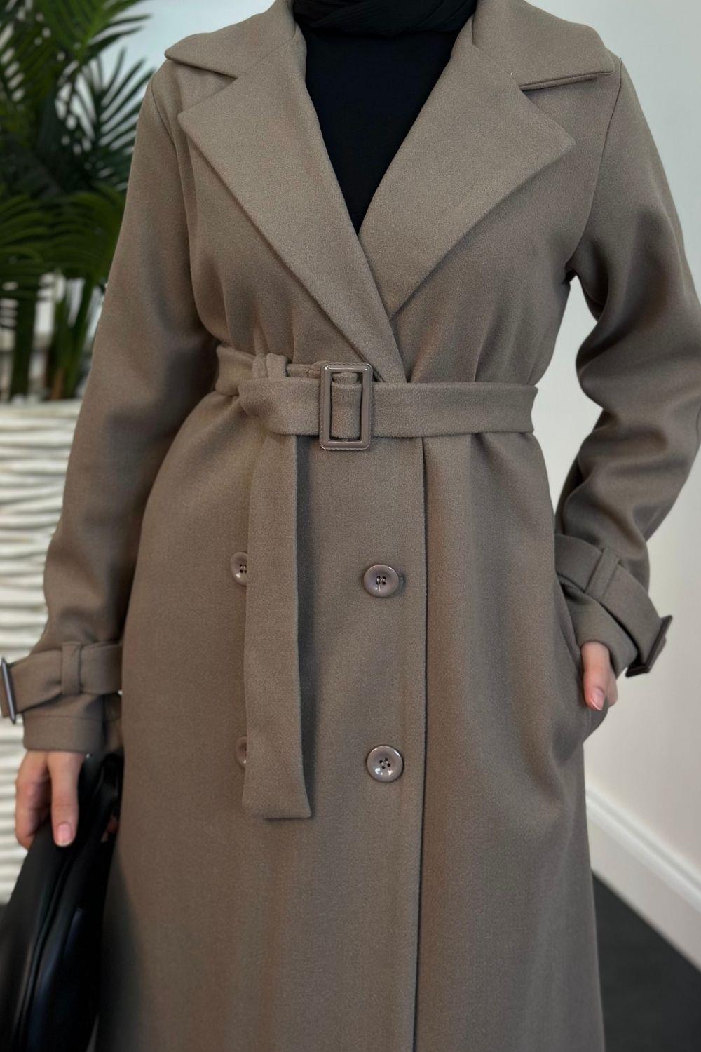 Mahika Astarlı Kemerli Kaşe Kaban Koyu Vizon