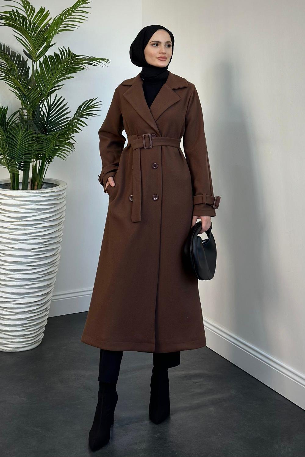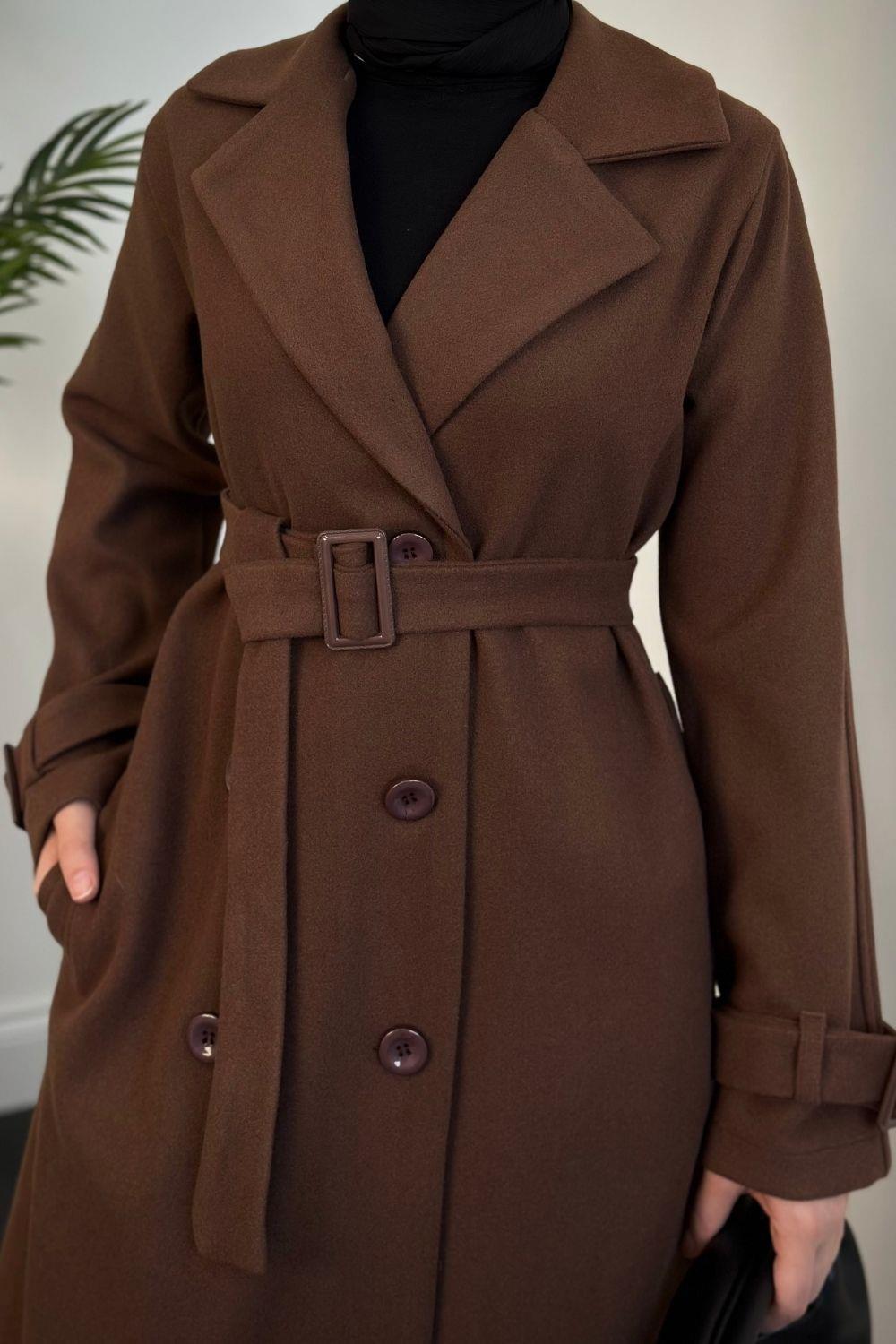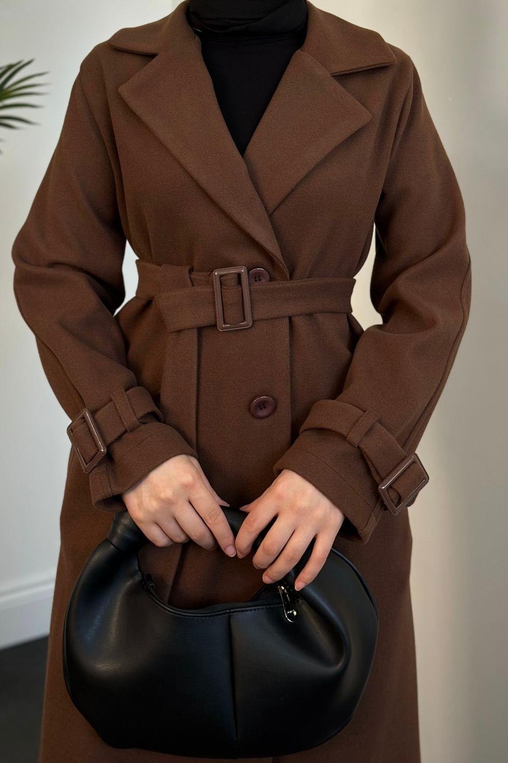 Mahika Astarlı Kemerli Kaşe Kaban Koyu Kahve