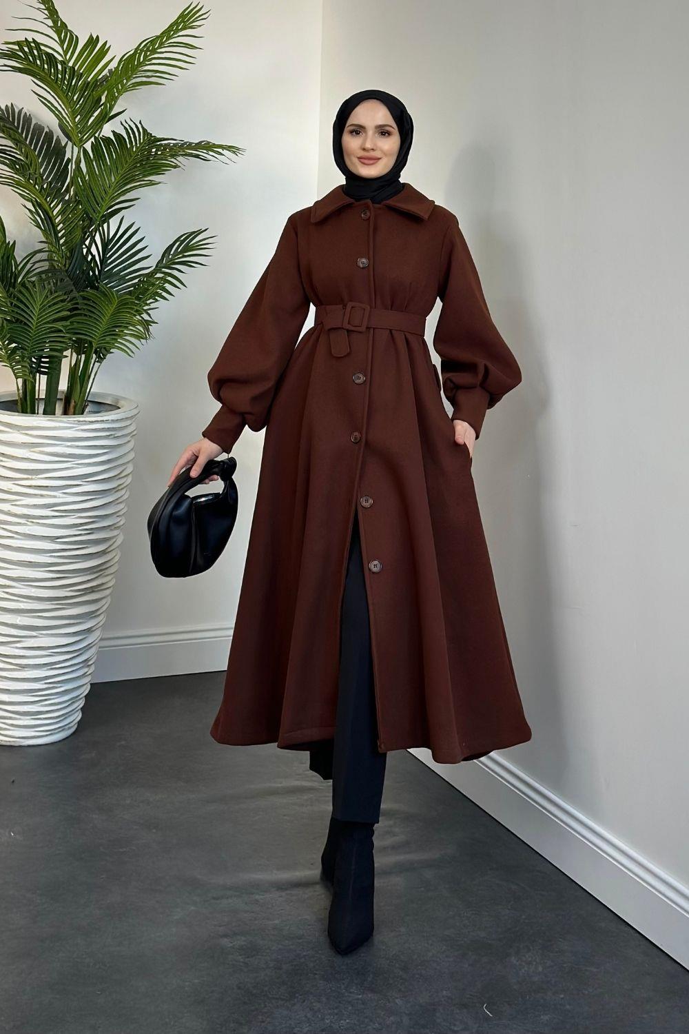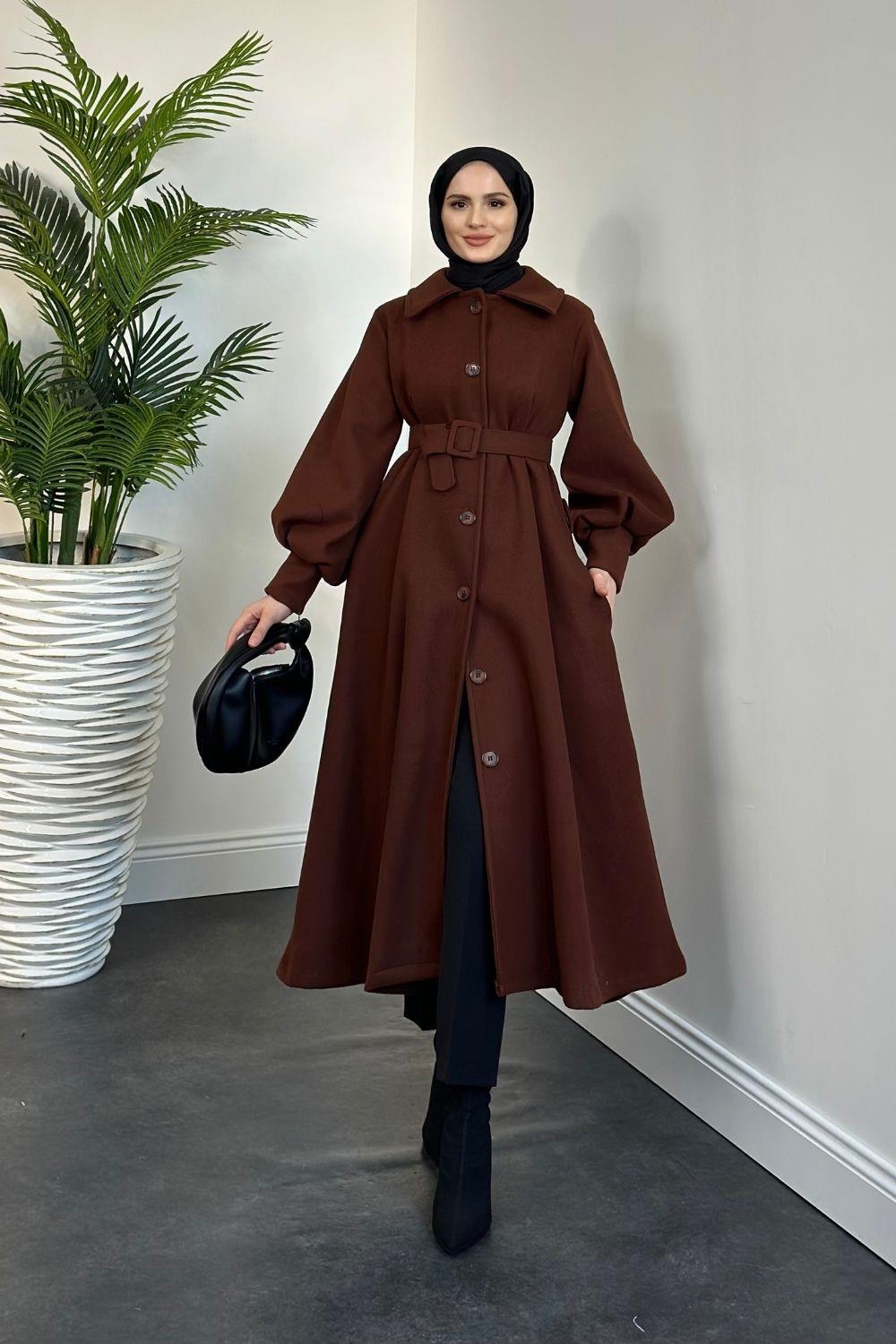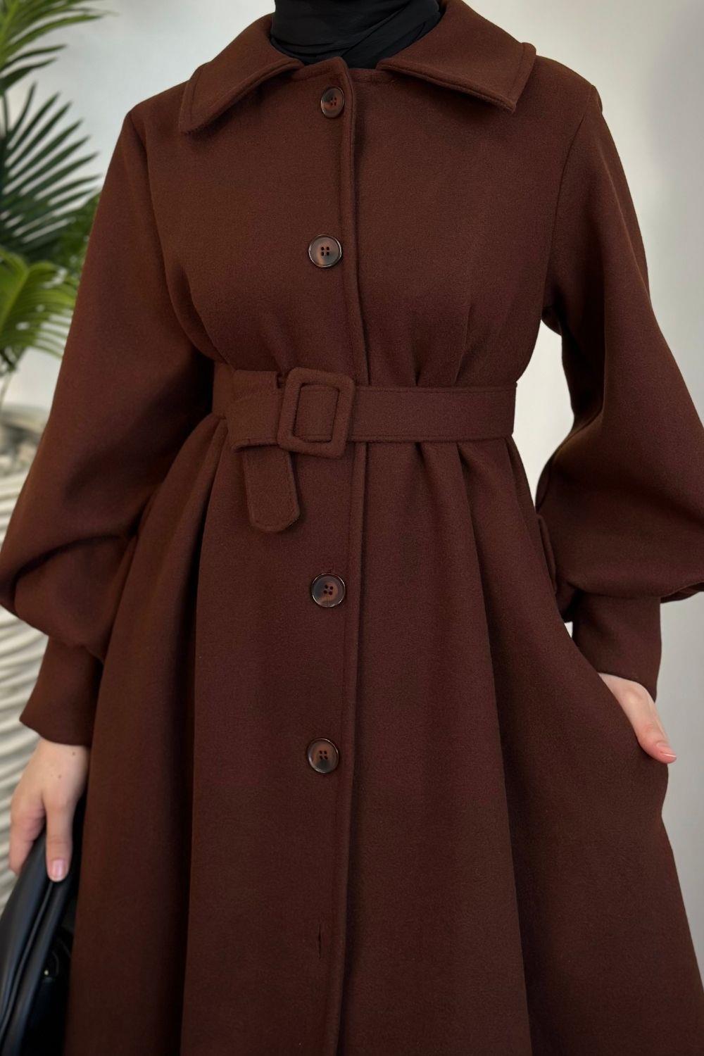 Valery Kolu Manşetli Kemerli Astarlı Kaşe Kaban Kahverengi