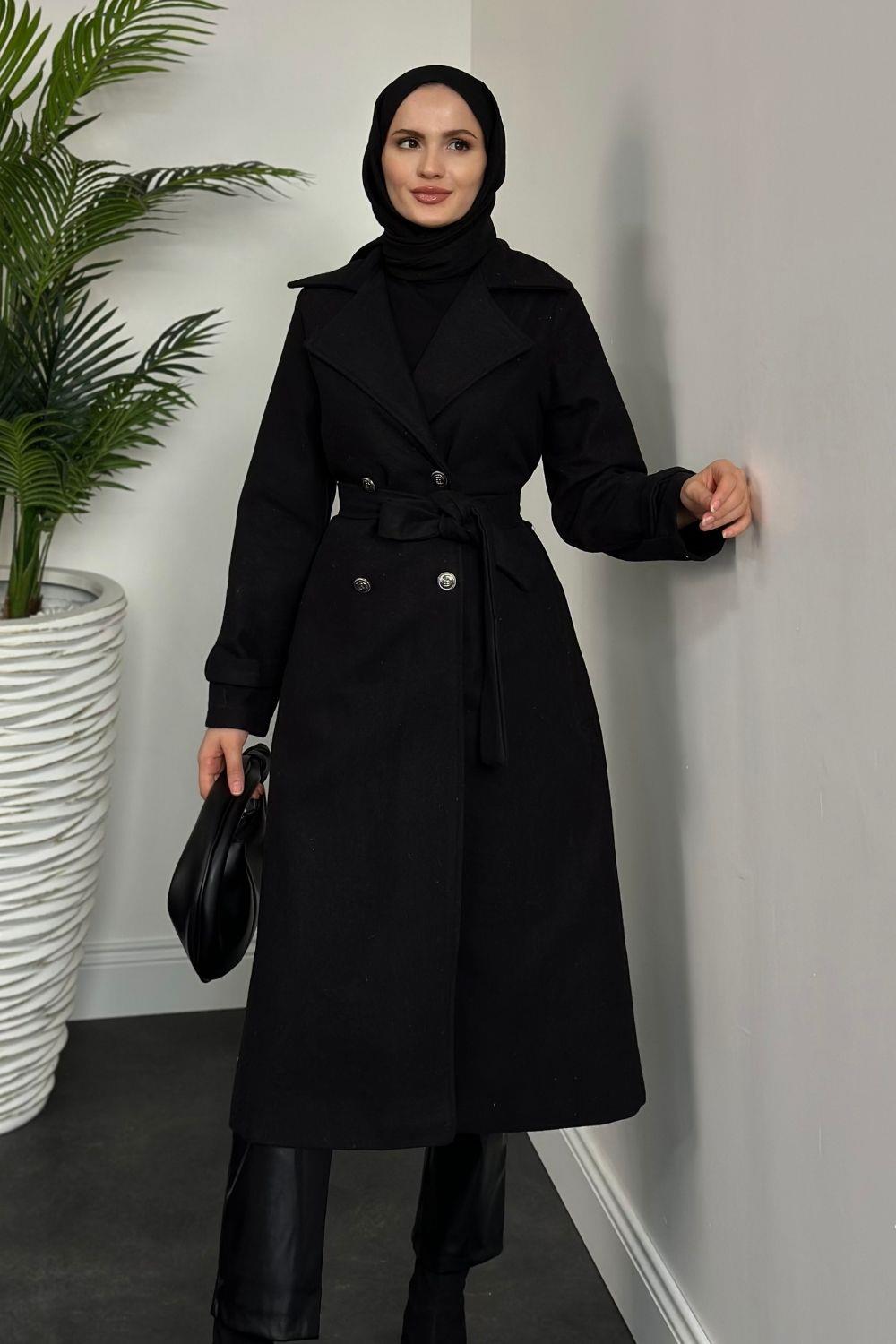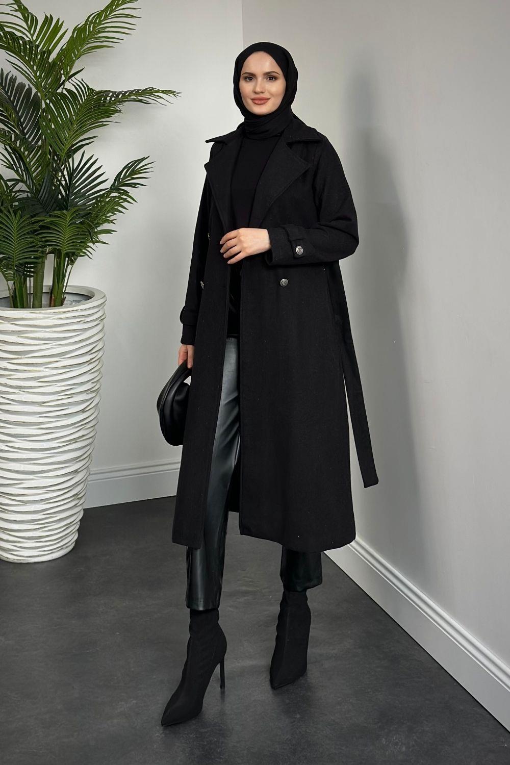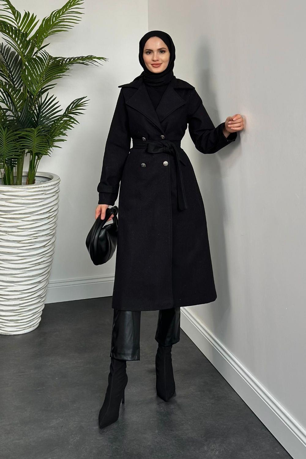 Desire Astarlı Düğmeli Kaşe Kaban Siyah