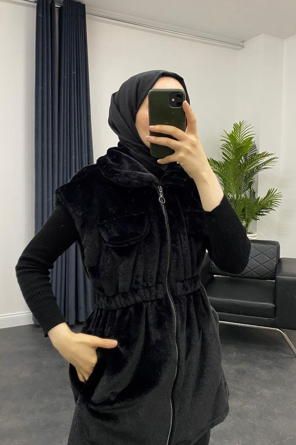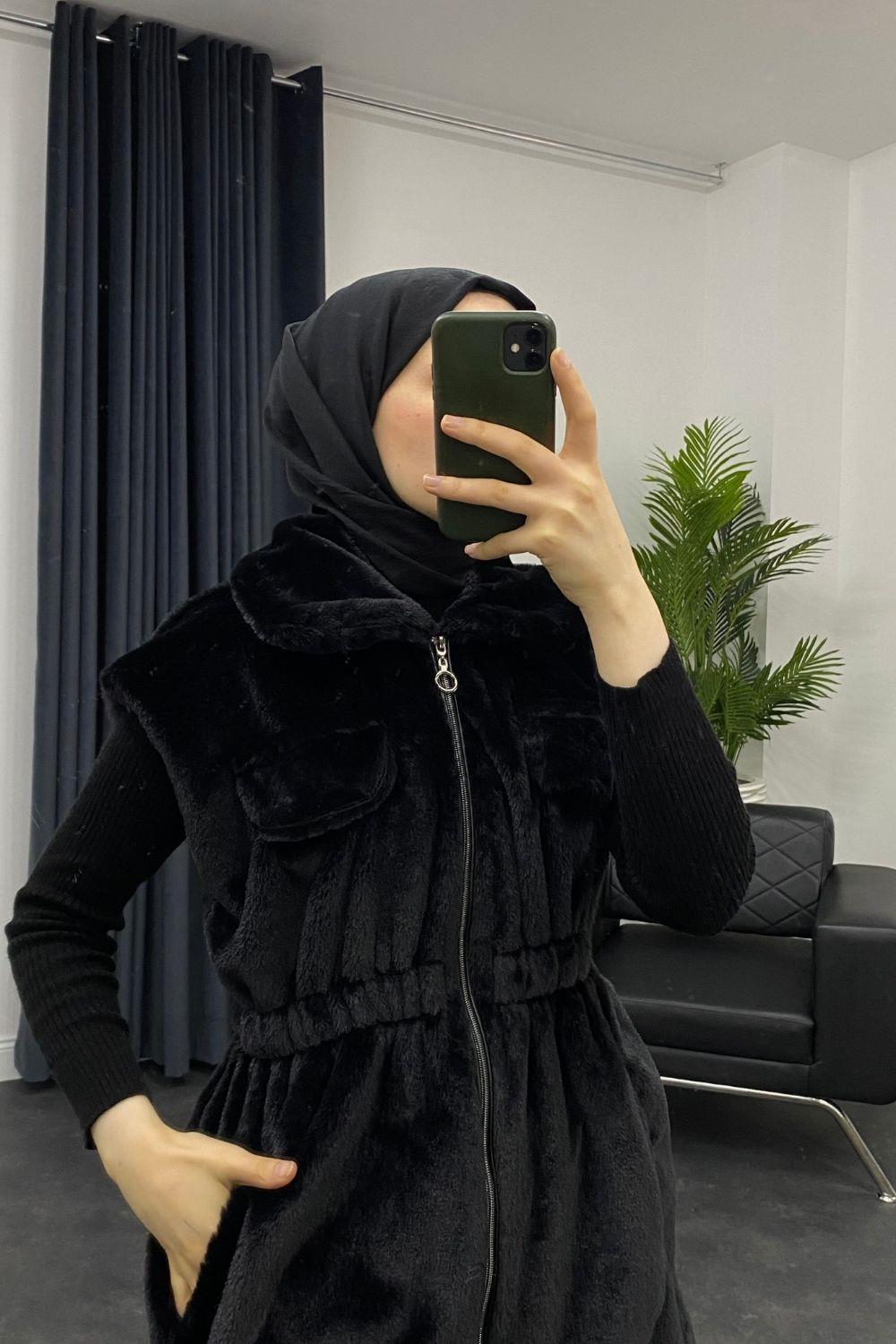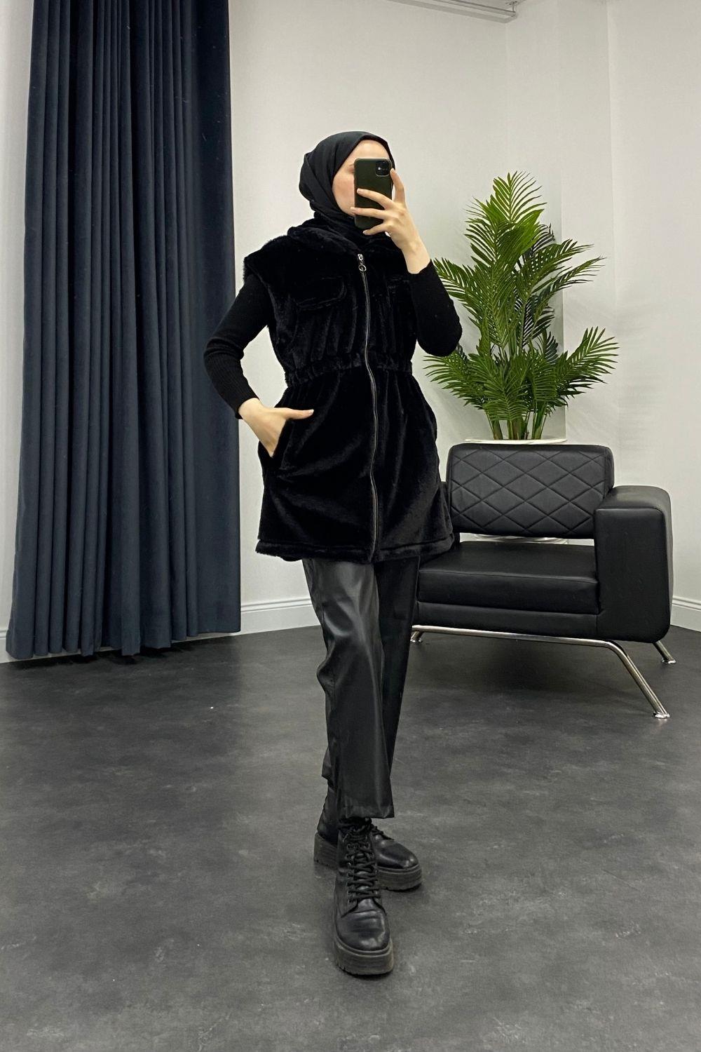 Fermuarlı Peluş Yelek Siyah