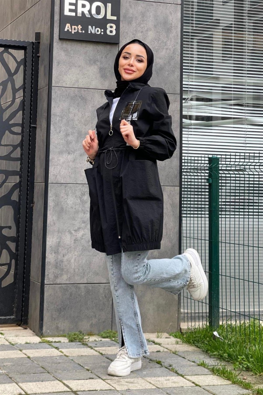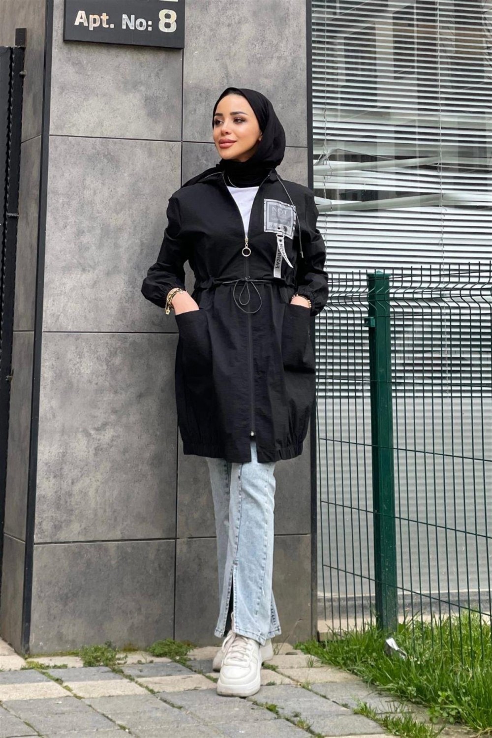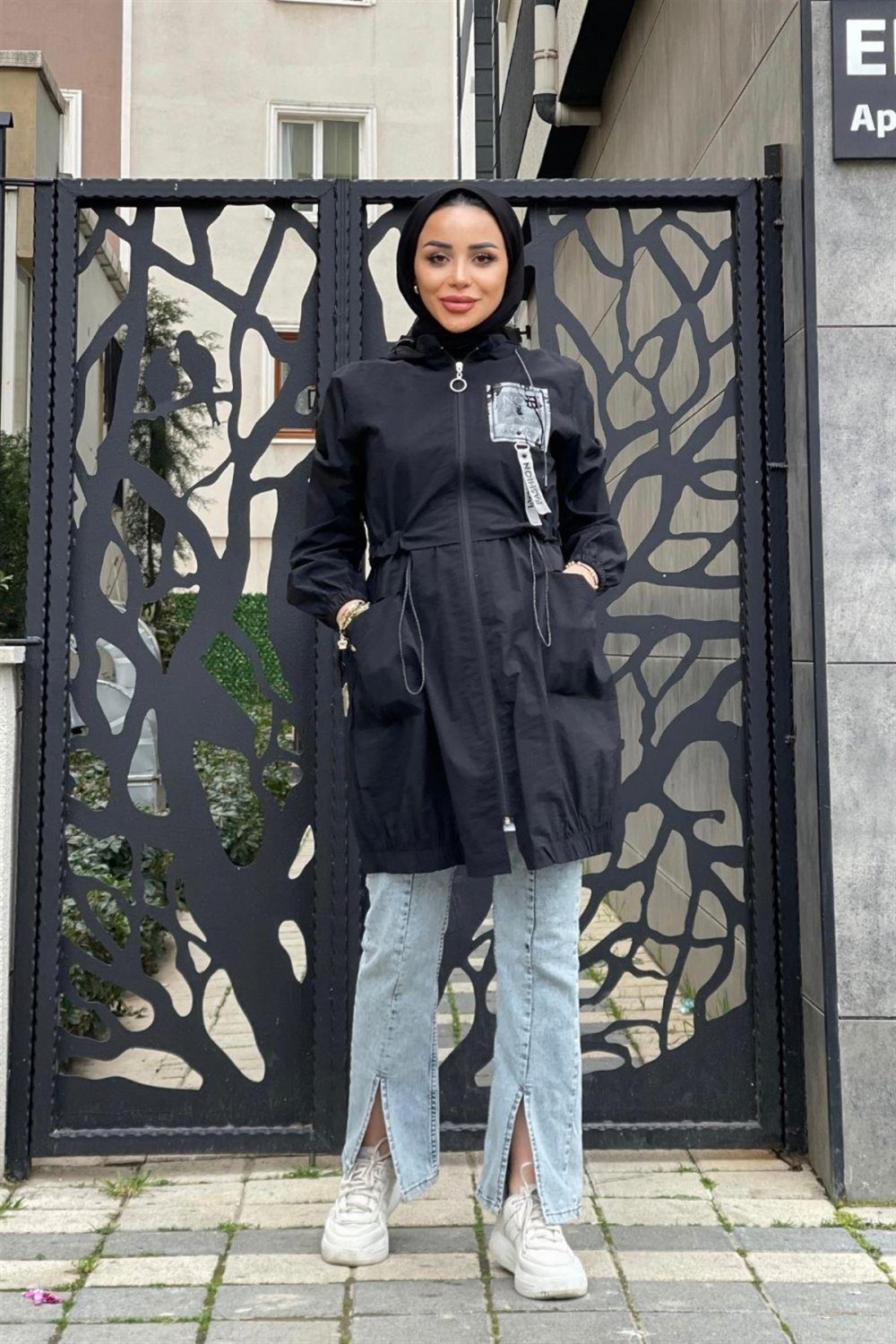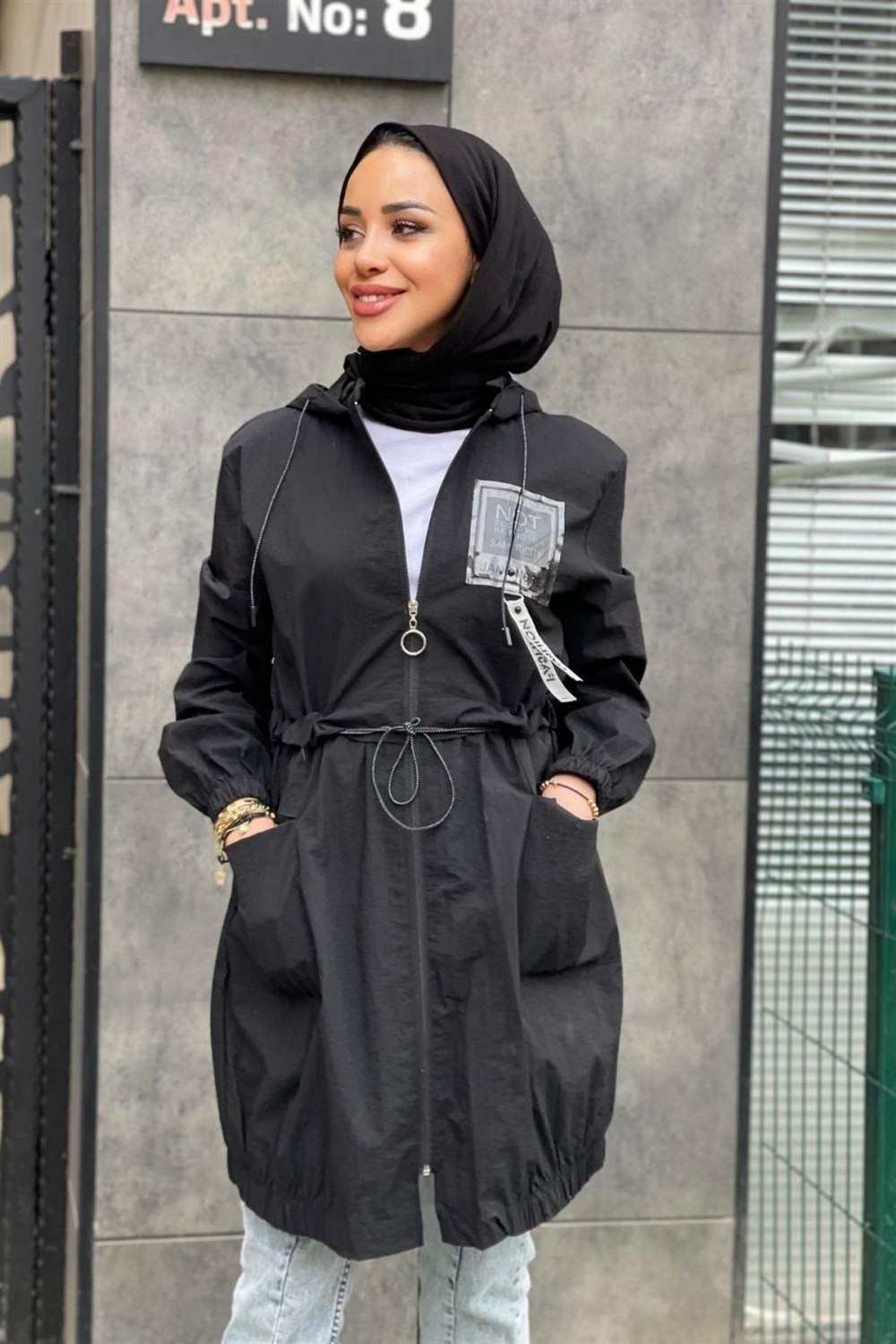 Fermuarlı Beli Büzgülü Yağmurluk Siyah