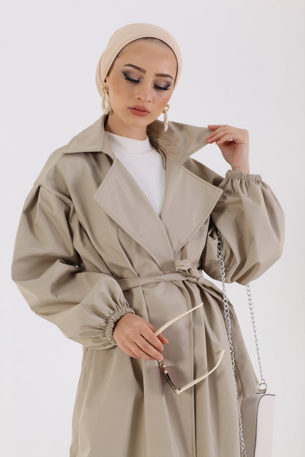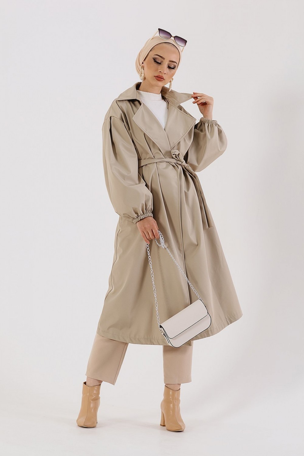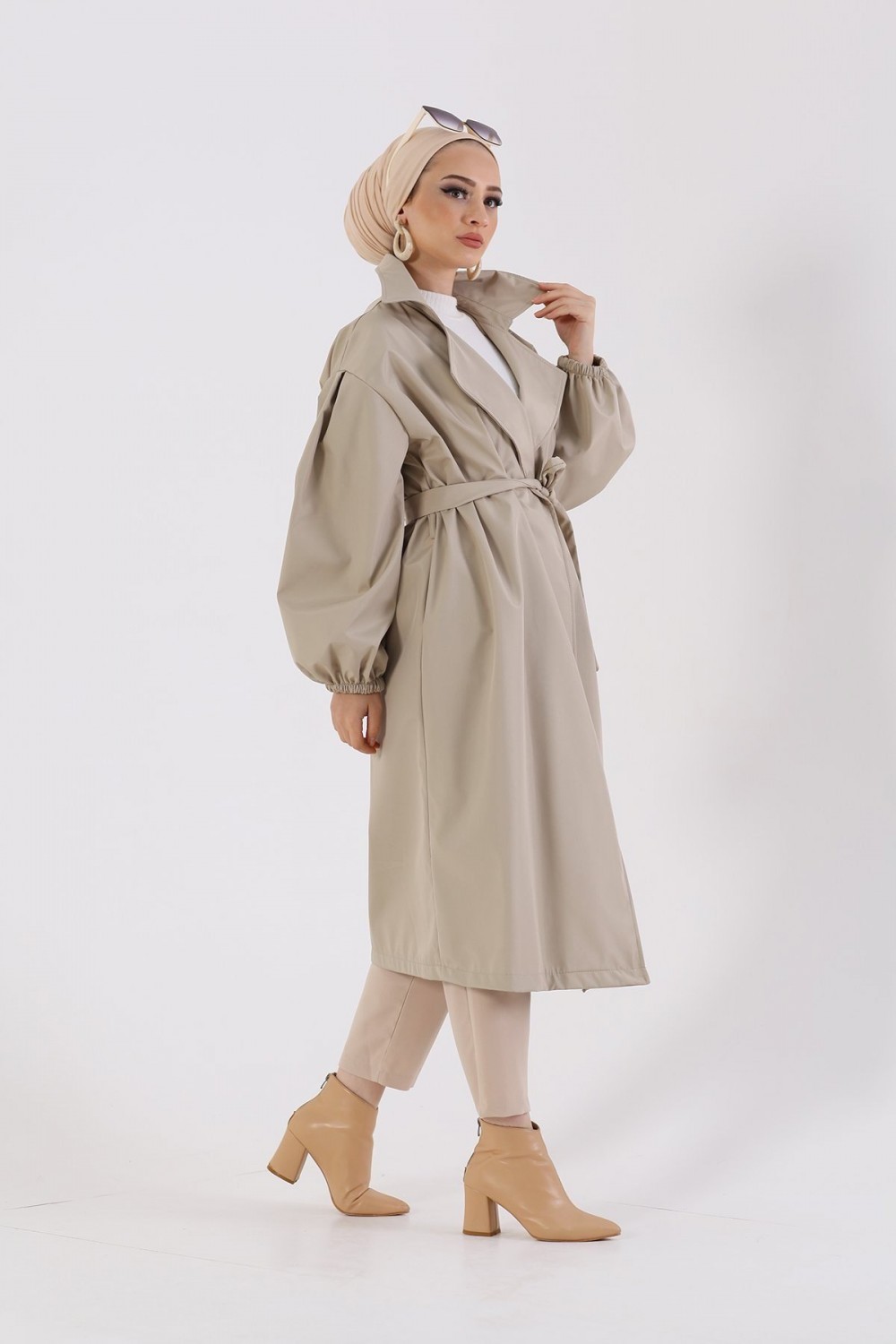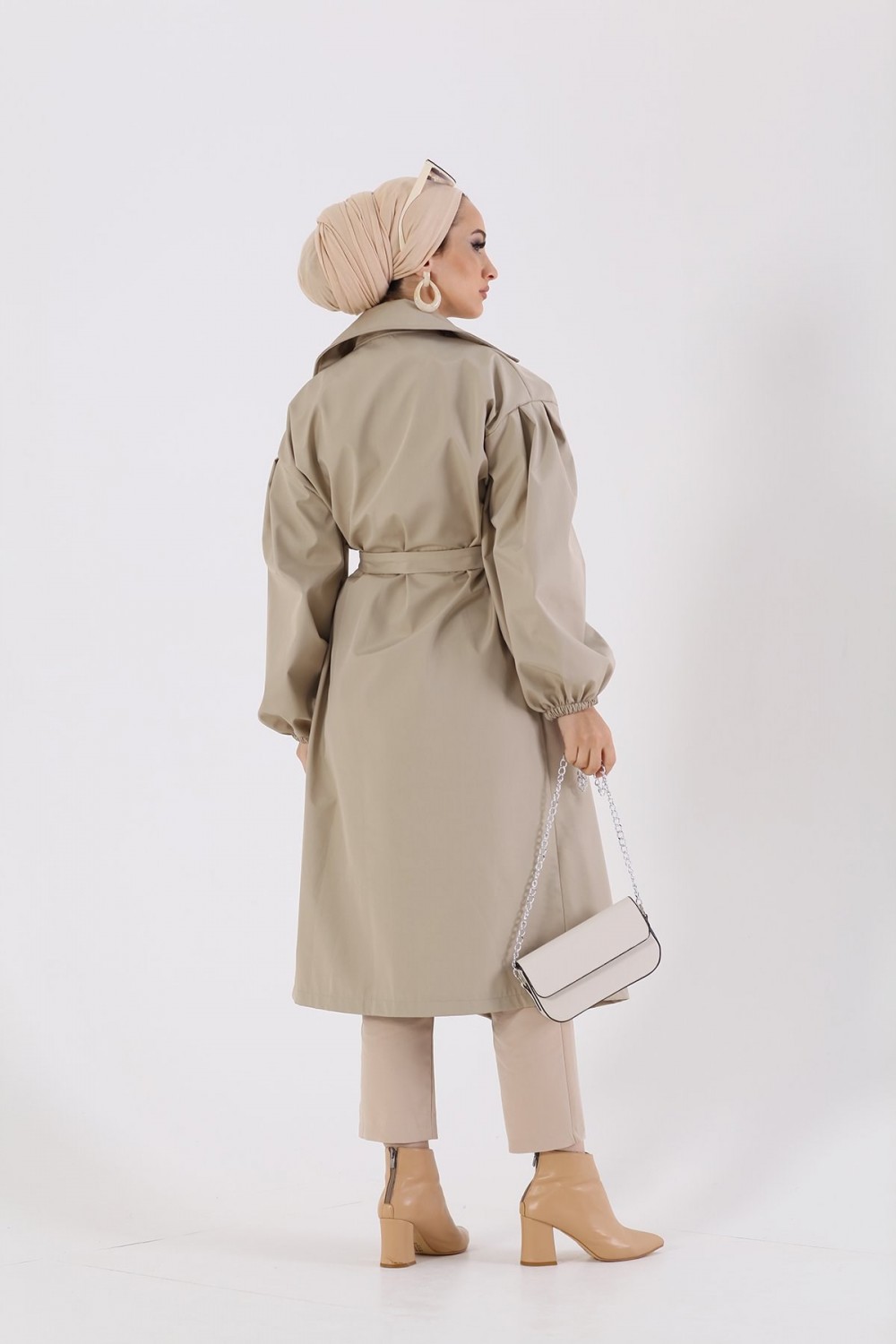 Balon Kol Belden Bağlamalı Trençkot Taş