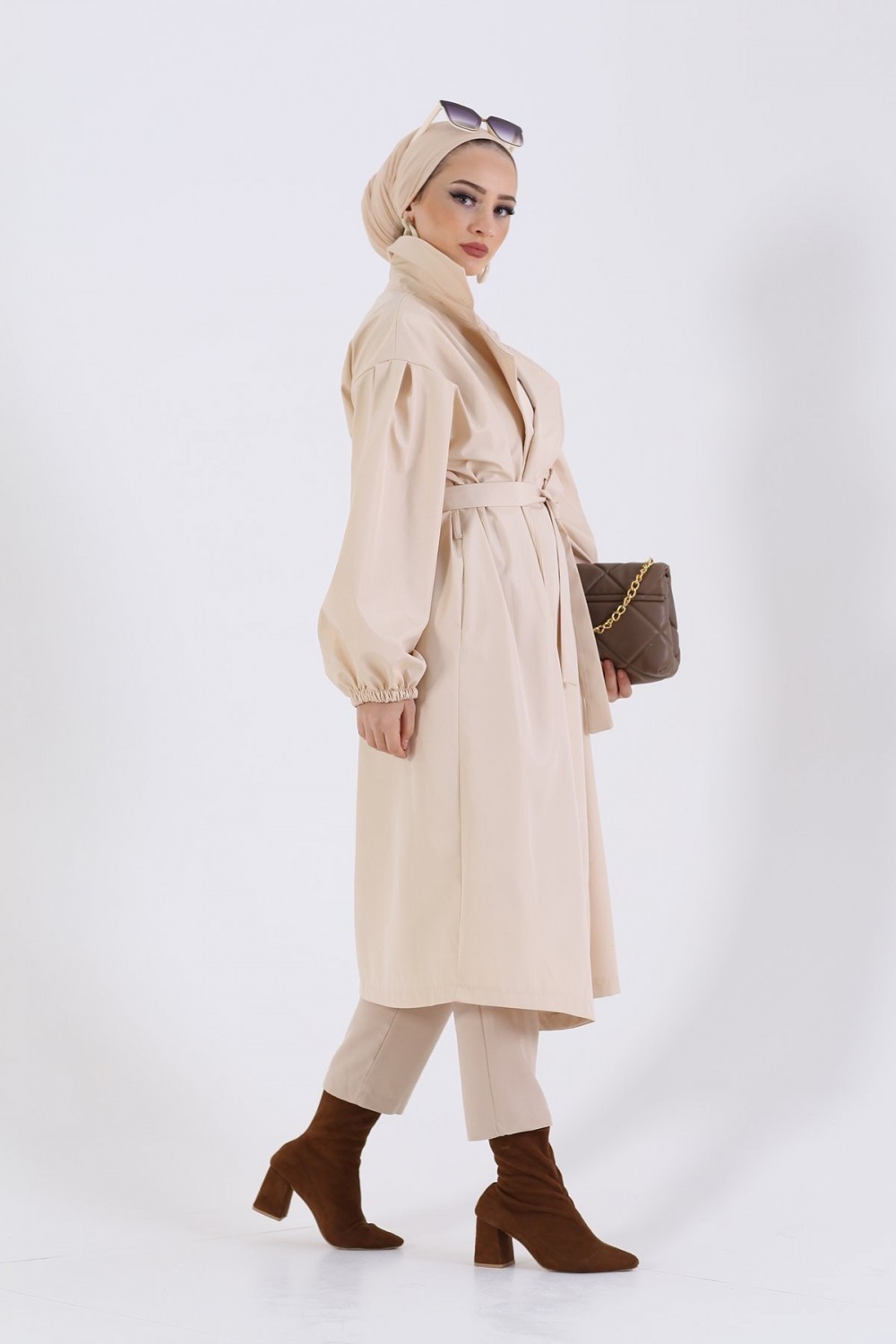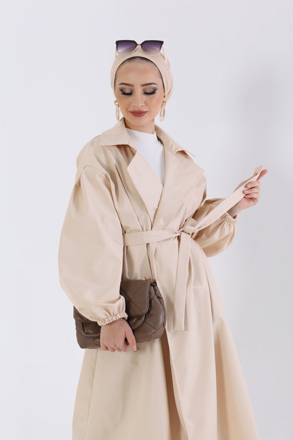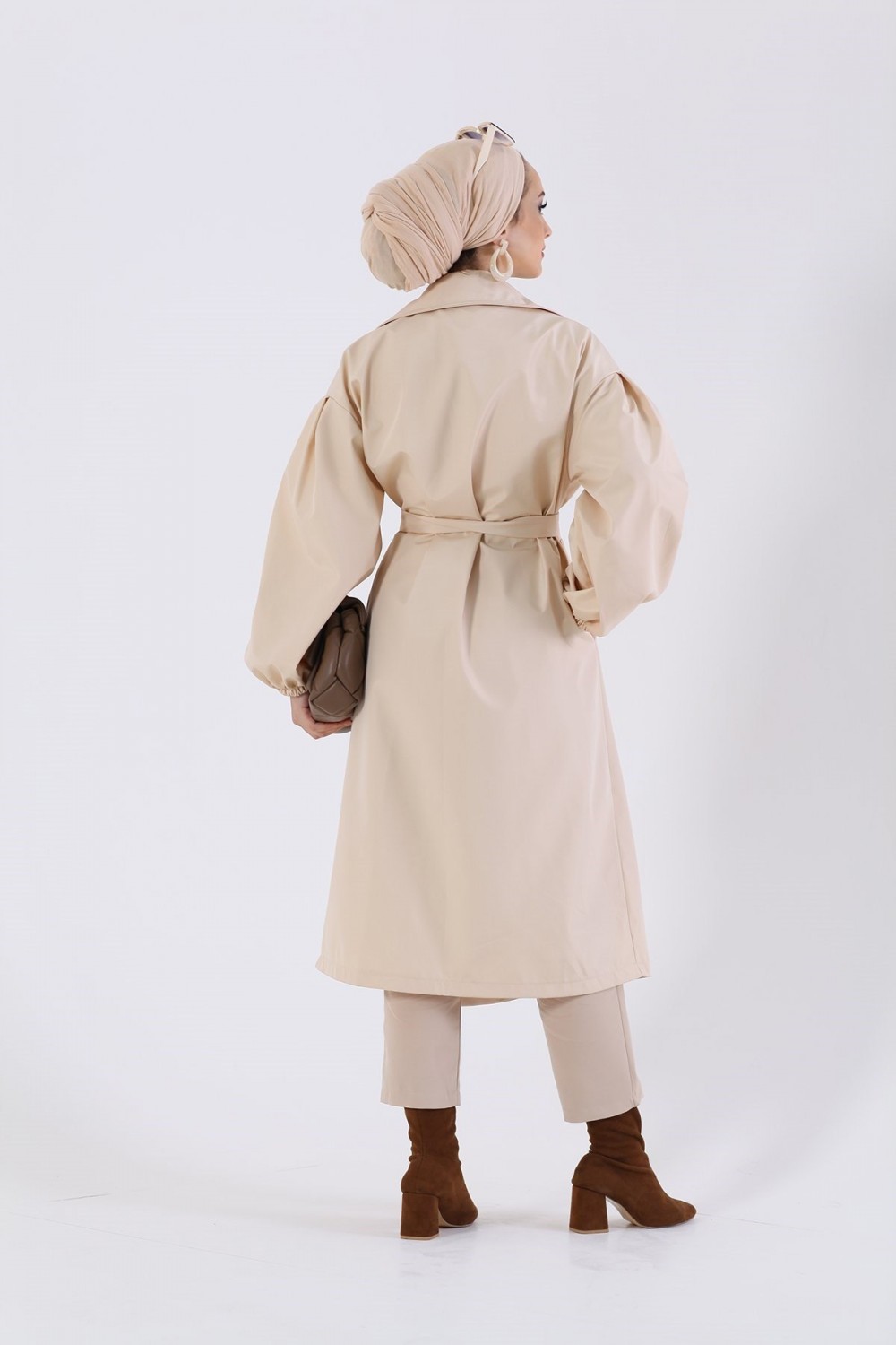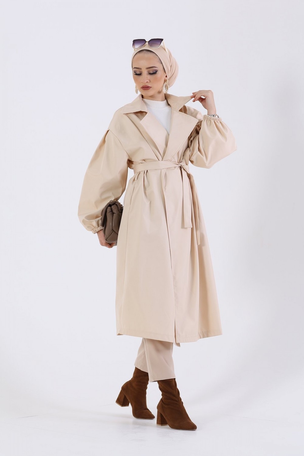 Balon Kol Belden Bağlamalı Trençkot Bej