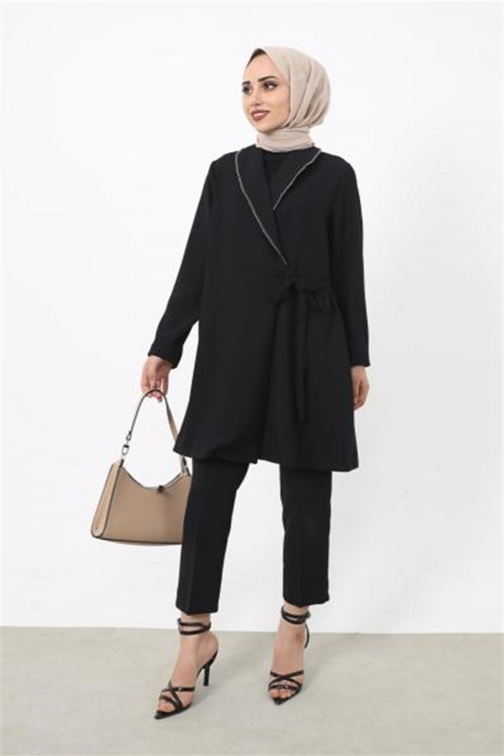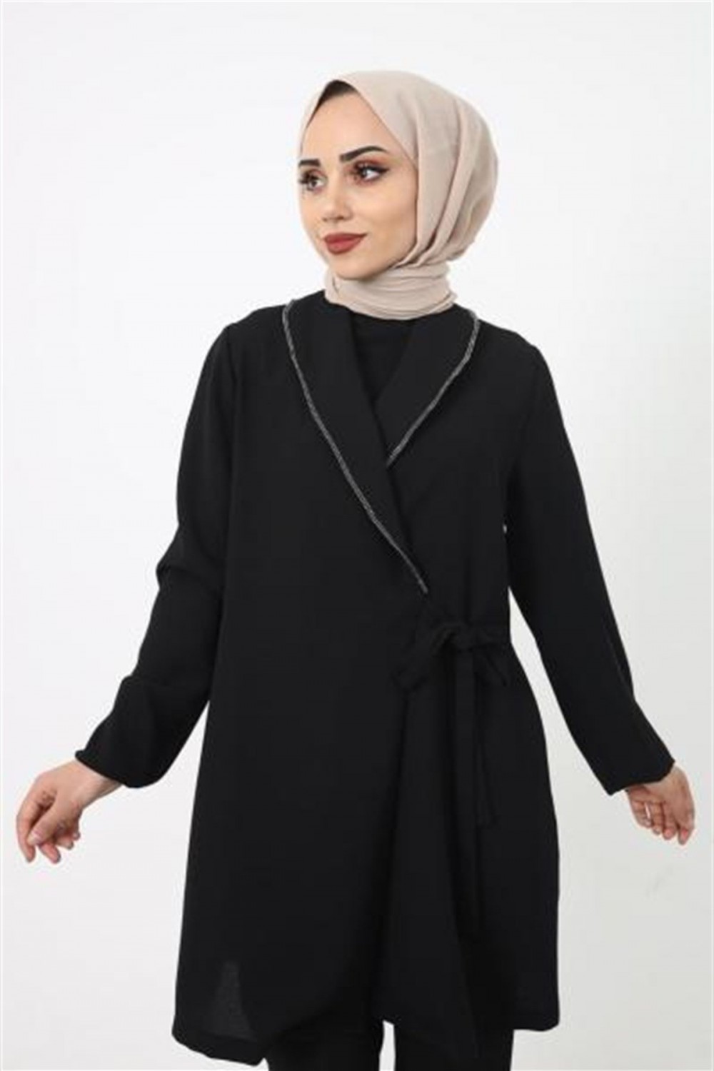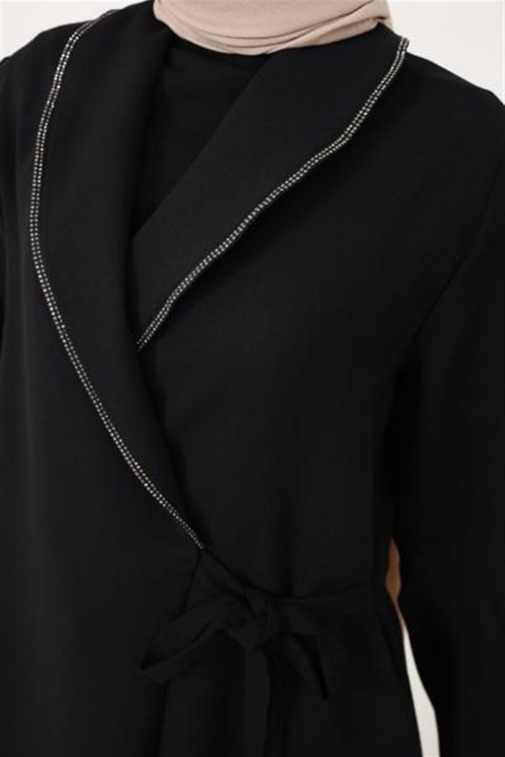 Önü İşlemeli Yandan Bağlamalı Ceket Siyah