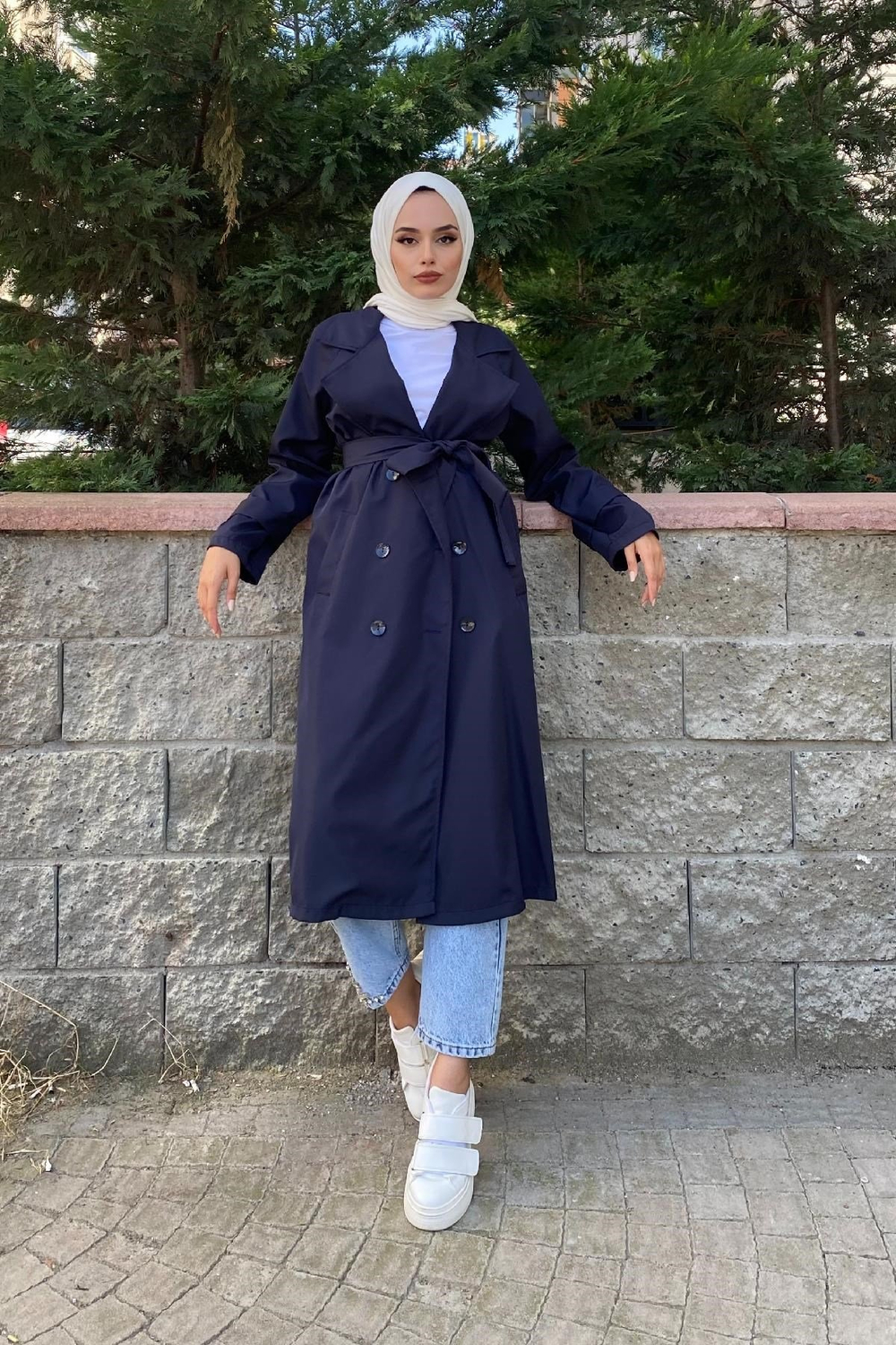 Kruvaze Yaka Düğmeli Trençkot Lacivert