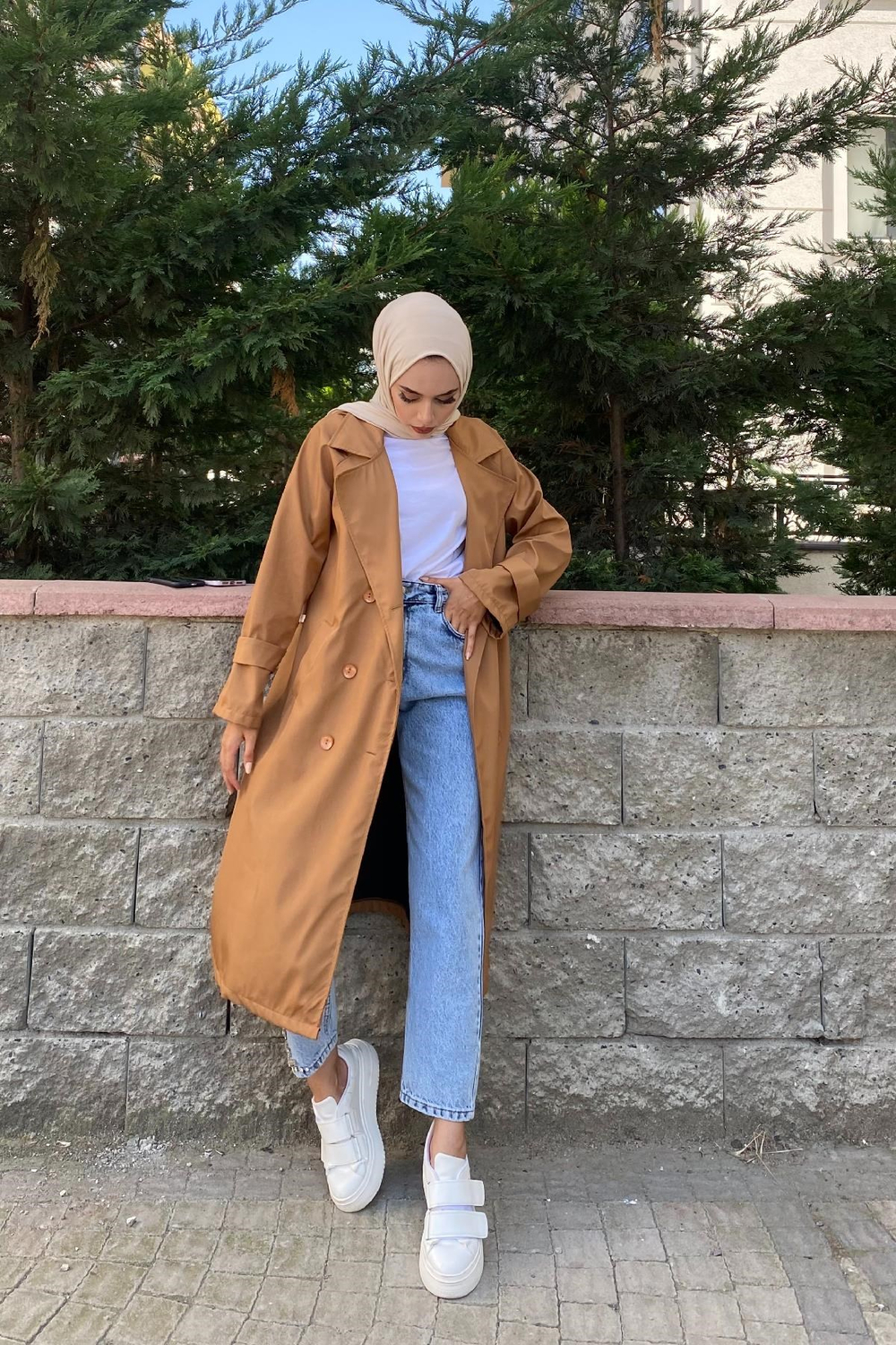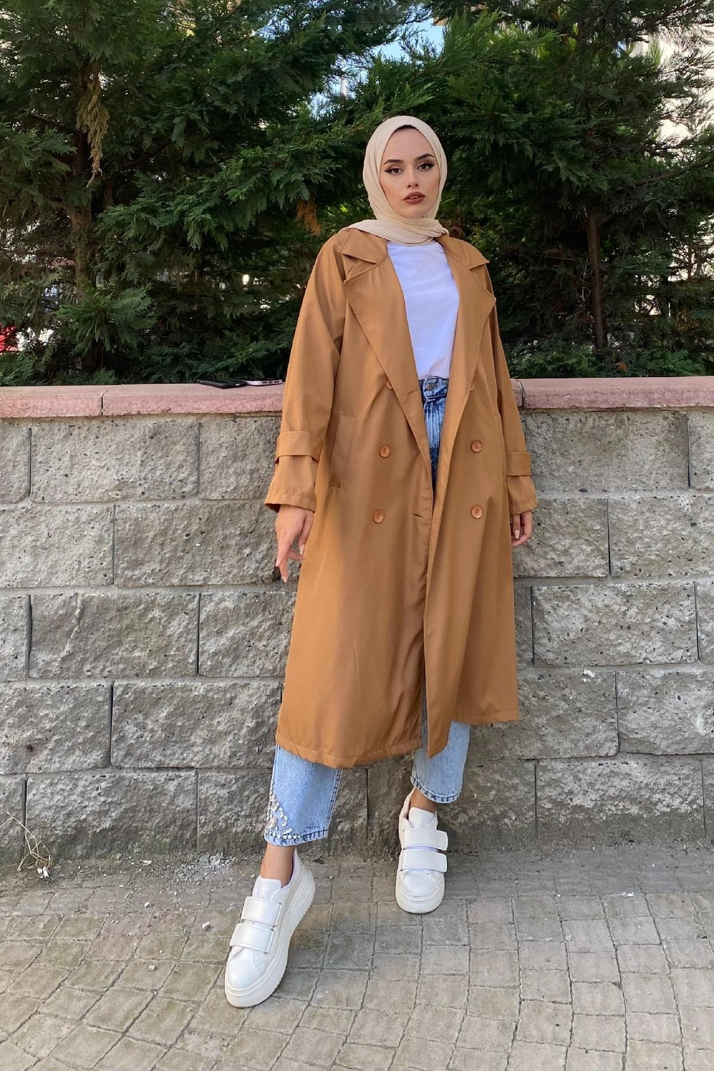 Kruvaze Yaka Düğmeli Trençkot Sütlü Kahve