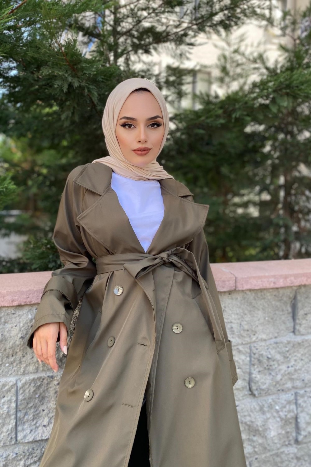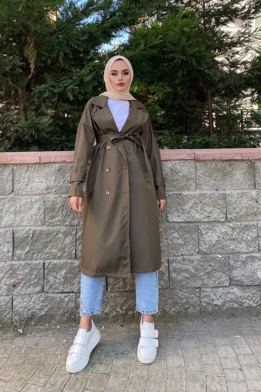 Kruvaze Yaka Düğmeli Trençkot Haki