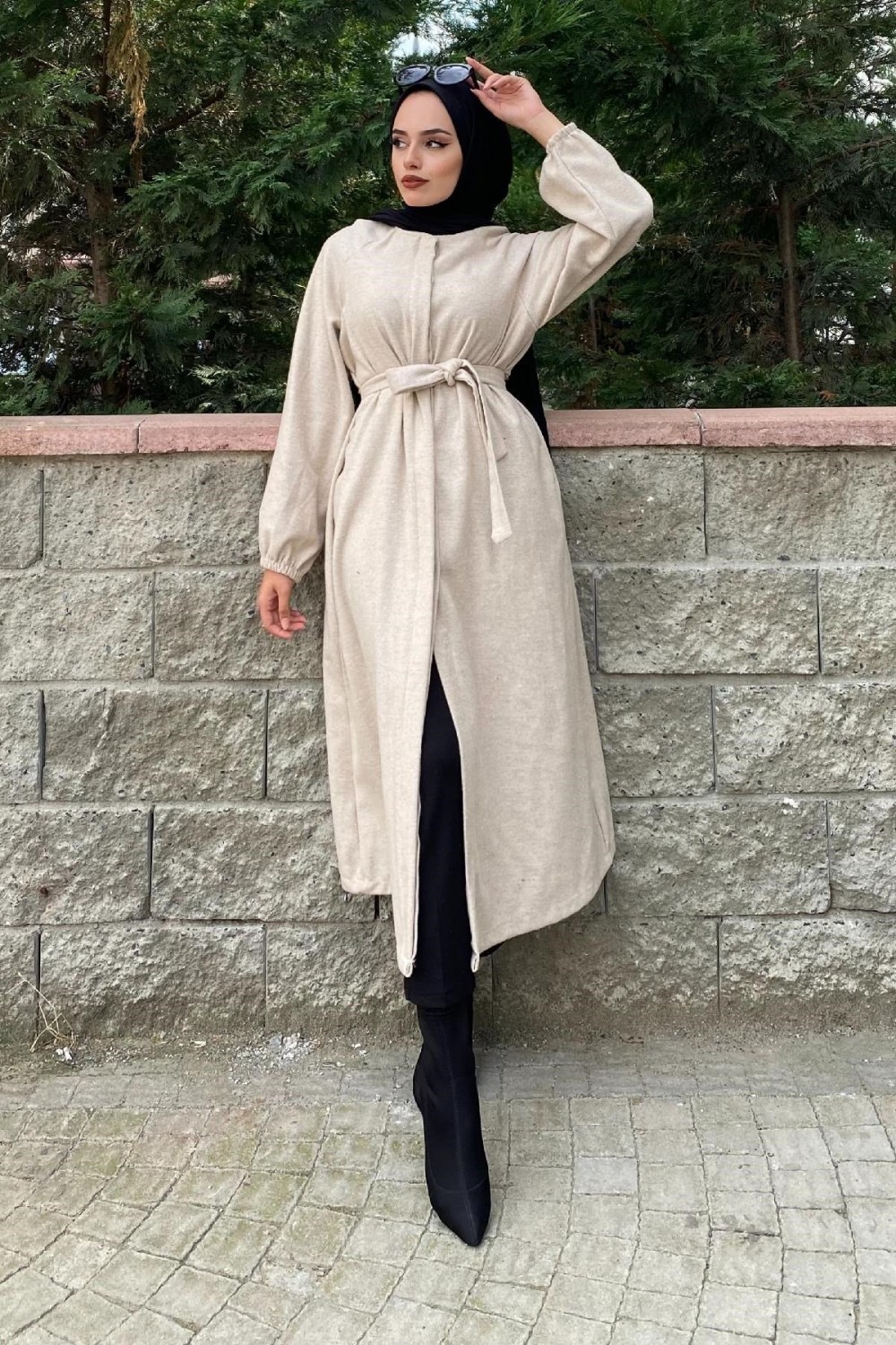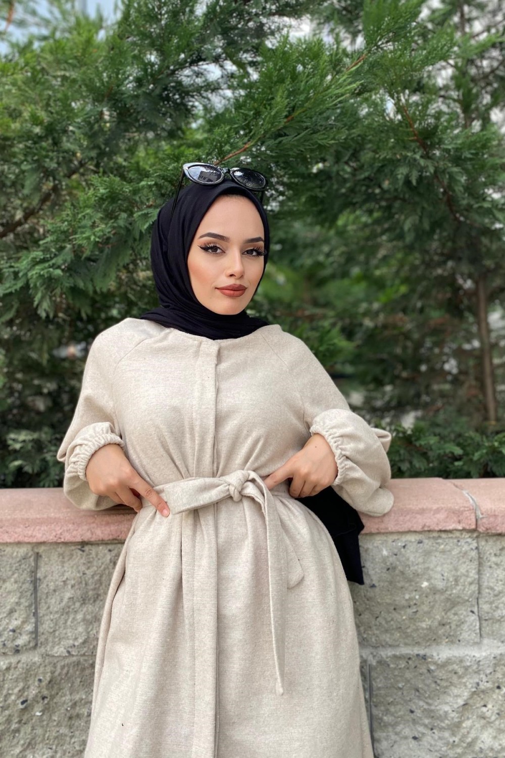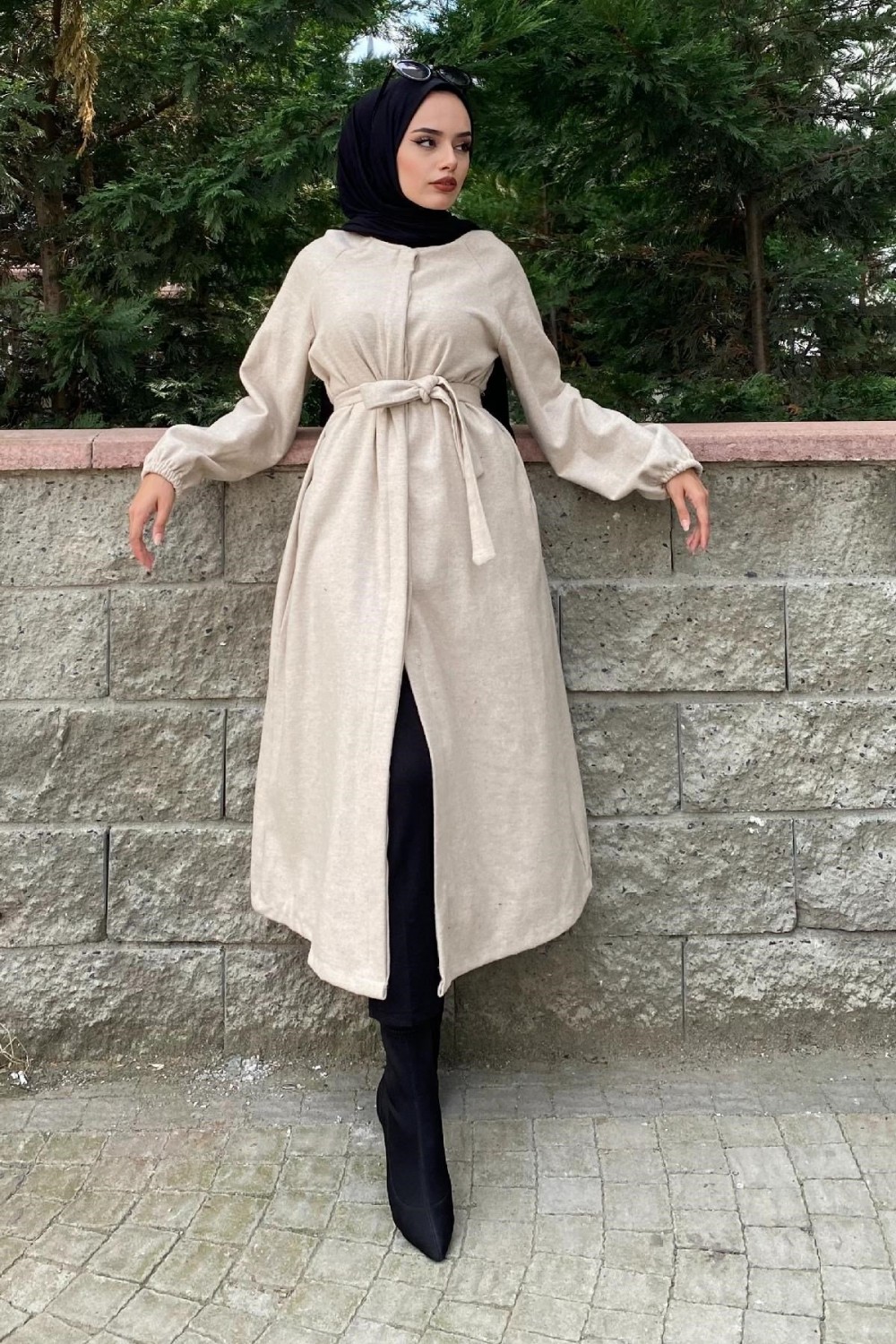 Kolu Lastikli Kuşaklı Kaşe Kaban Bej