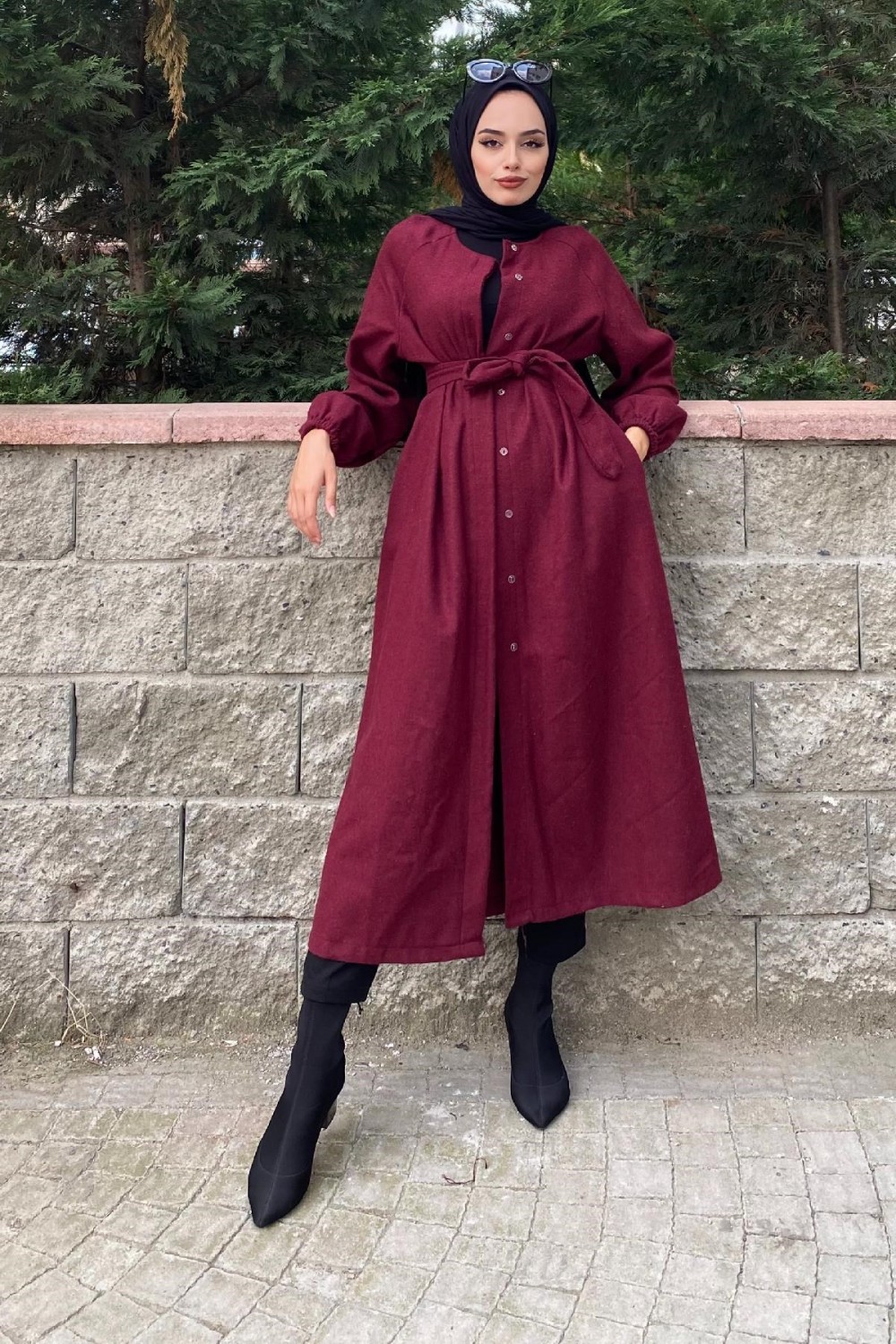 Kolu Lastikli Kuşaklı Kaşe Kaban Bordo