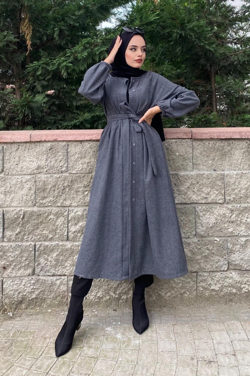 Kolu Lastikli Kuşaklı Kaşe Kaban Gri