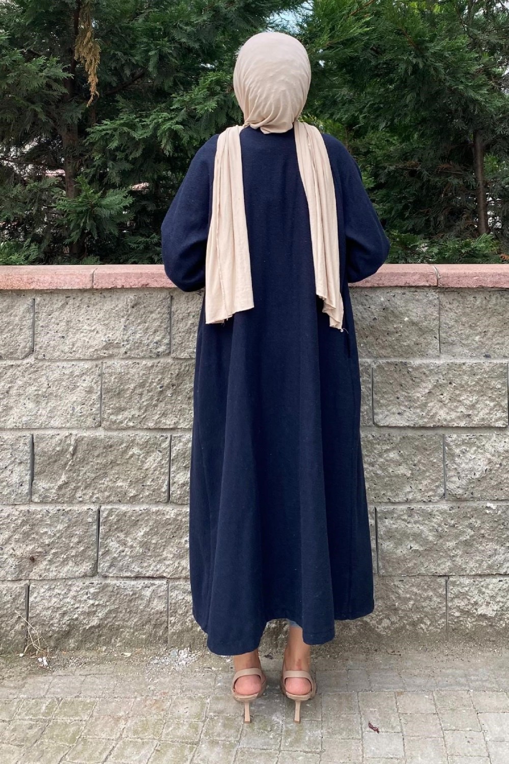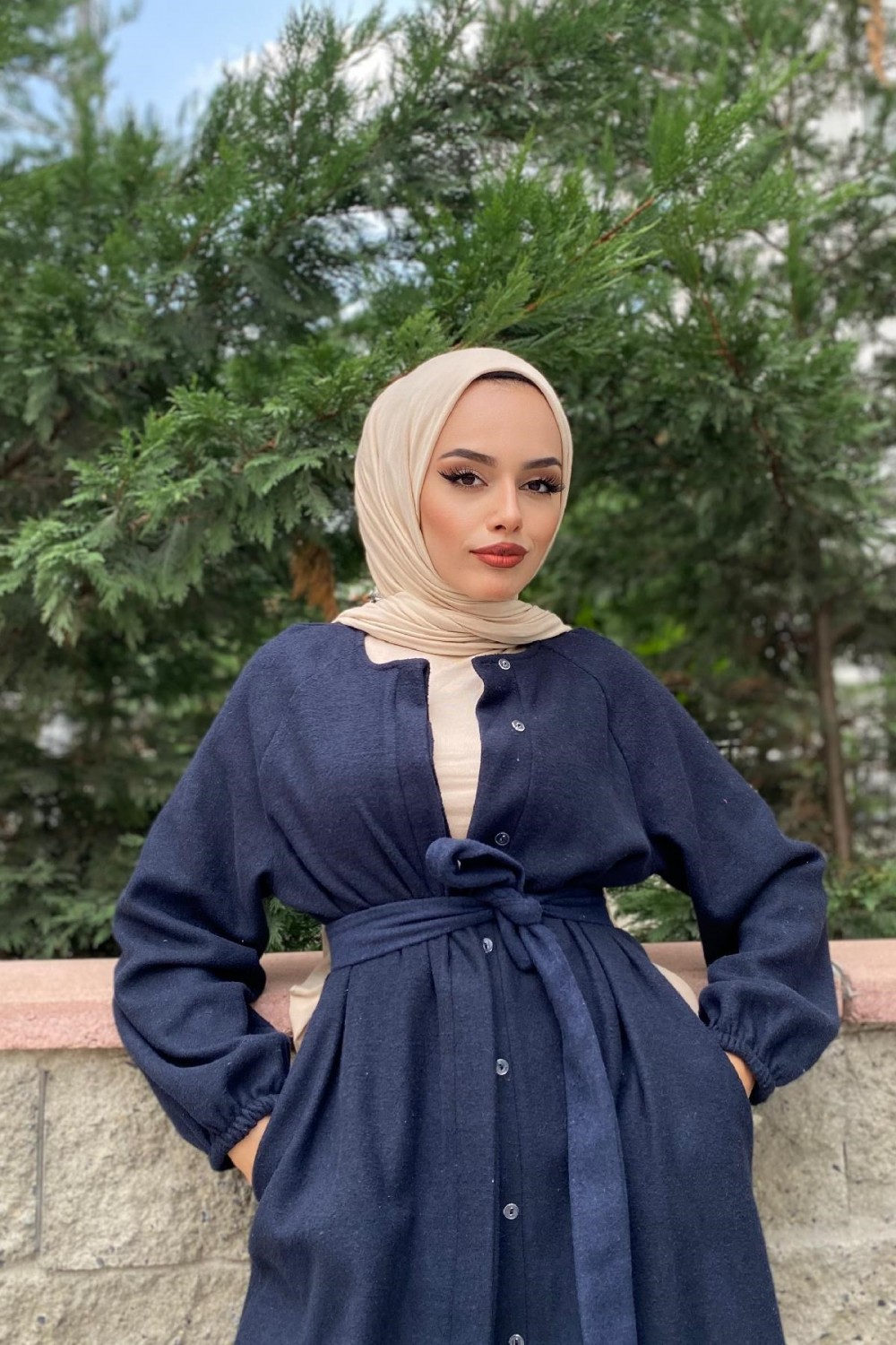 Kolu Lastikli Kuşaklı Kaşe Kaban Lacivert