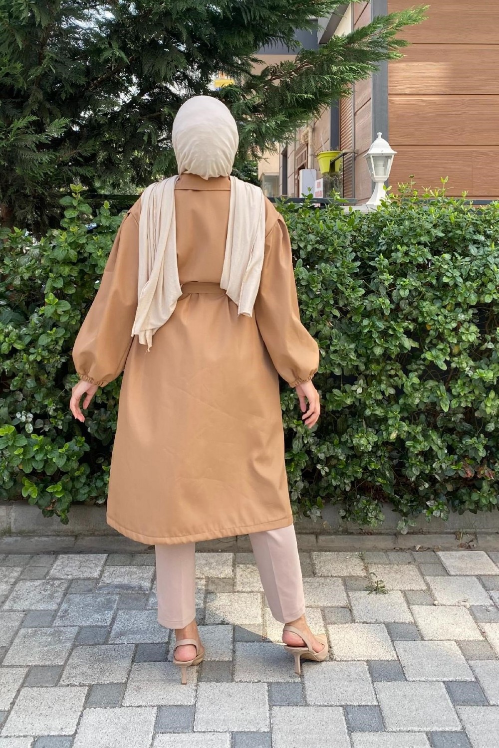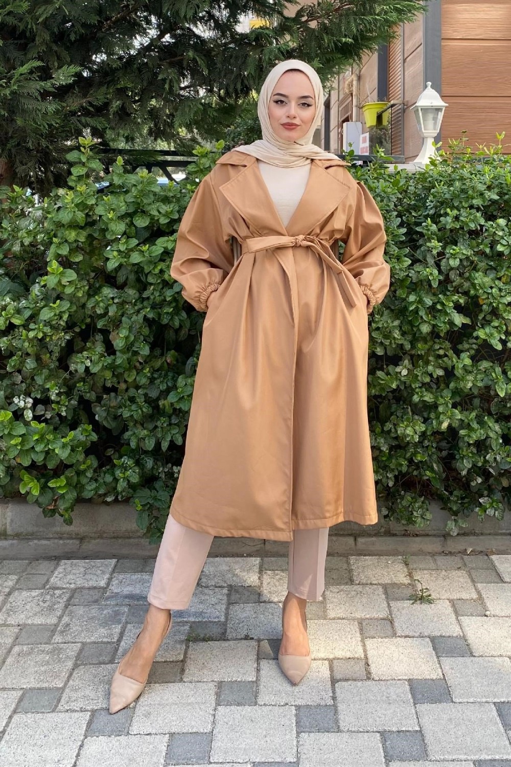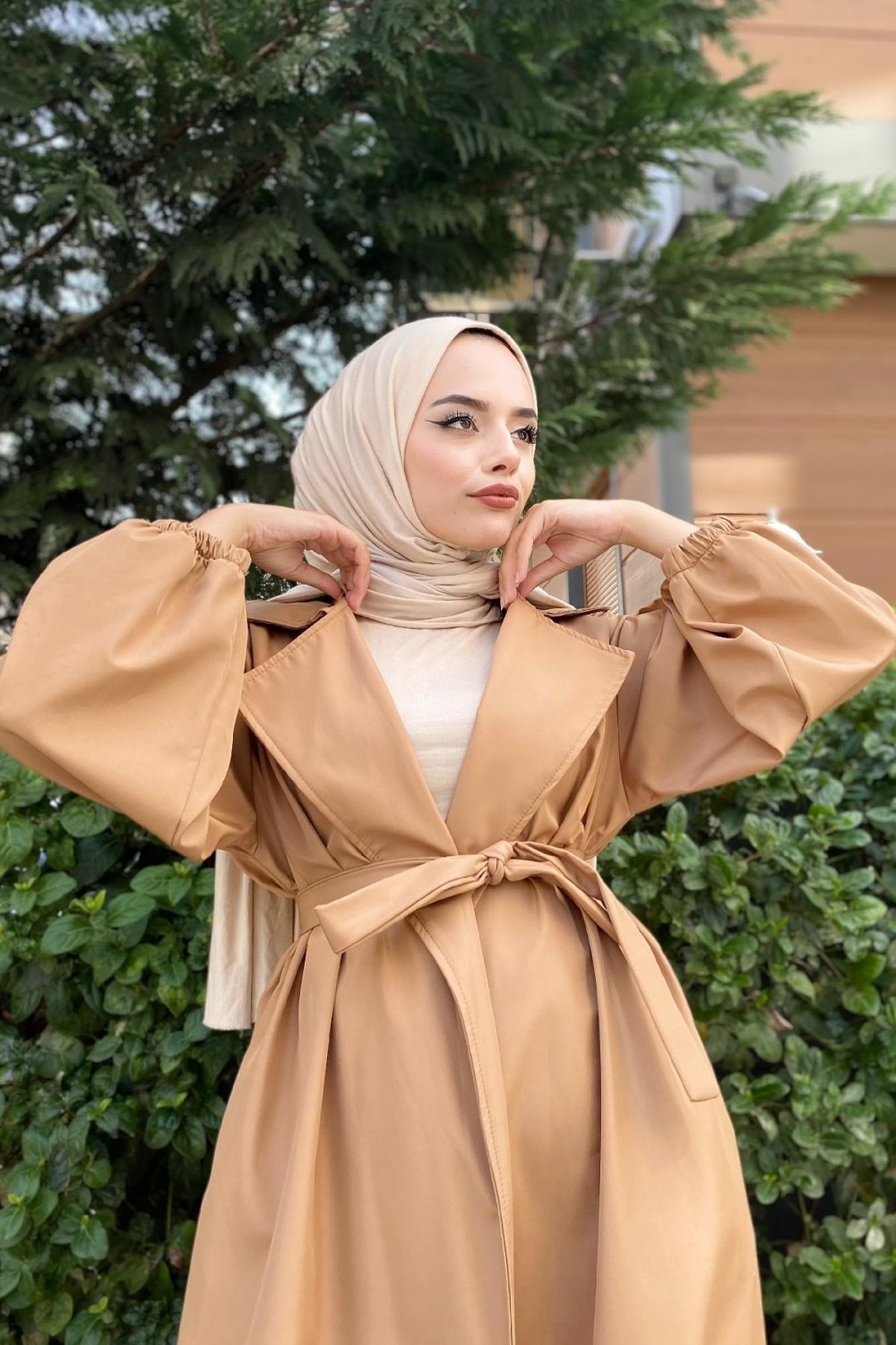Balon Kol Belden Bağlamalı Trençkot Sütlü Kahve