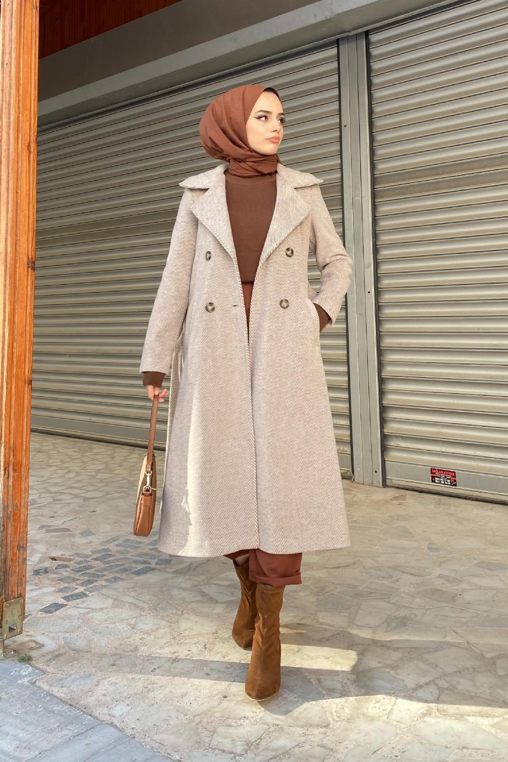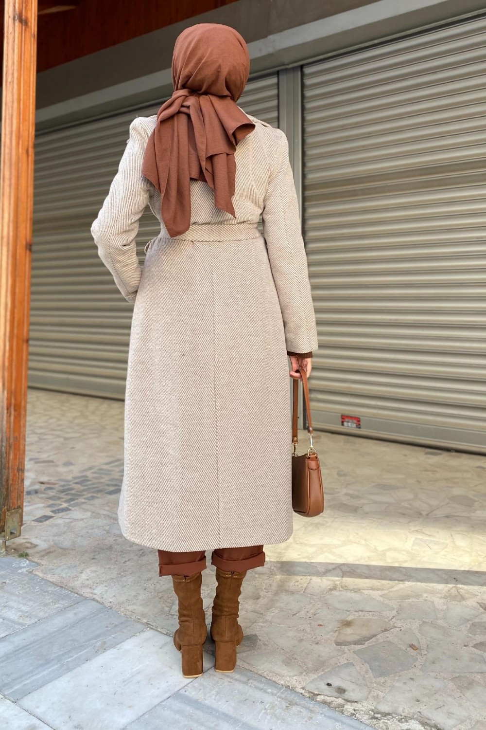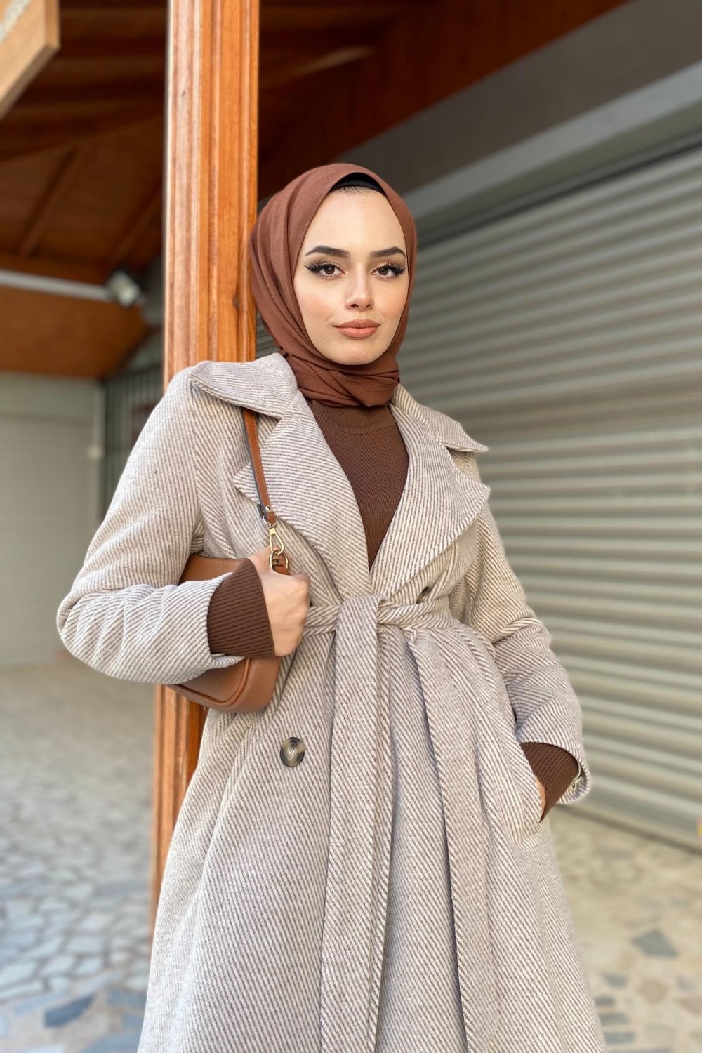 Kendinden Çizgili Kuşaklı Kaban Bej