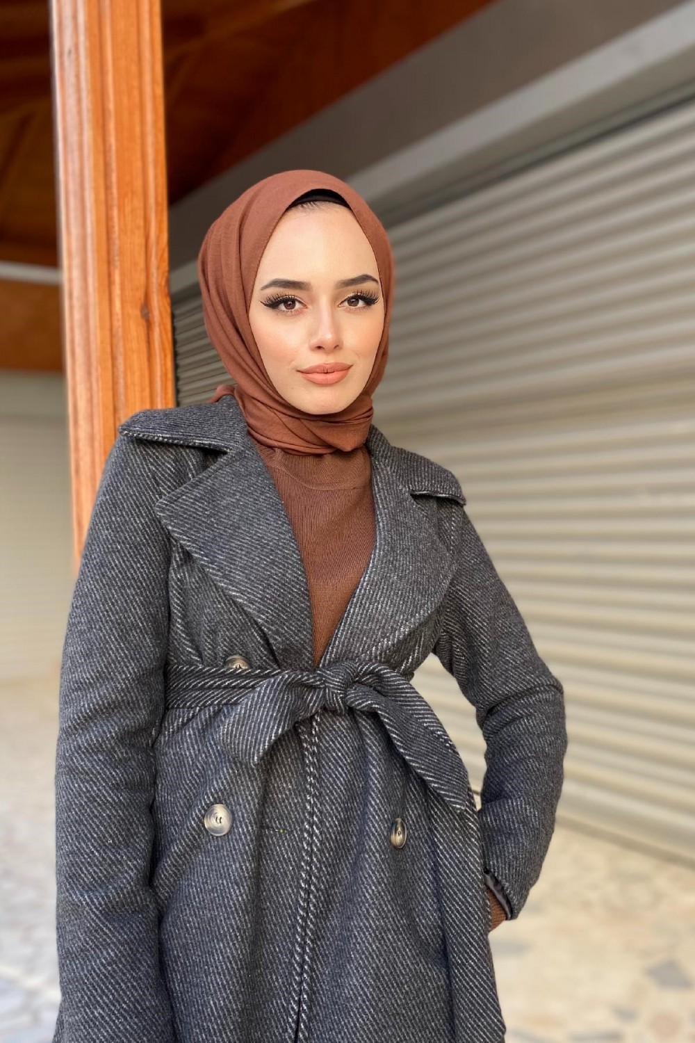 Kendinden Çizgili Kuşaklı Kaban Siyah
