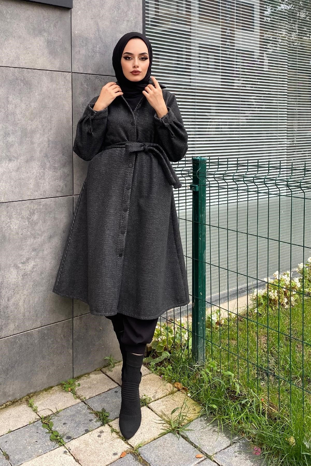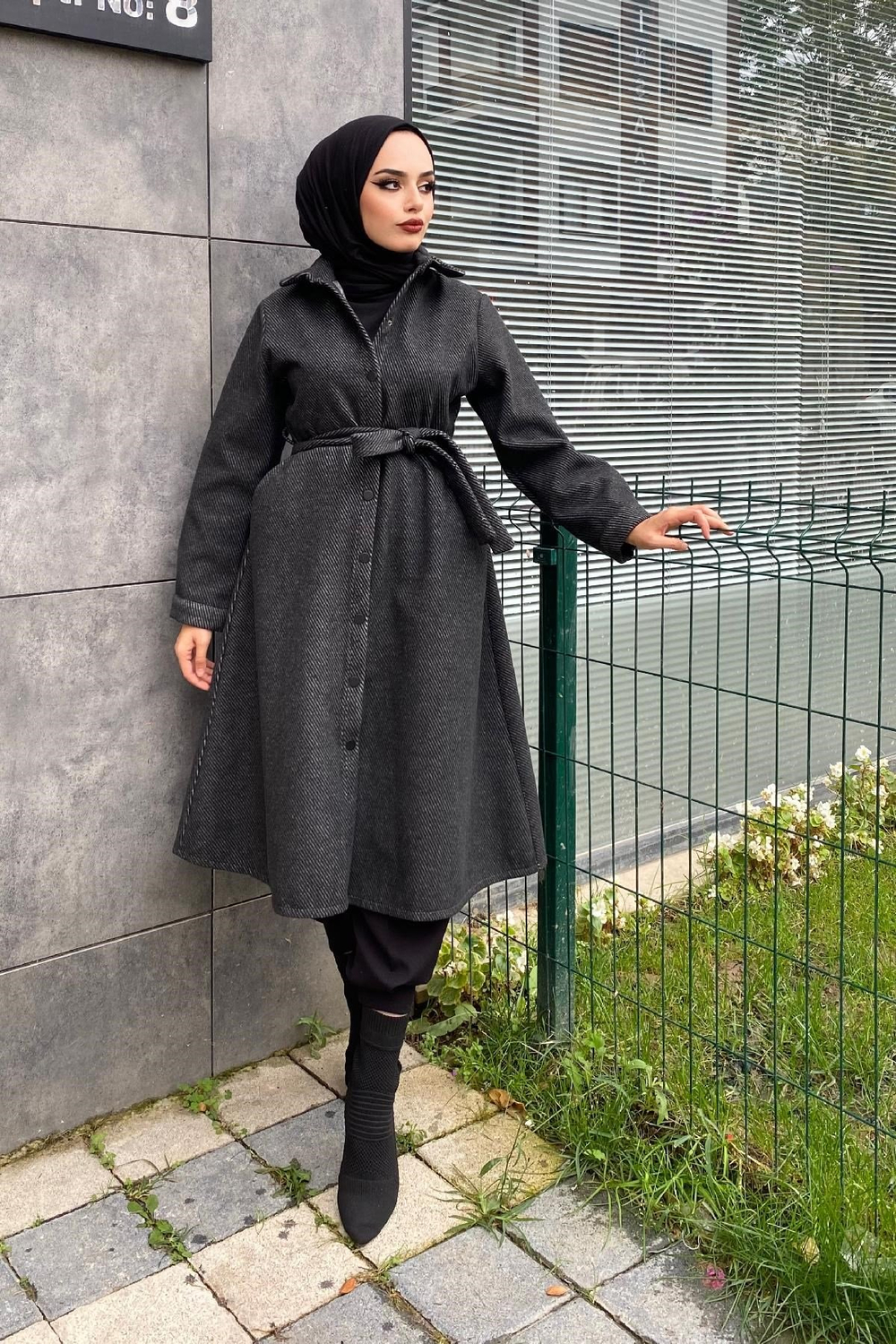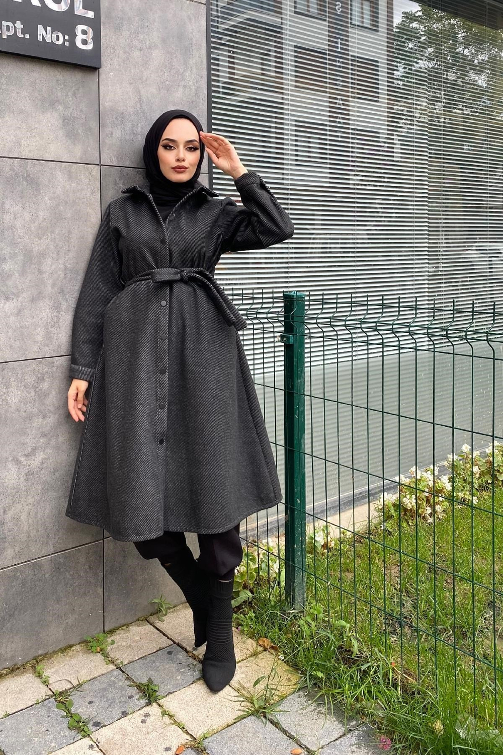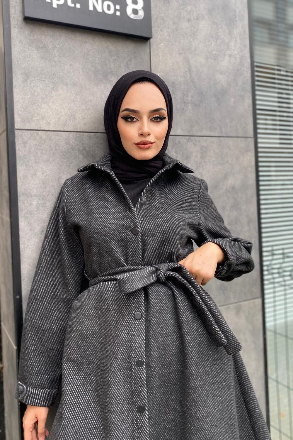 Çizgili Boydan Çıtçıtlı Kaşe Kaban Füme