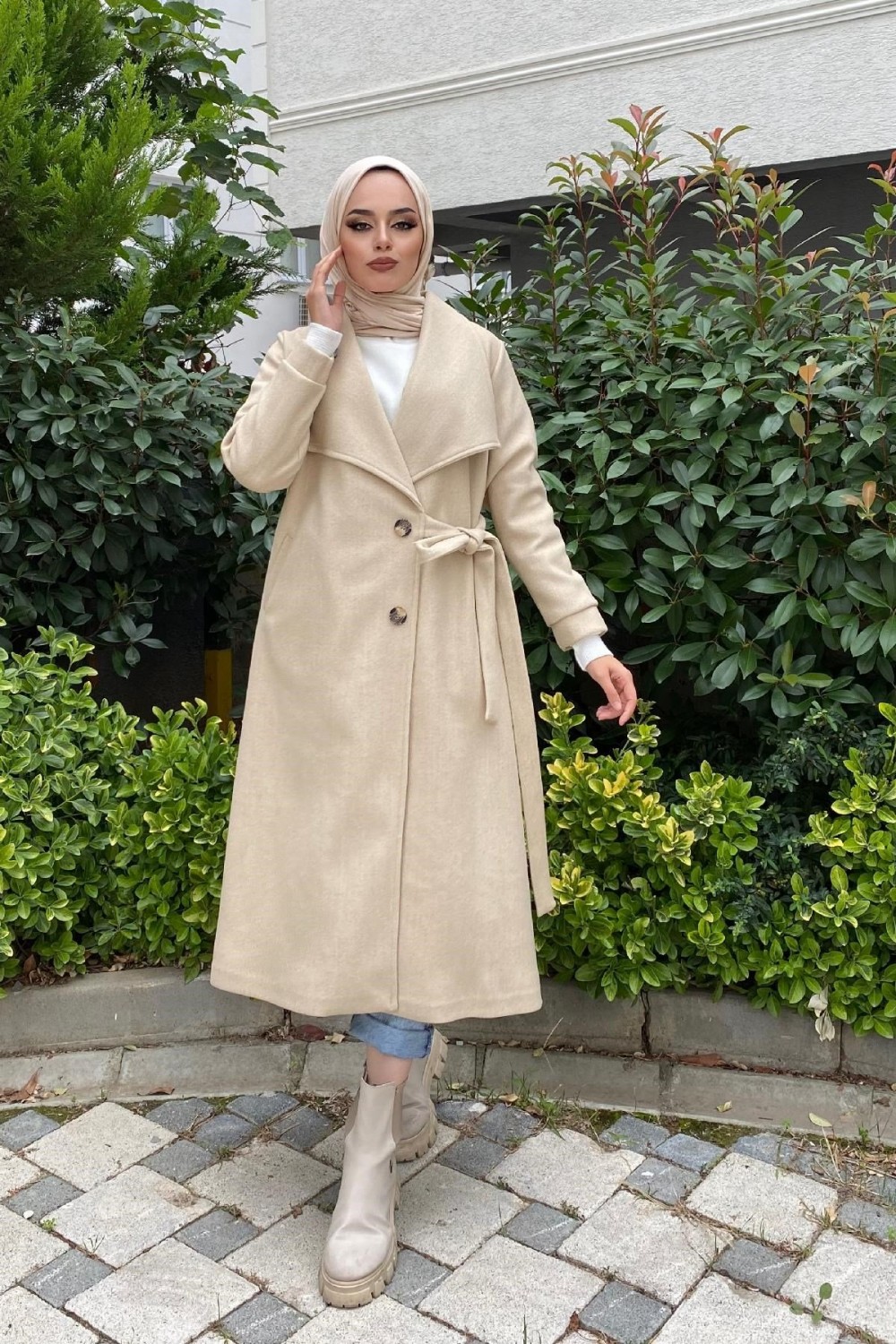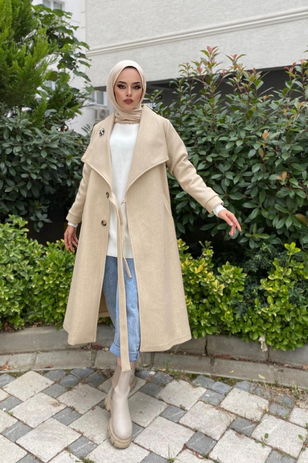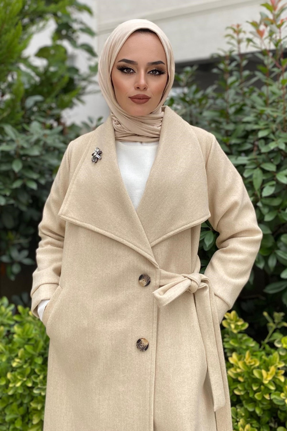 Bronş Detaylı Yandan Bağlamalı Kaşe Kaban Ekru