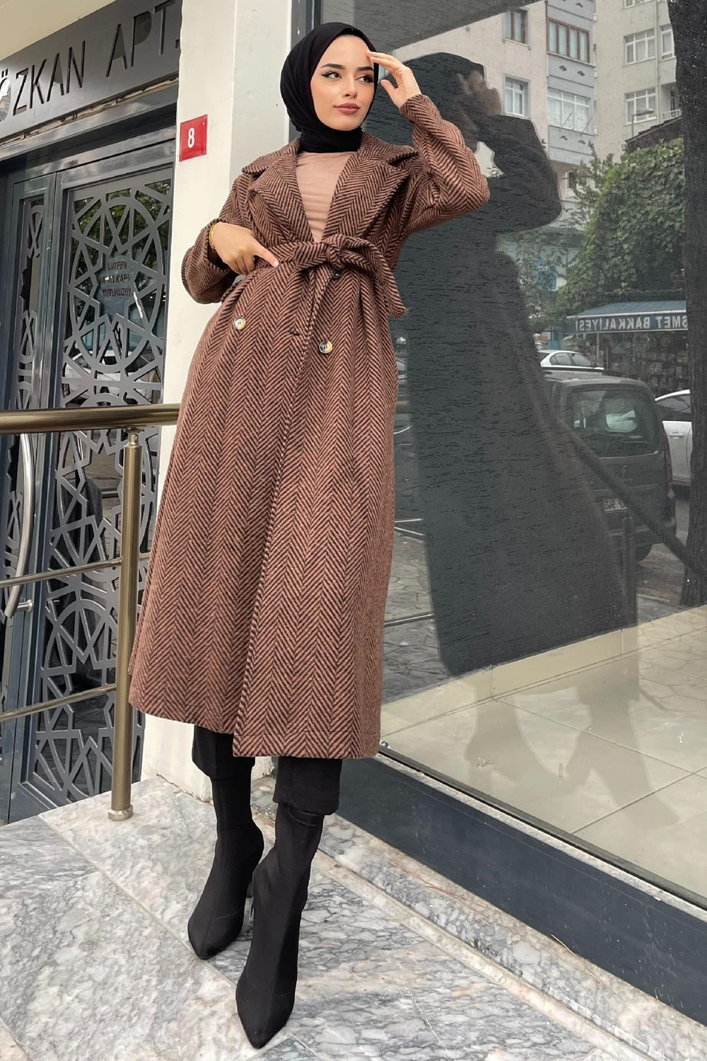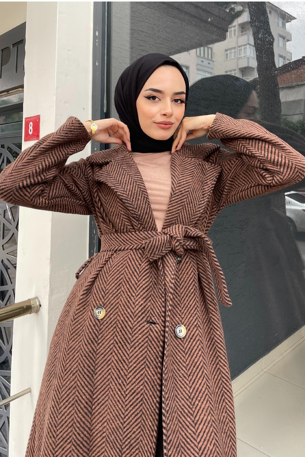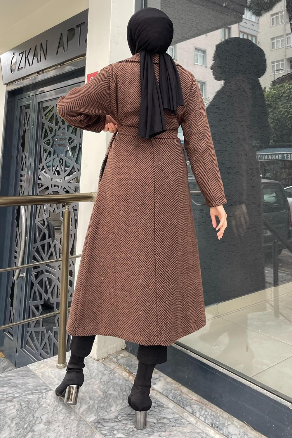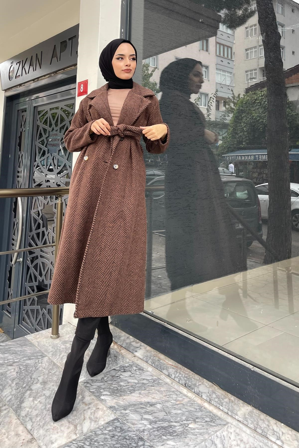 Verev Çizgili Kaşe Kaban Kahverengi