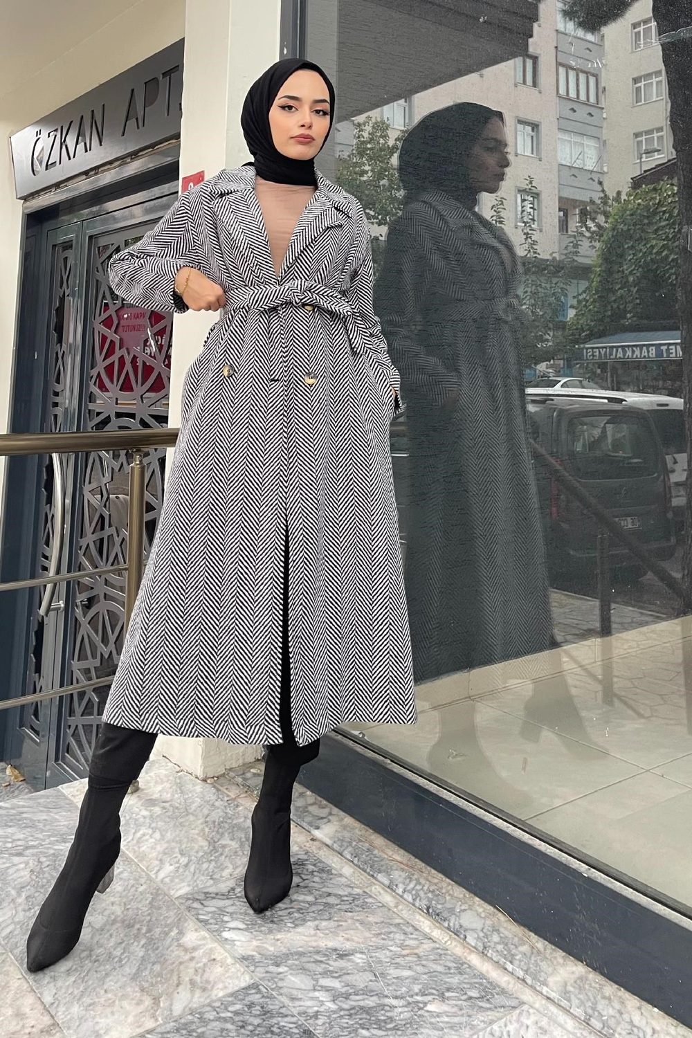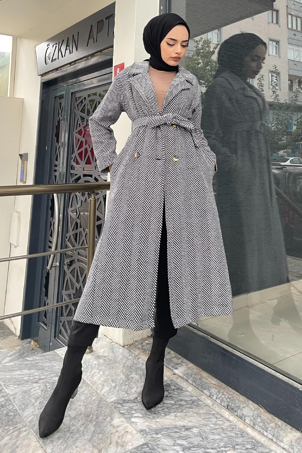 Verev Çizgili Kaşe Kaban Beyaz