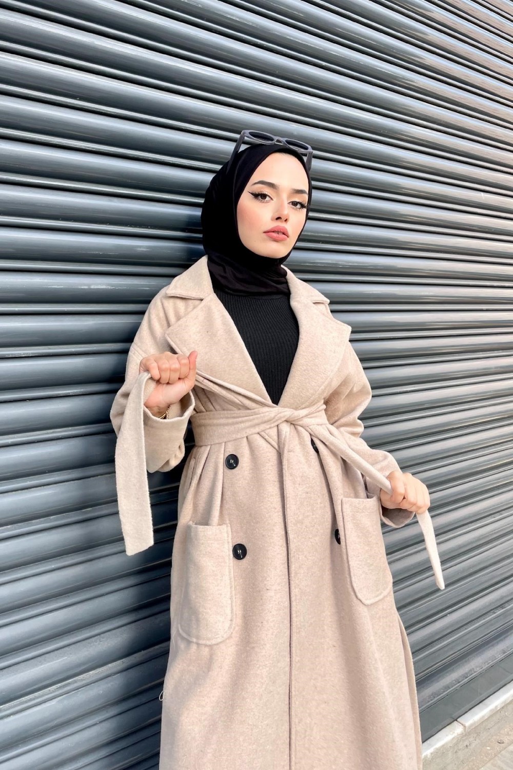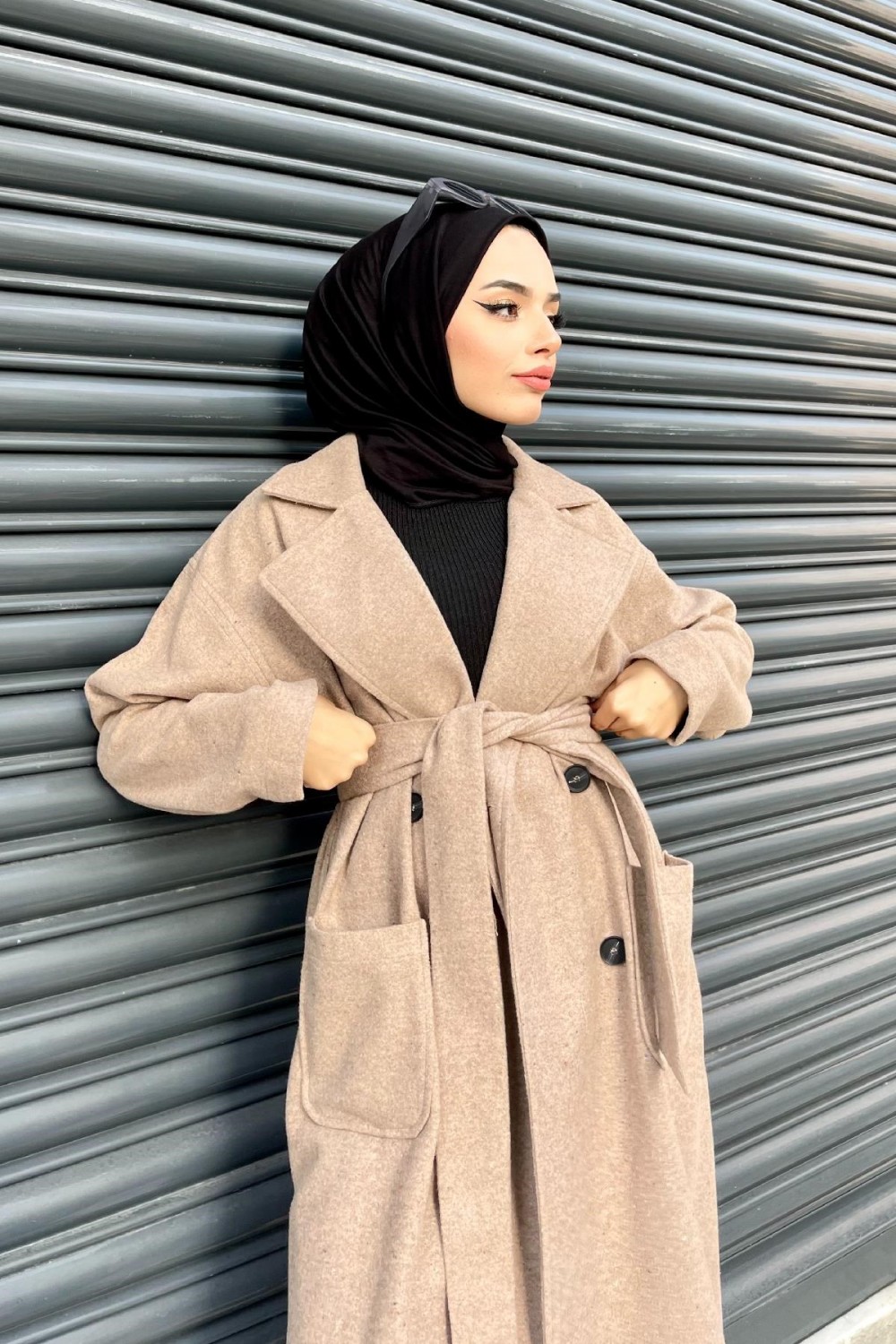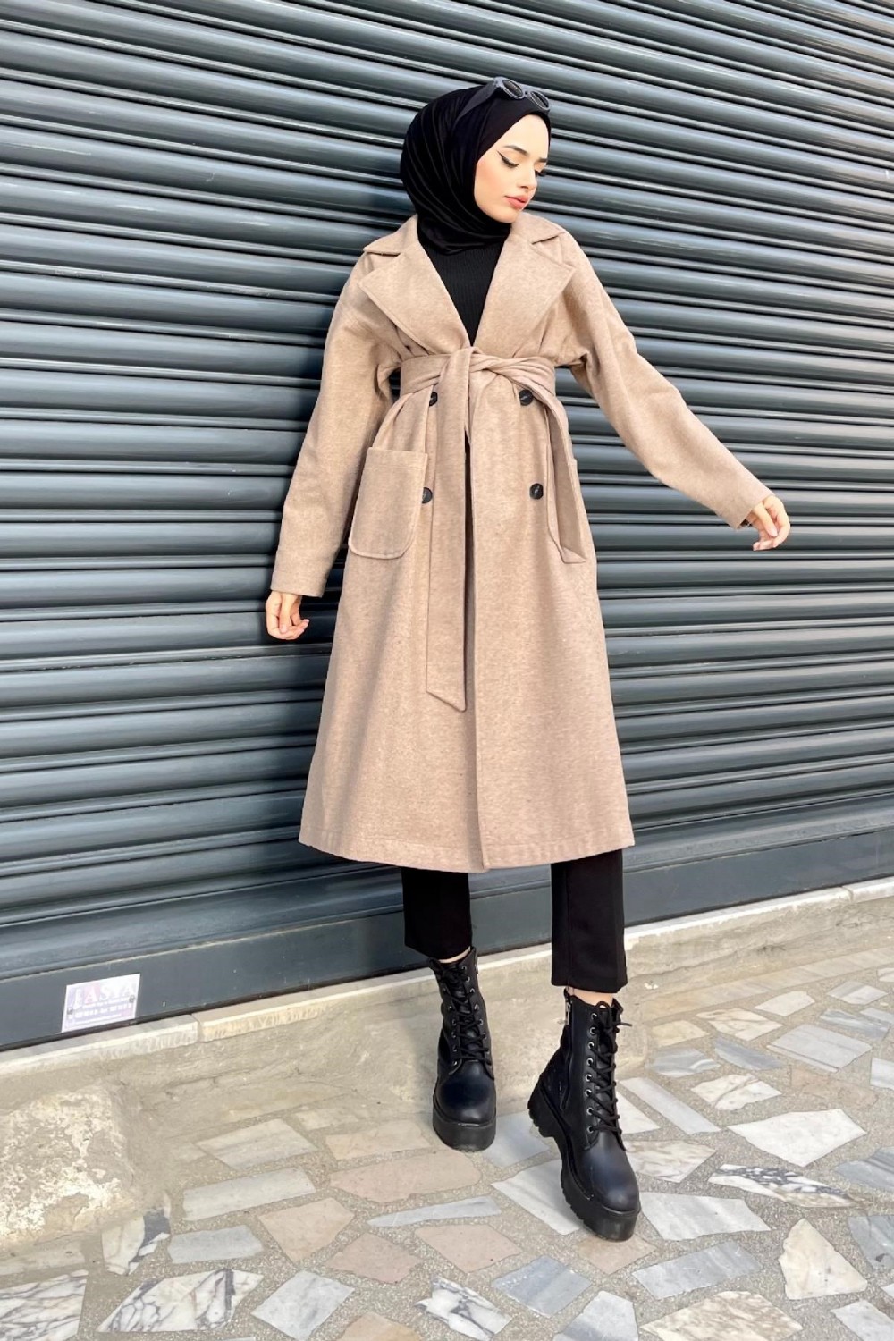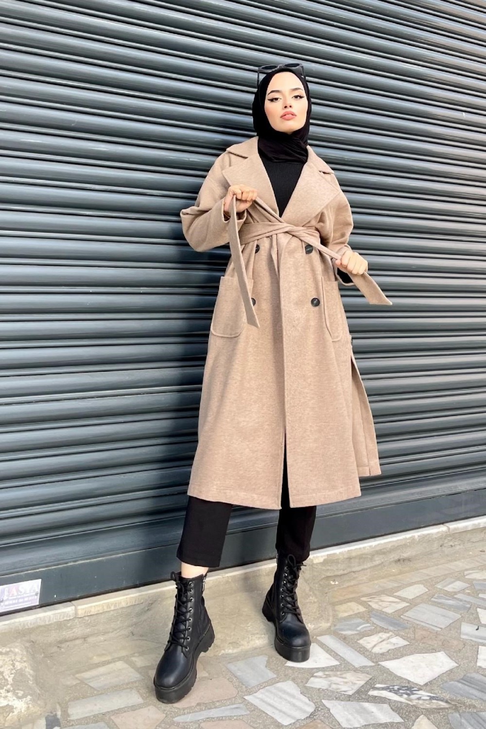 Yanı Düğmeli Kuşaklı Kaban SütlüKahve