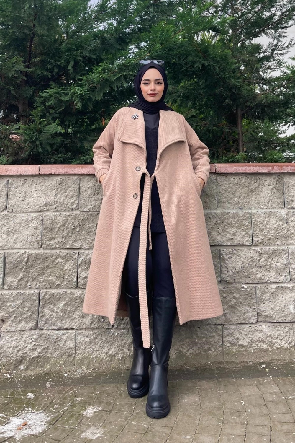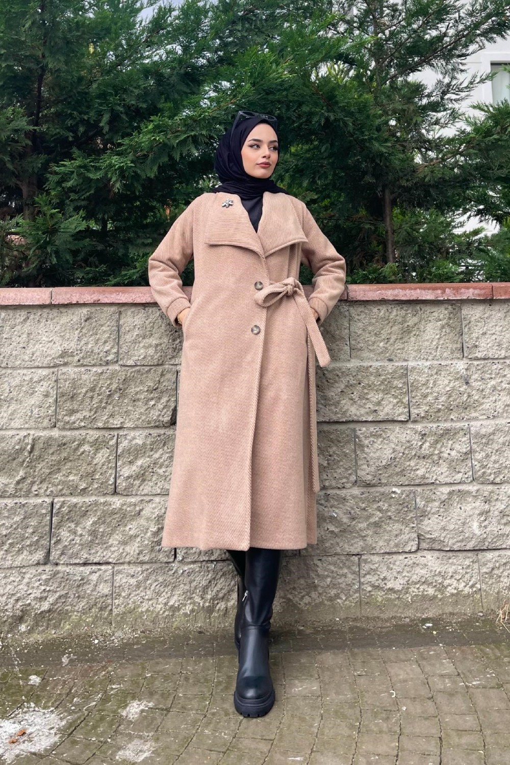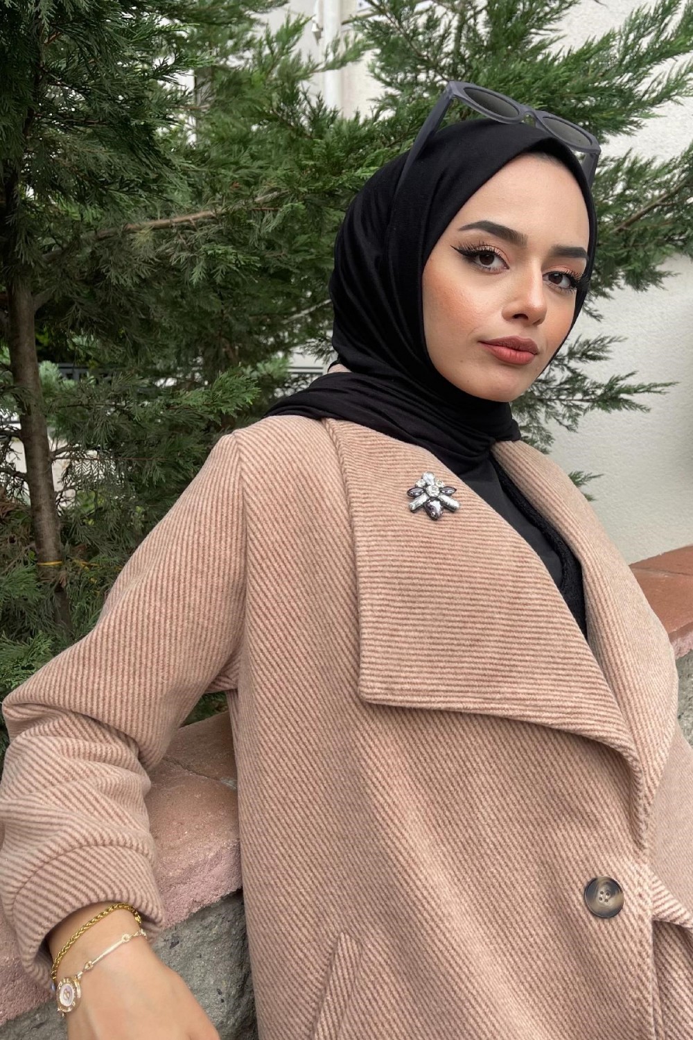 Çizgili Bronşlu Kaşe Kaban SütlüKahve